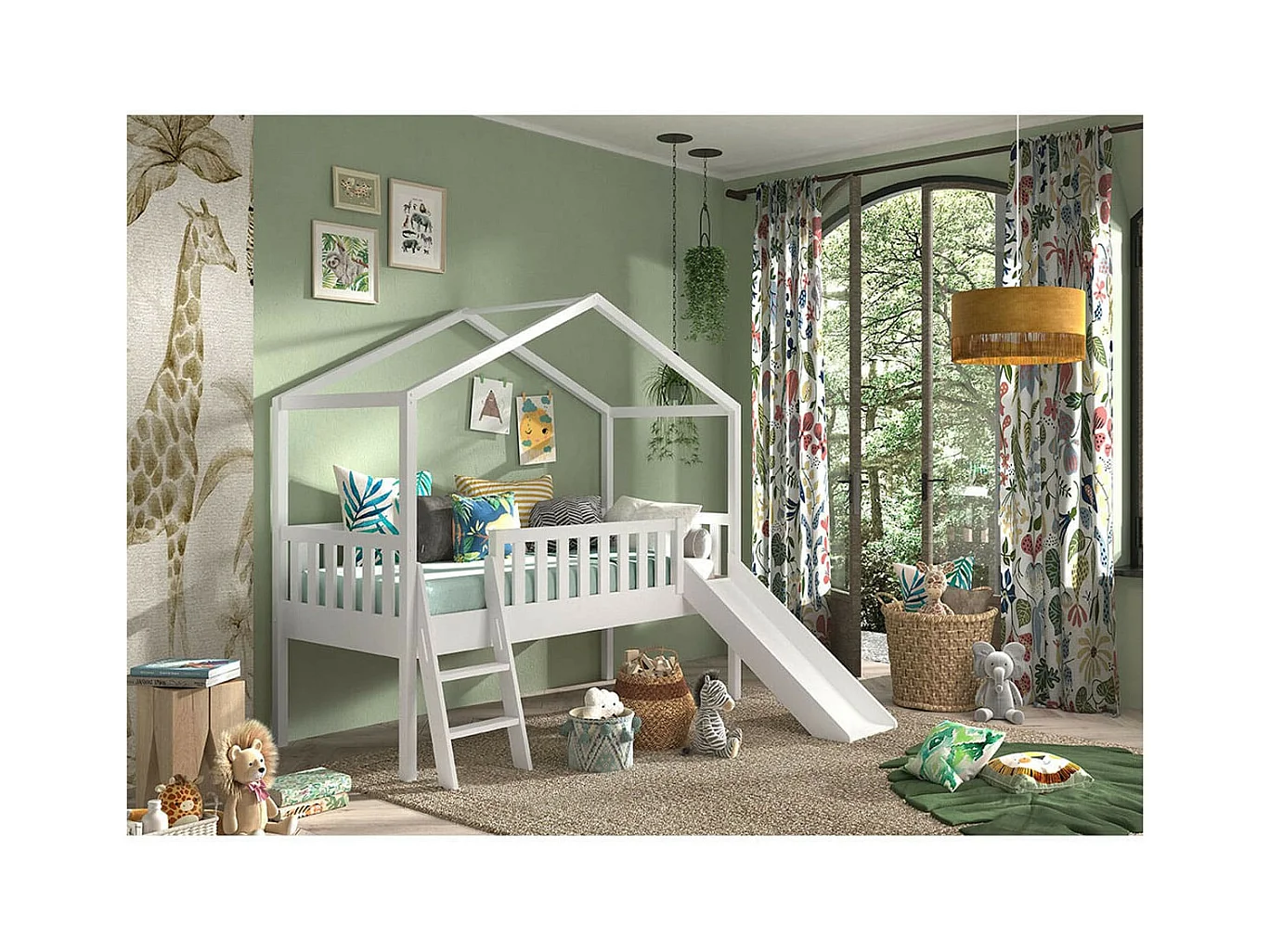 ARKAN - Lit Cabane Surélevé 90x200cm Pin Blanc avec Toboggan