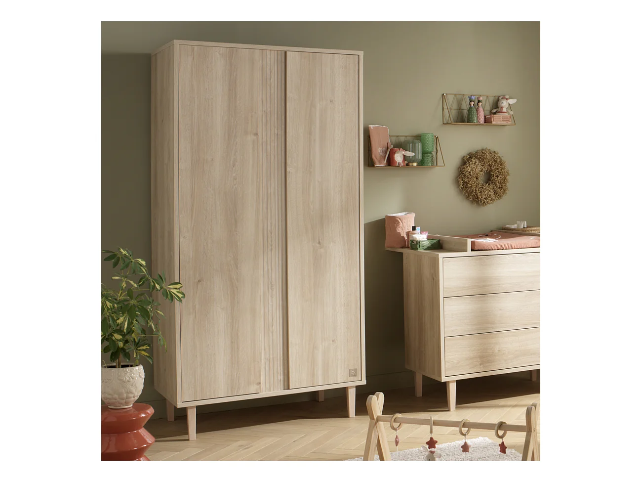 Armoire 2 portes avec détail imitation bois texturé et pieds bois PALOMA - Sauthon