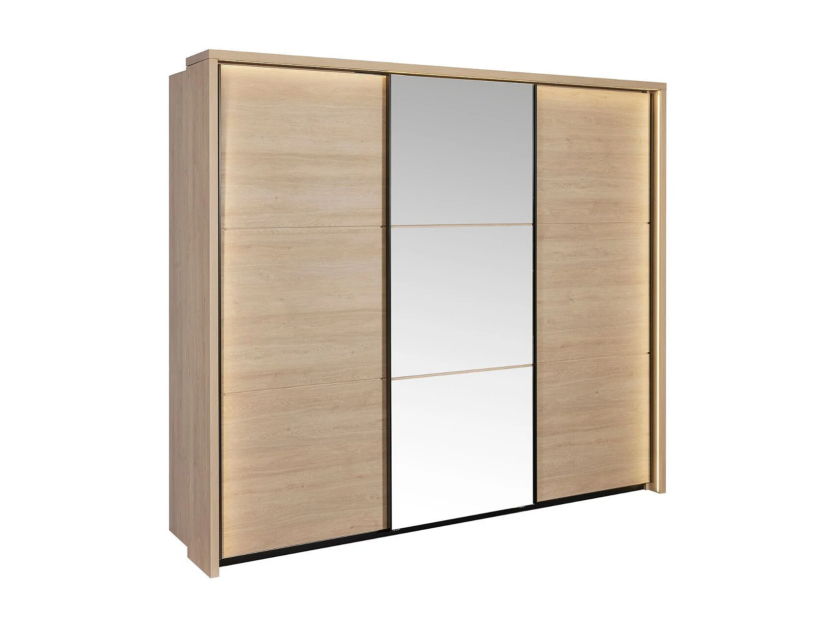 Armoire 3 portes coulissantes avec miroir et leds aspect bois et noir - LUDY