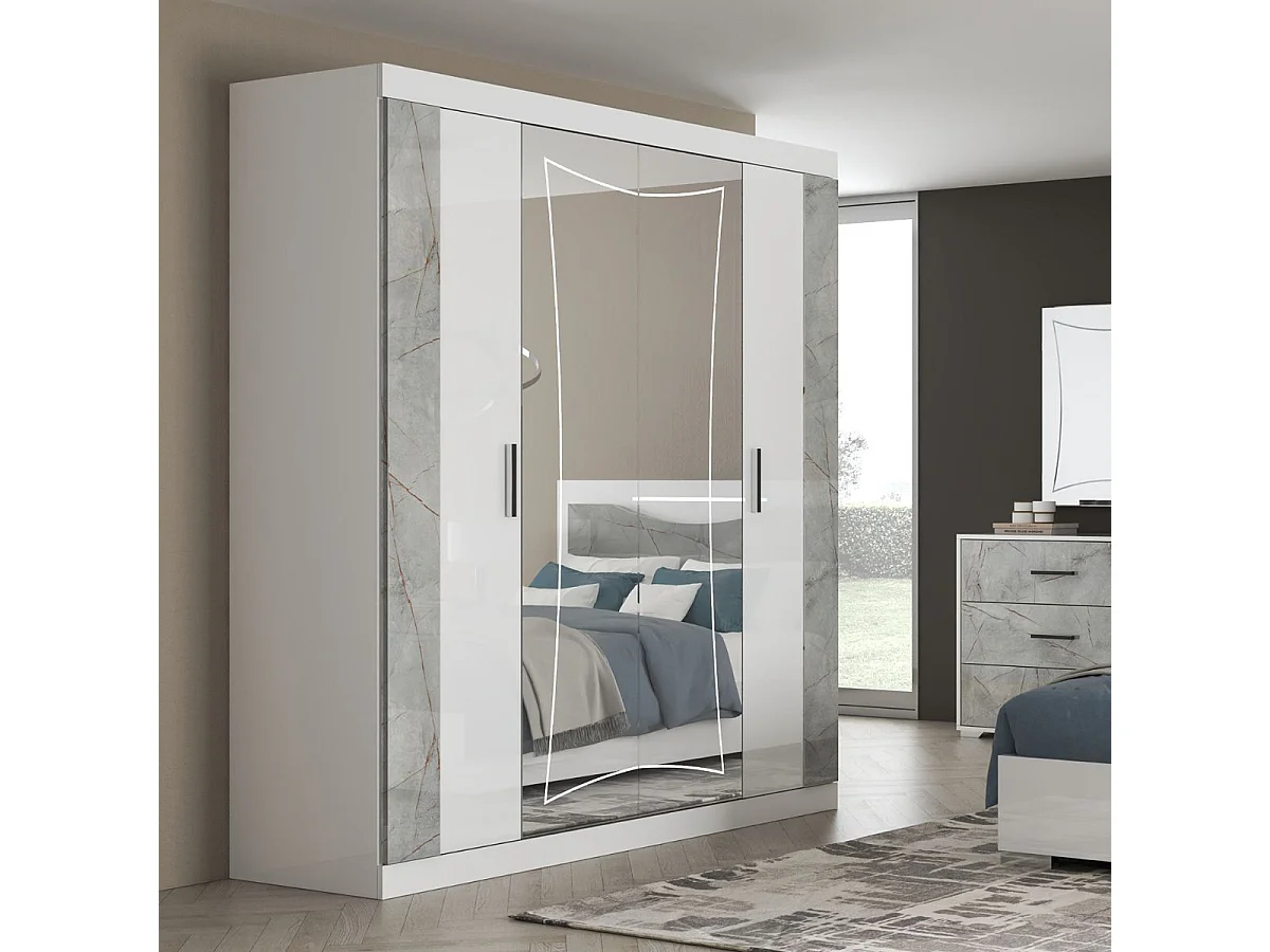 Armoire 4 portes avec 2 portes miroir centrales laqué blanc et imitation marbre - GENESIS