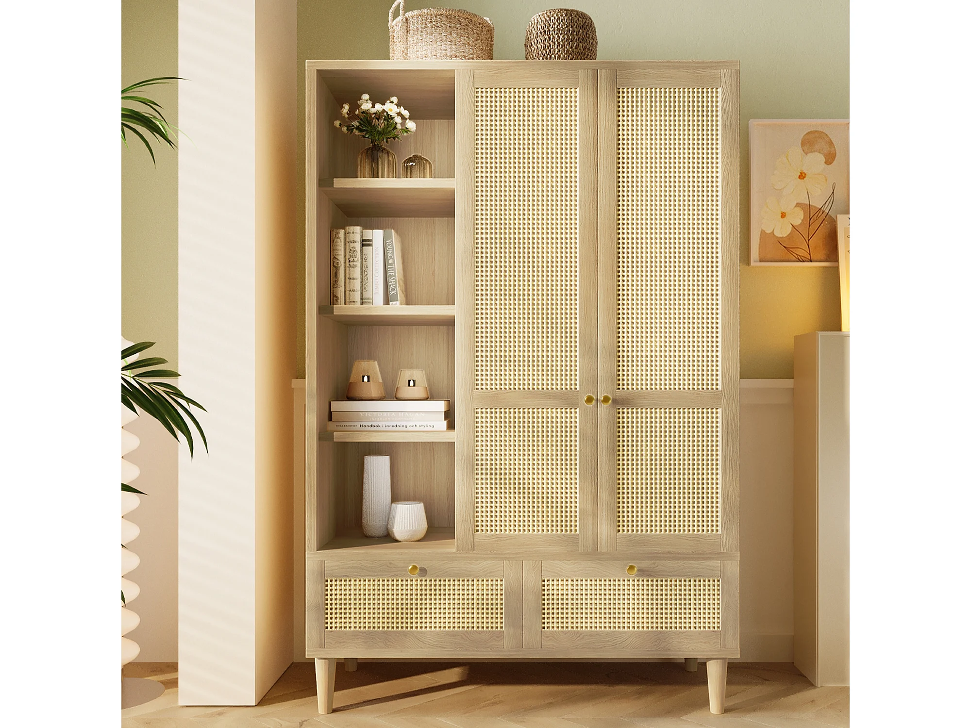 Armoire 180x120x50 cm, 2 portes, étagères ouvertes et penderie, 2 tiroirs, fermeture soft close, bois, chêne