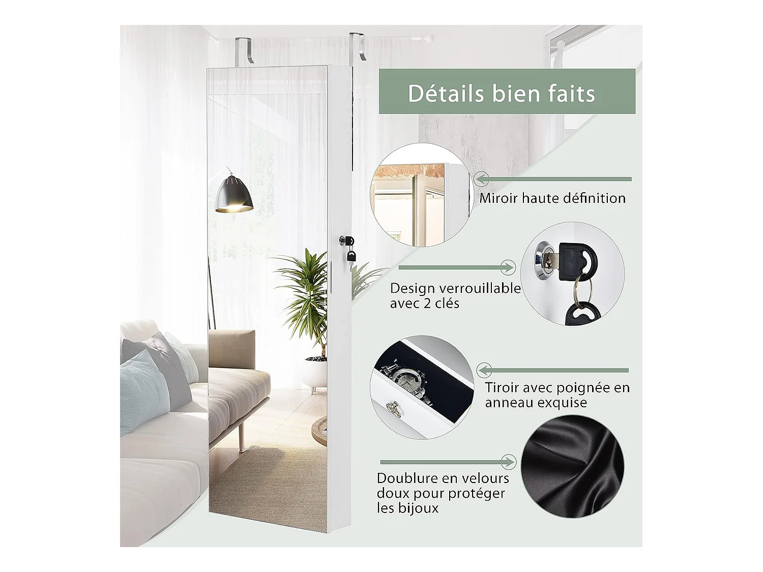 Armoire à bijoux verrouillable pour portes à suspendre avec miroir - H120 cm