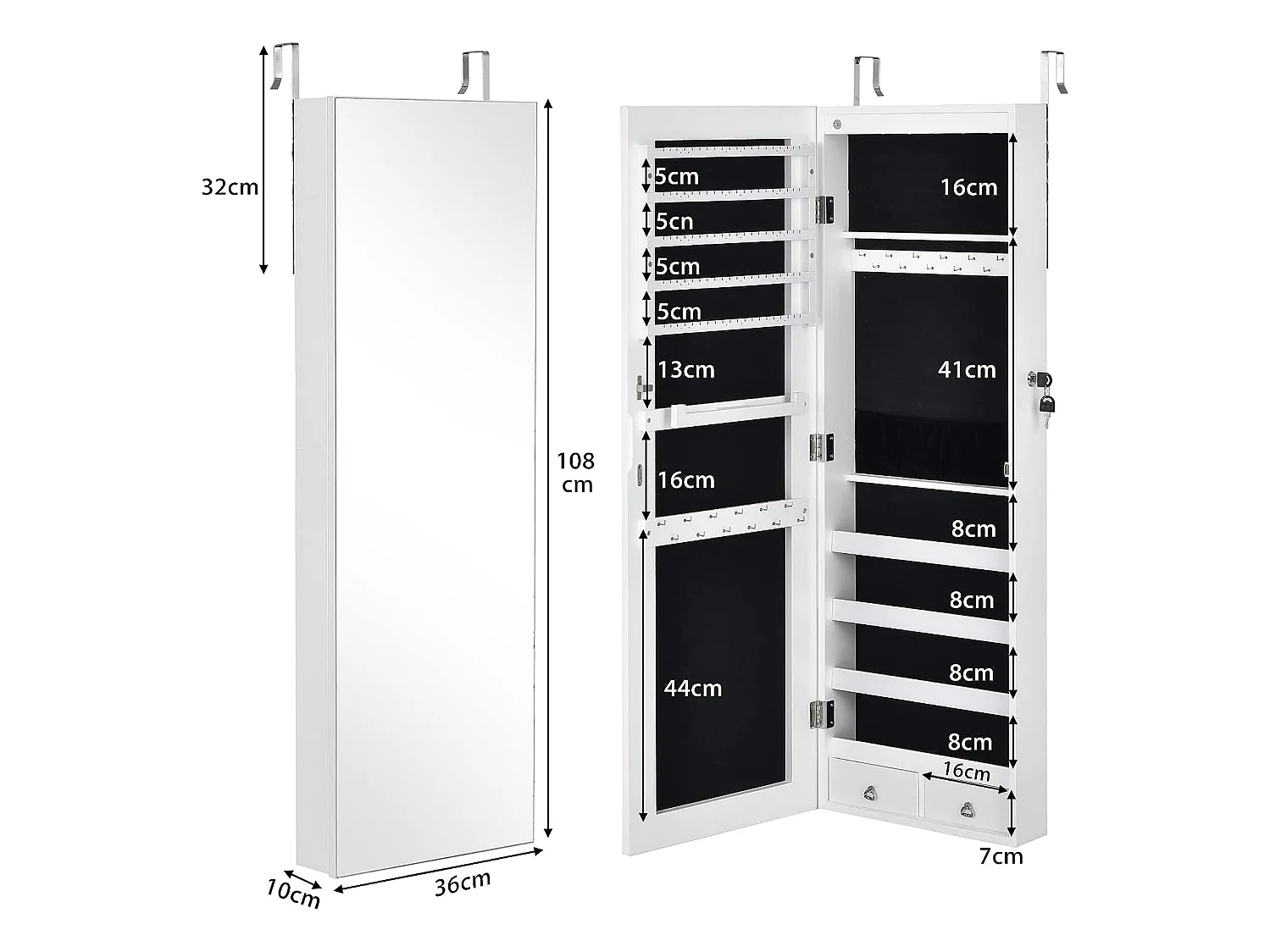Armoire à Bijoux SucceBuy, avec Miroir Verrouillable, 119,5 cm, Montage Mural/sur Porte, Blanche