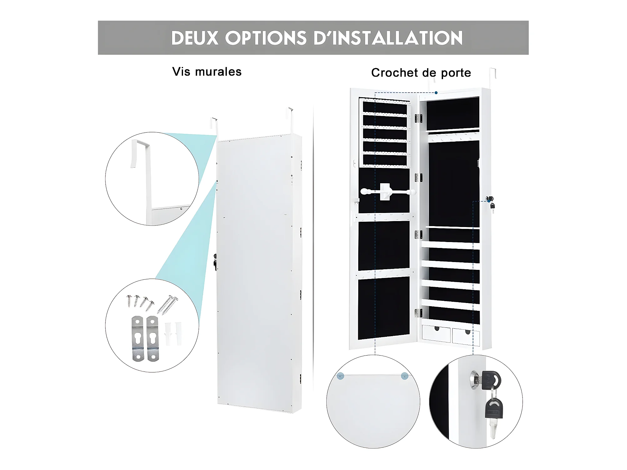 Armoire à bijoux miroir à suspendre 2 en 1 - éclairage LED intérieur, verrouillable, multi-rangement - blanc