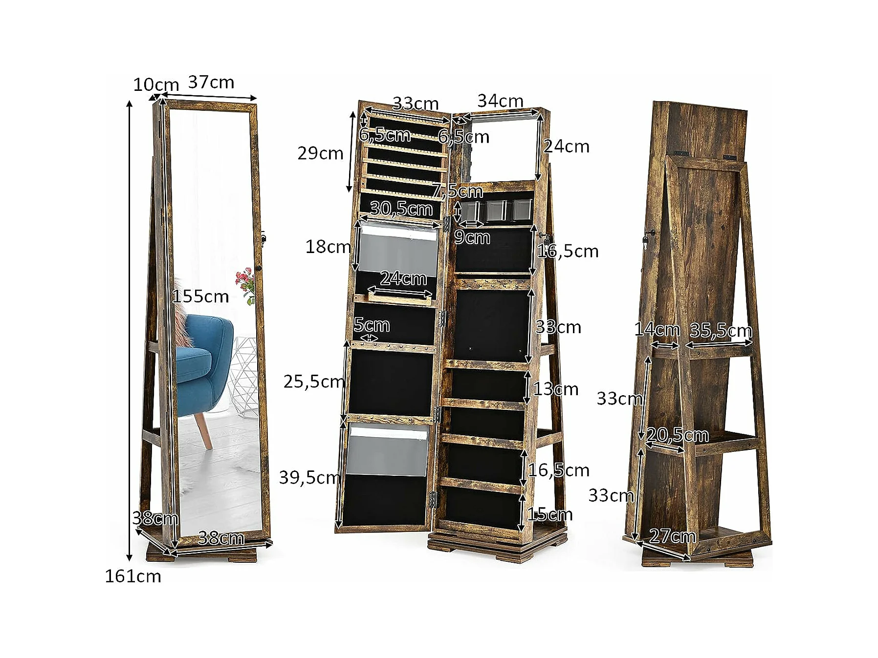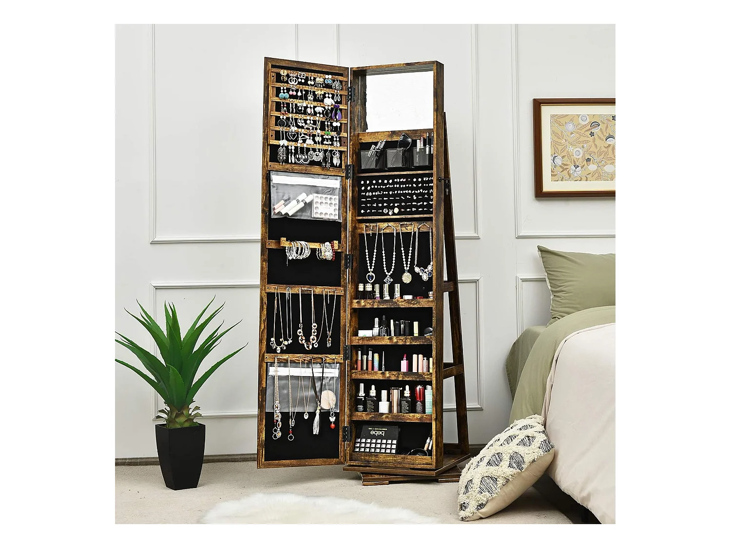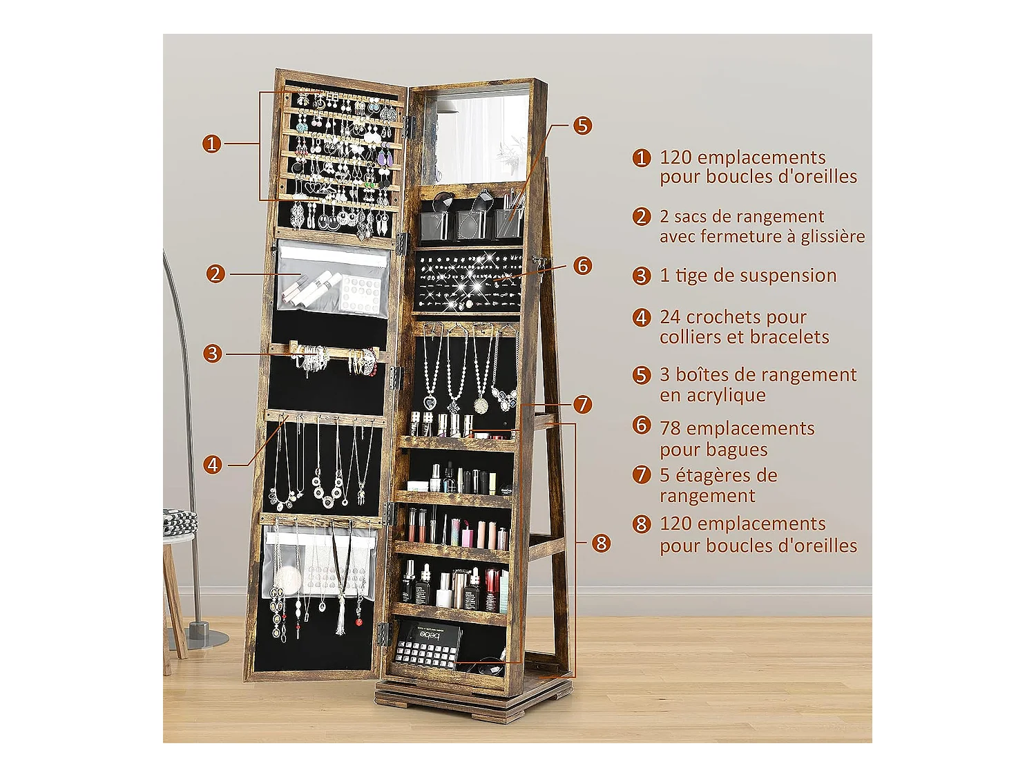 Armoire à Bijoux Pivotante à 360 Degrés, Organisateur de Bijoux sur Pieds, avec Grand Miroir Psyché et Etagère de Rangement à L’Arrière (Brun Rustique)