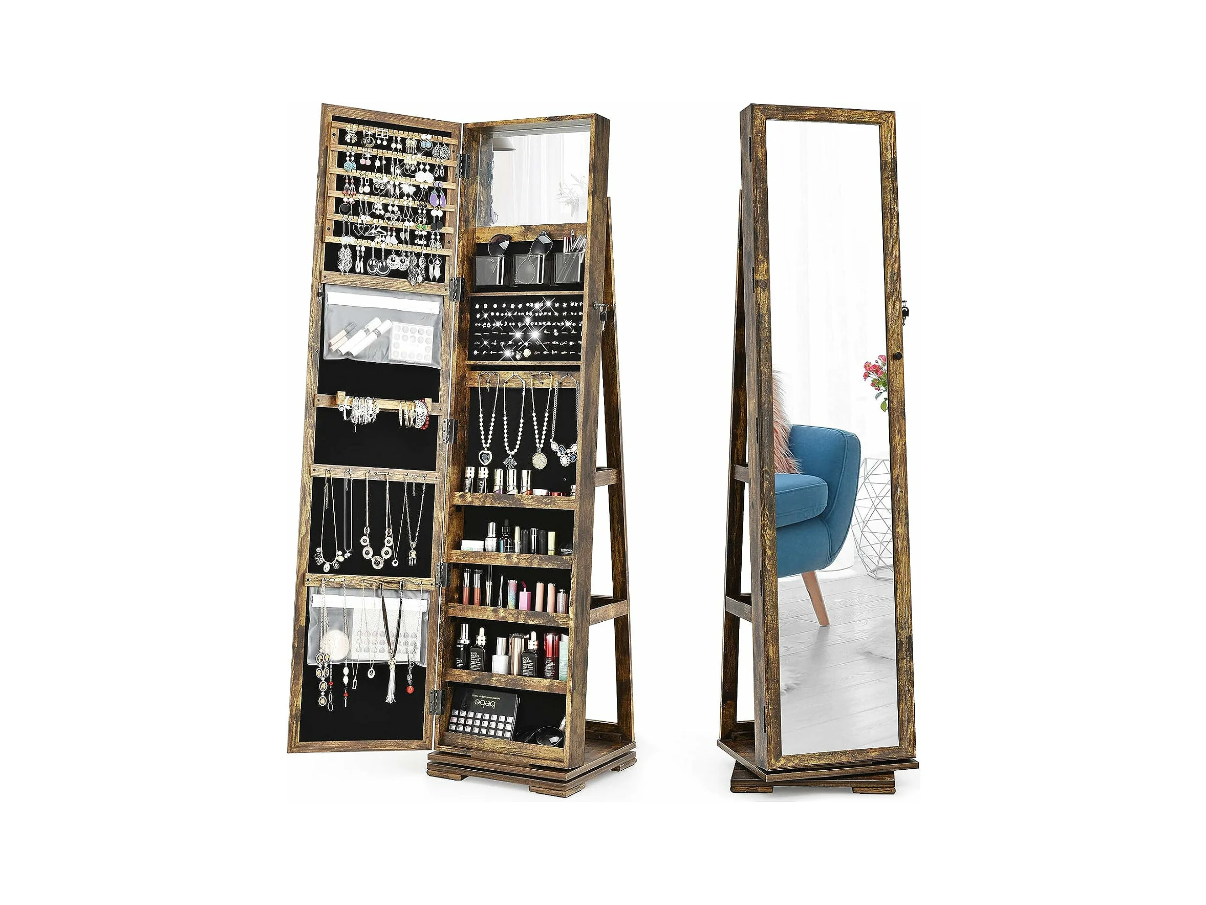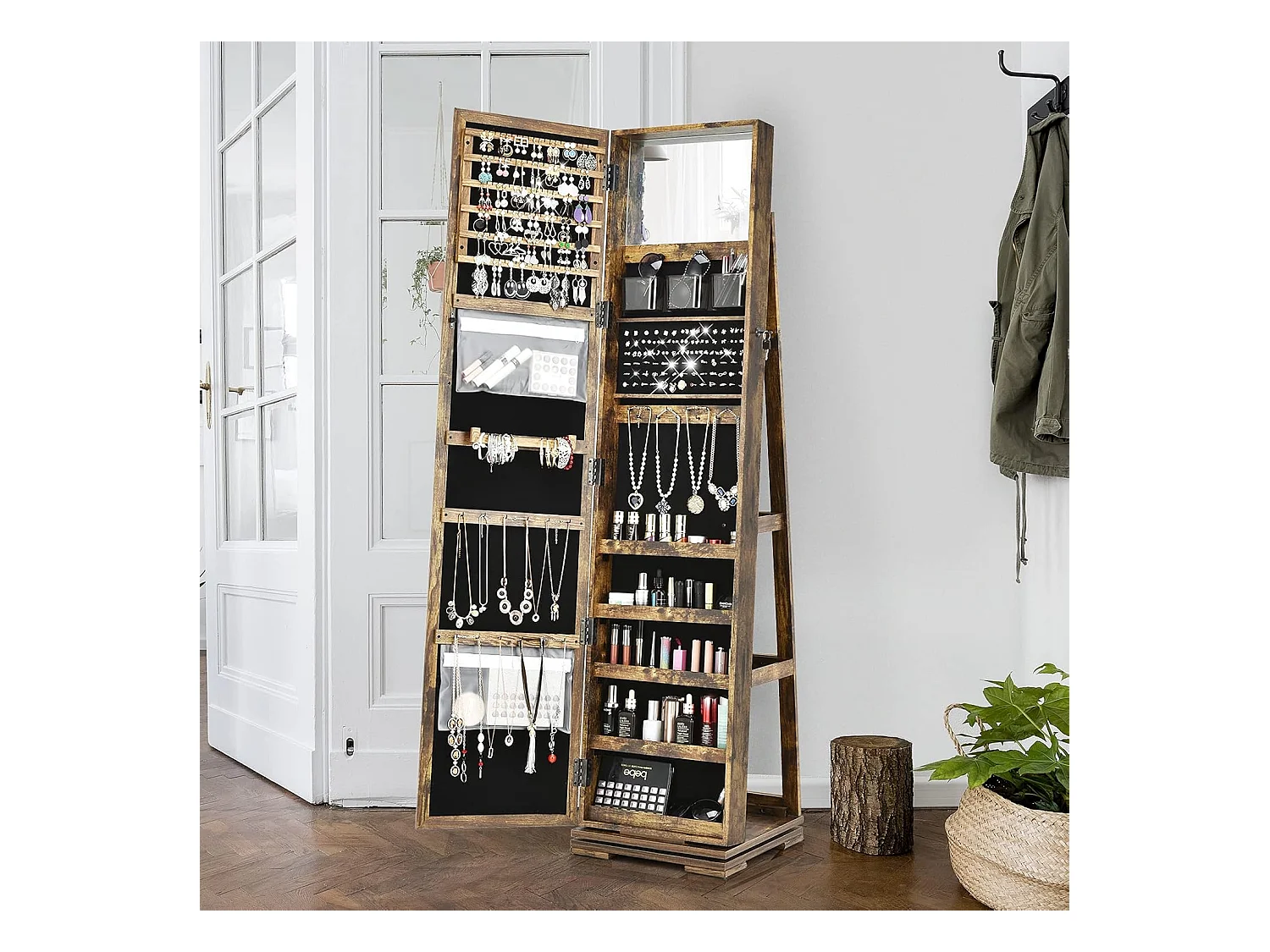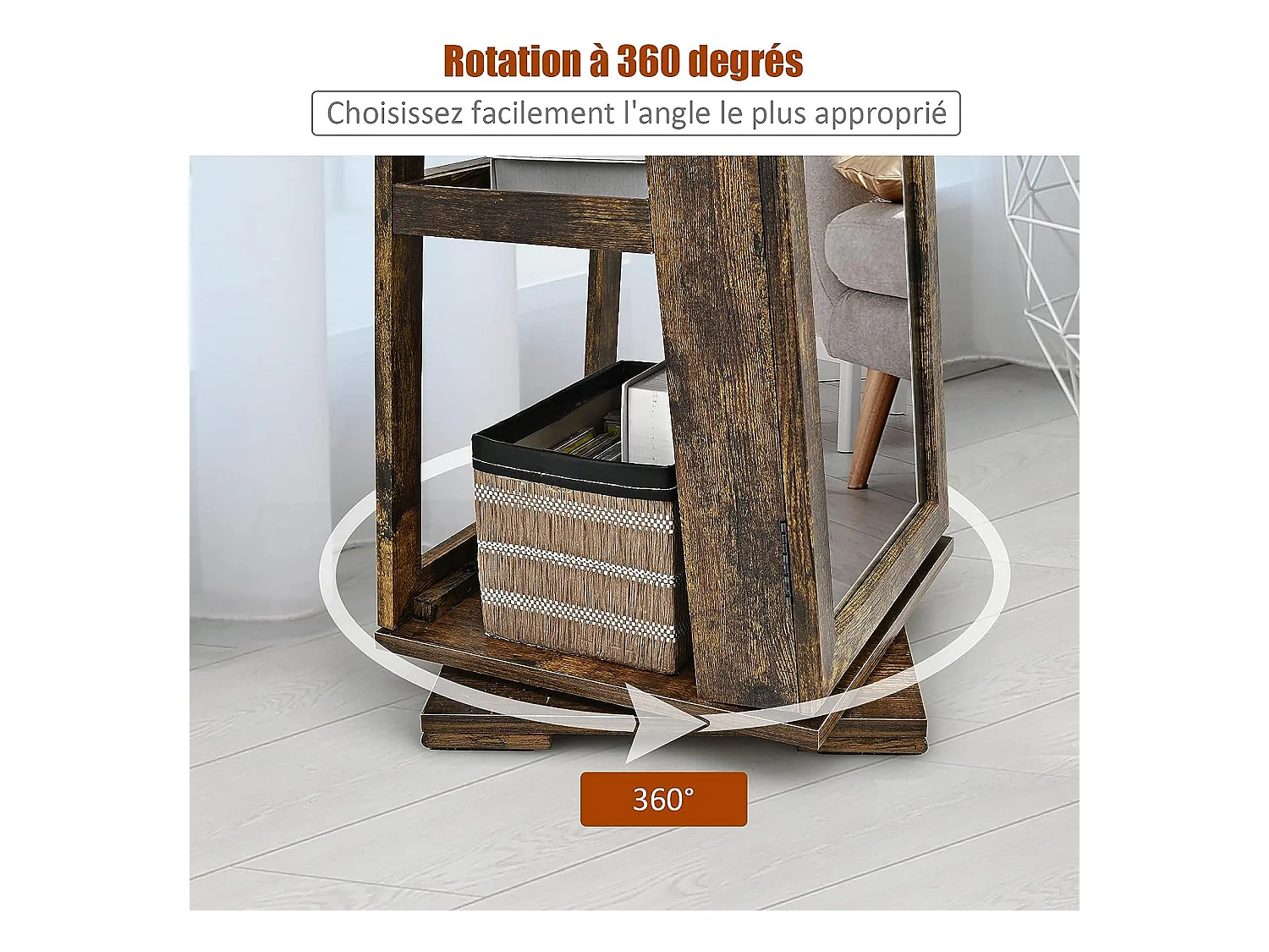 Armoire à Bijoux Pivotante à 360 Degrés, Organisateur de Bijoux sur Pieds, avec Grand Miroir Psyché et Etagère de Rangement à L’Arrière (Brun Rustique)