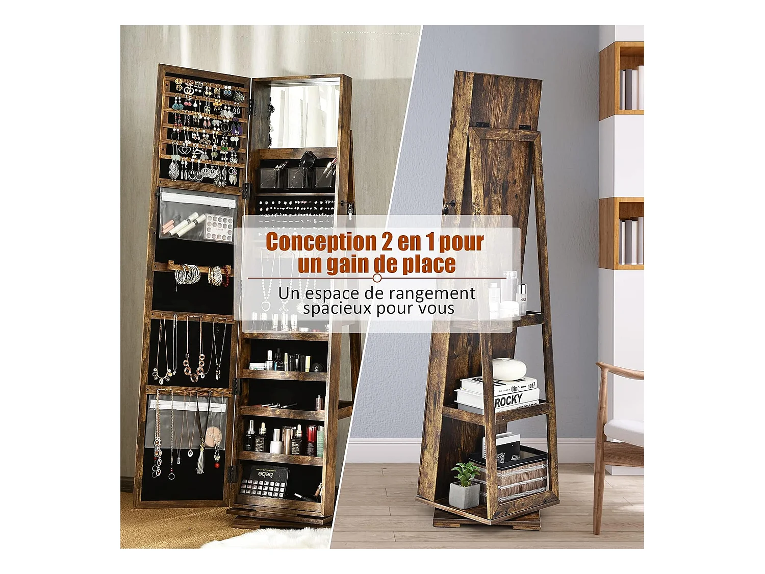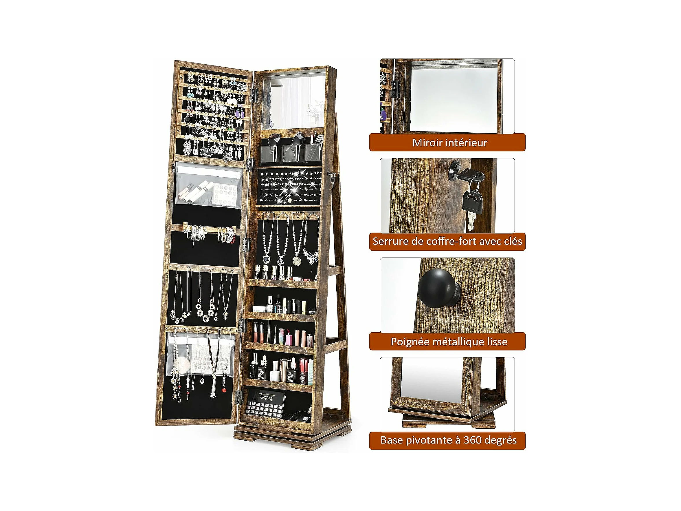 Armoire à bijoux pivotante verrouillable avec miroir - armoire bijoux multi-rangement - MDF effet bois vieilli