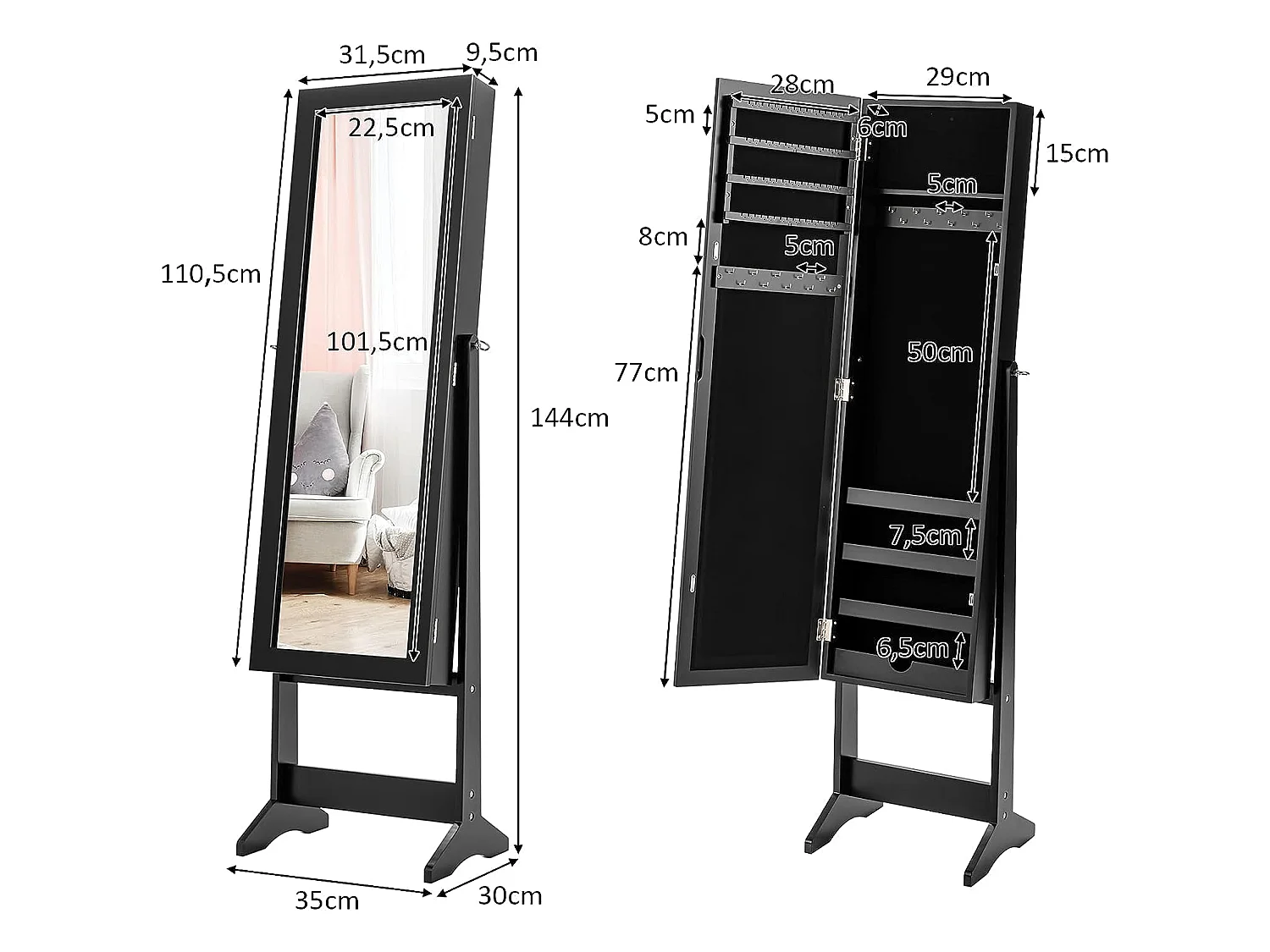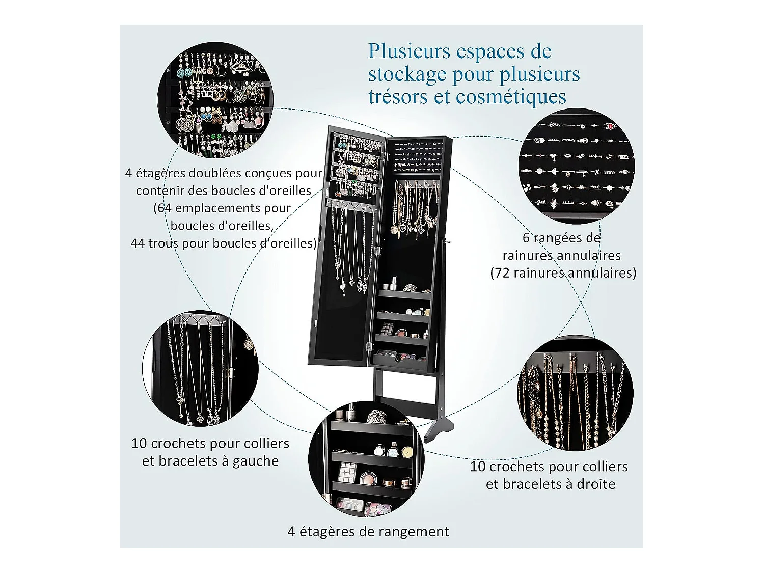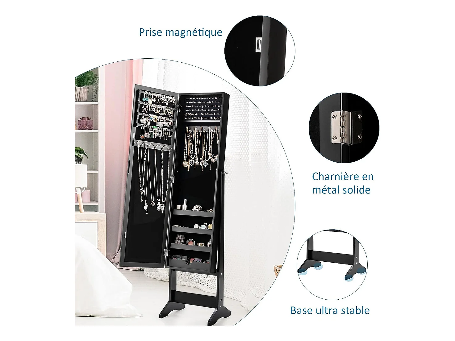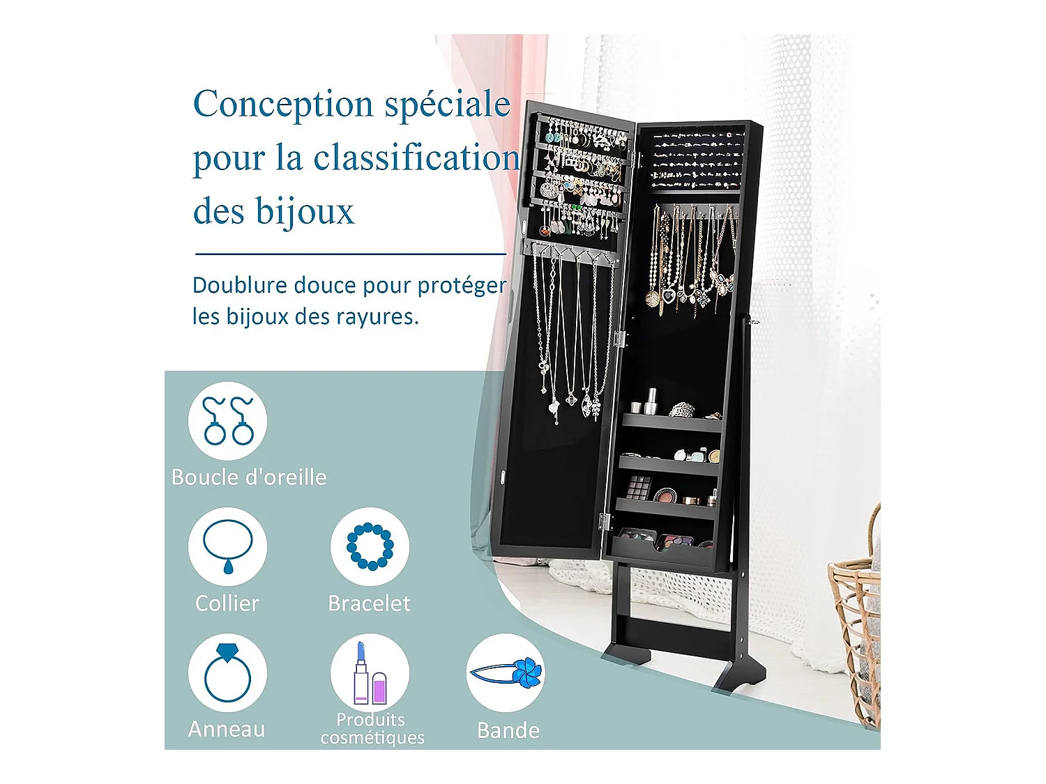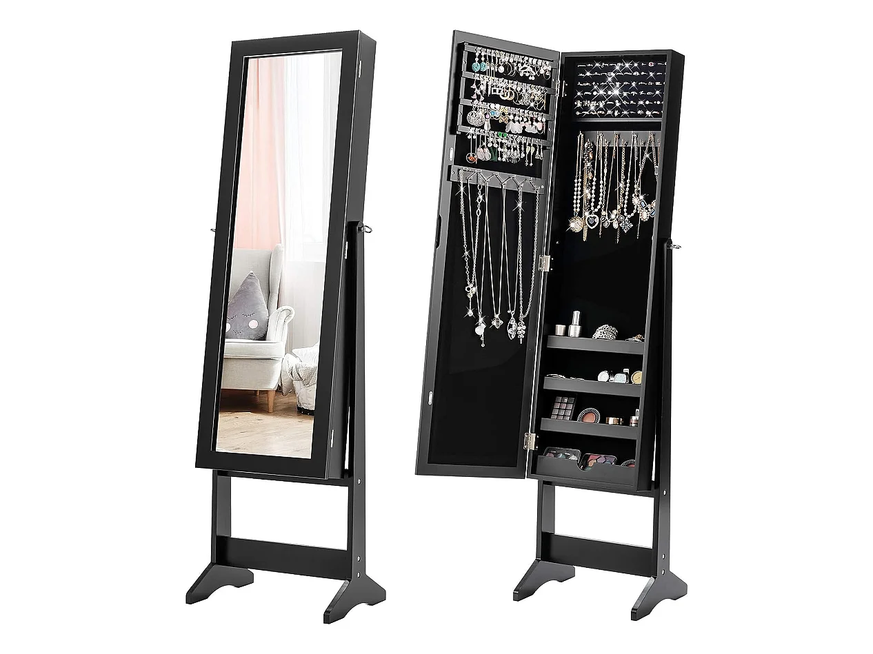 Armoire à bijoux sur pied avec miroir coffre à bijoux, armoire de rangement cosmétiques
