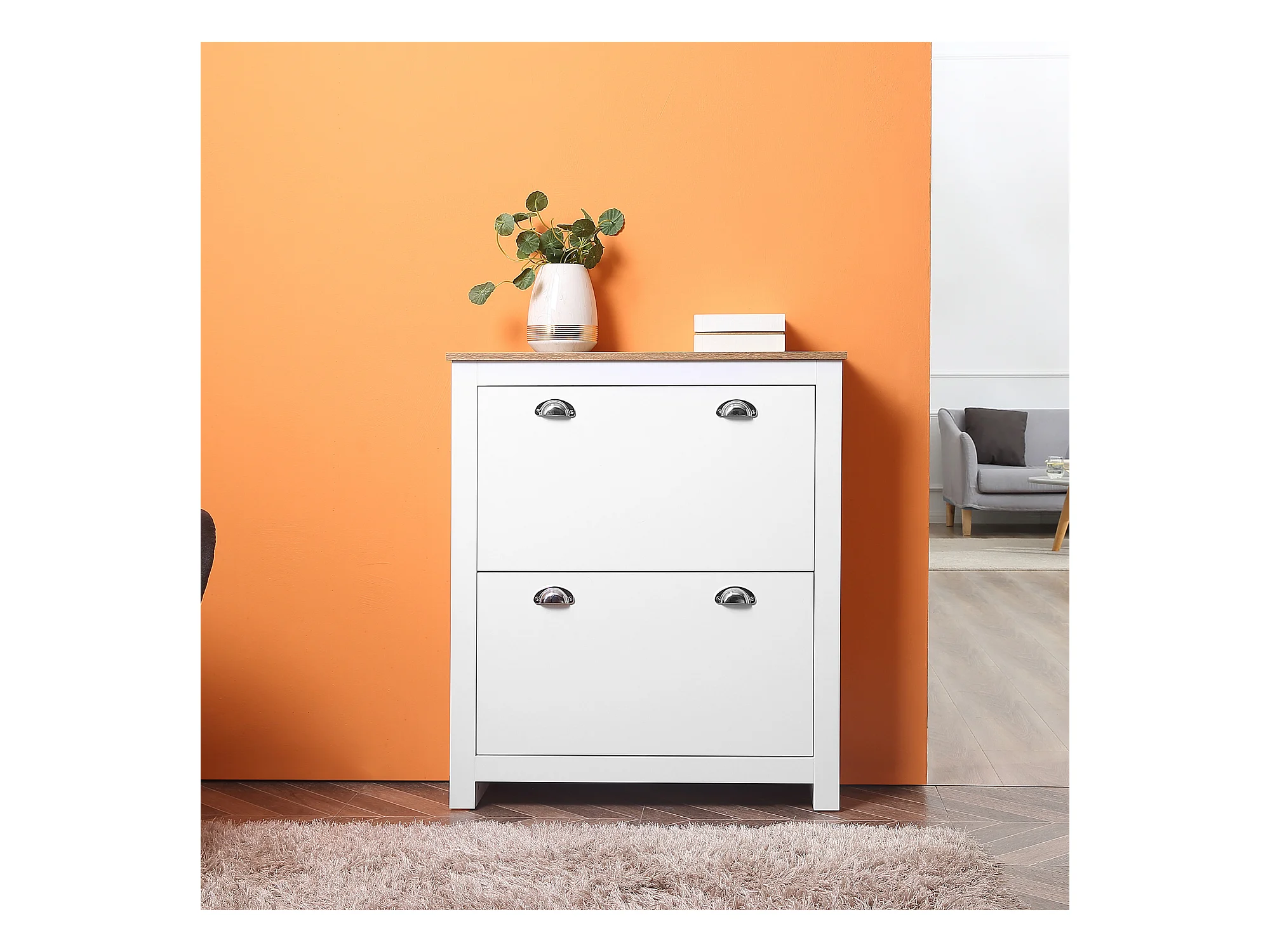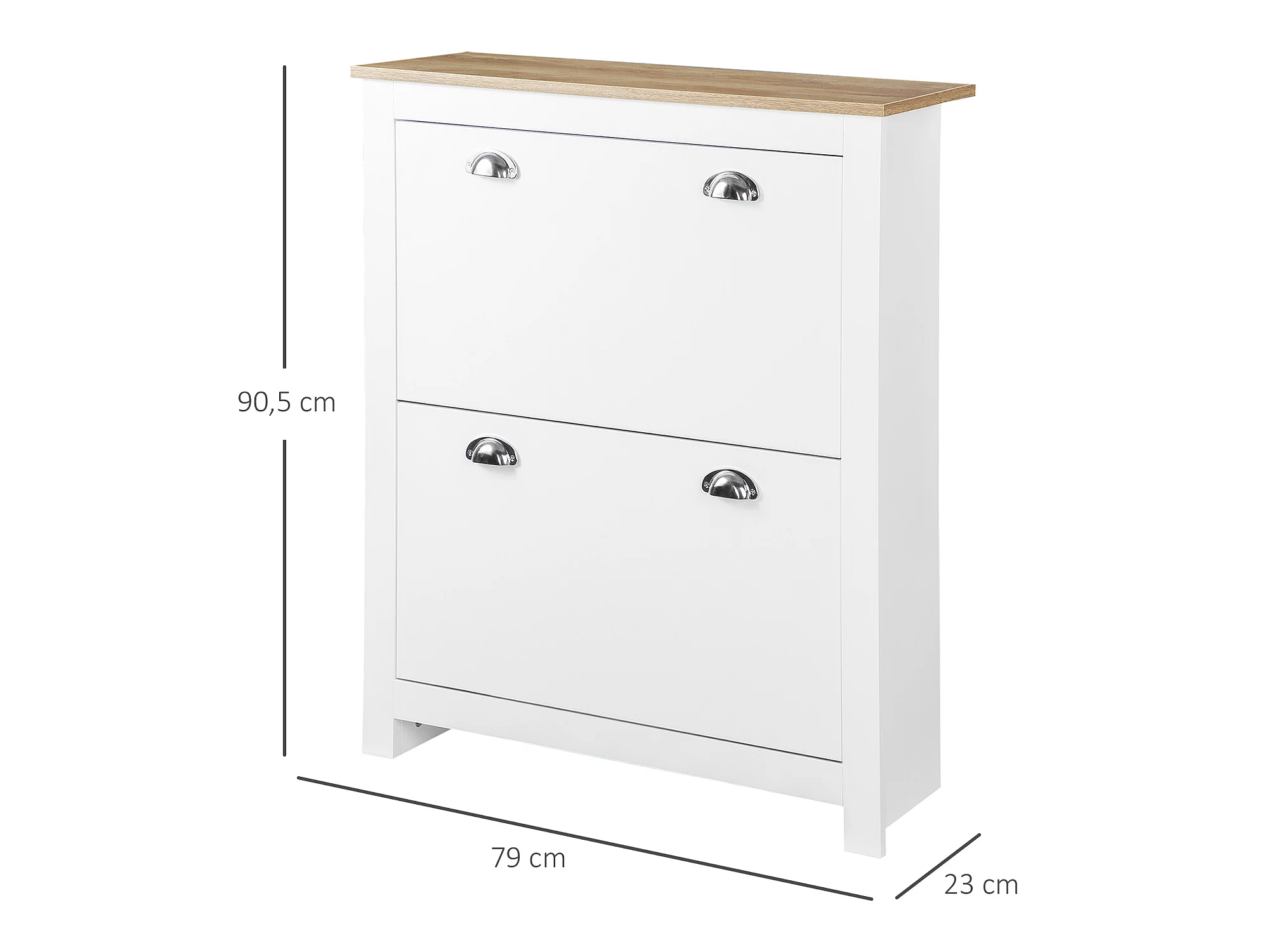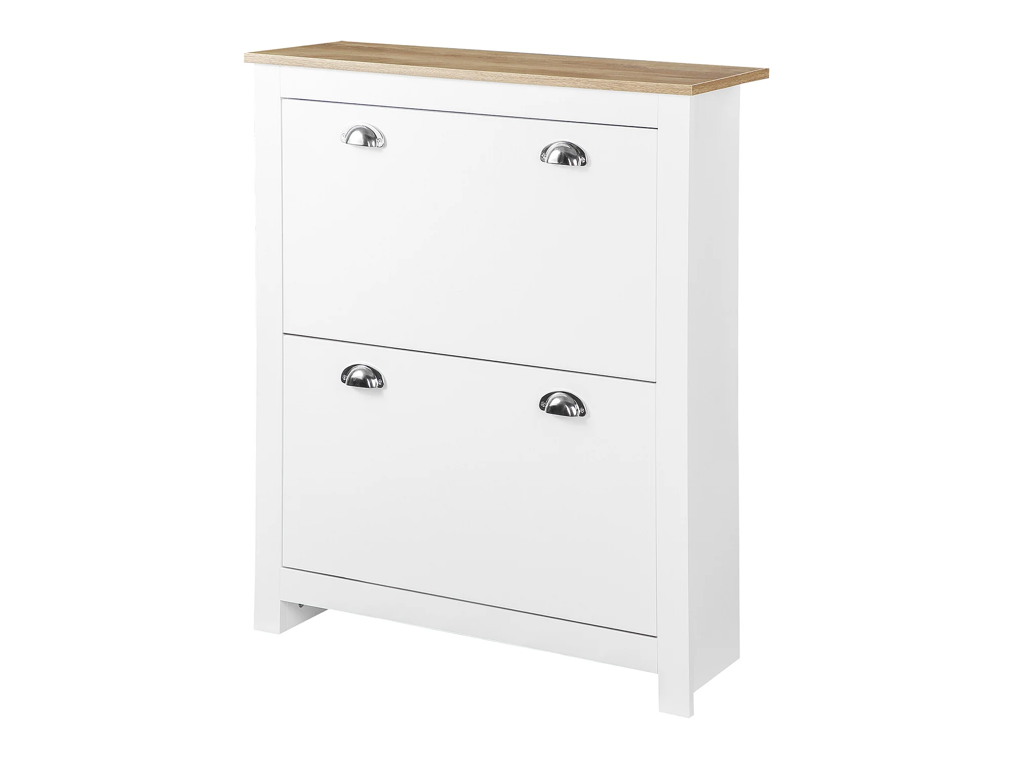 Armoire à chaussures 2 portes abattantes 2 compartiments poignées coquilles métal MDF blanc chêne clair