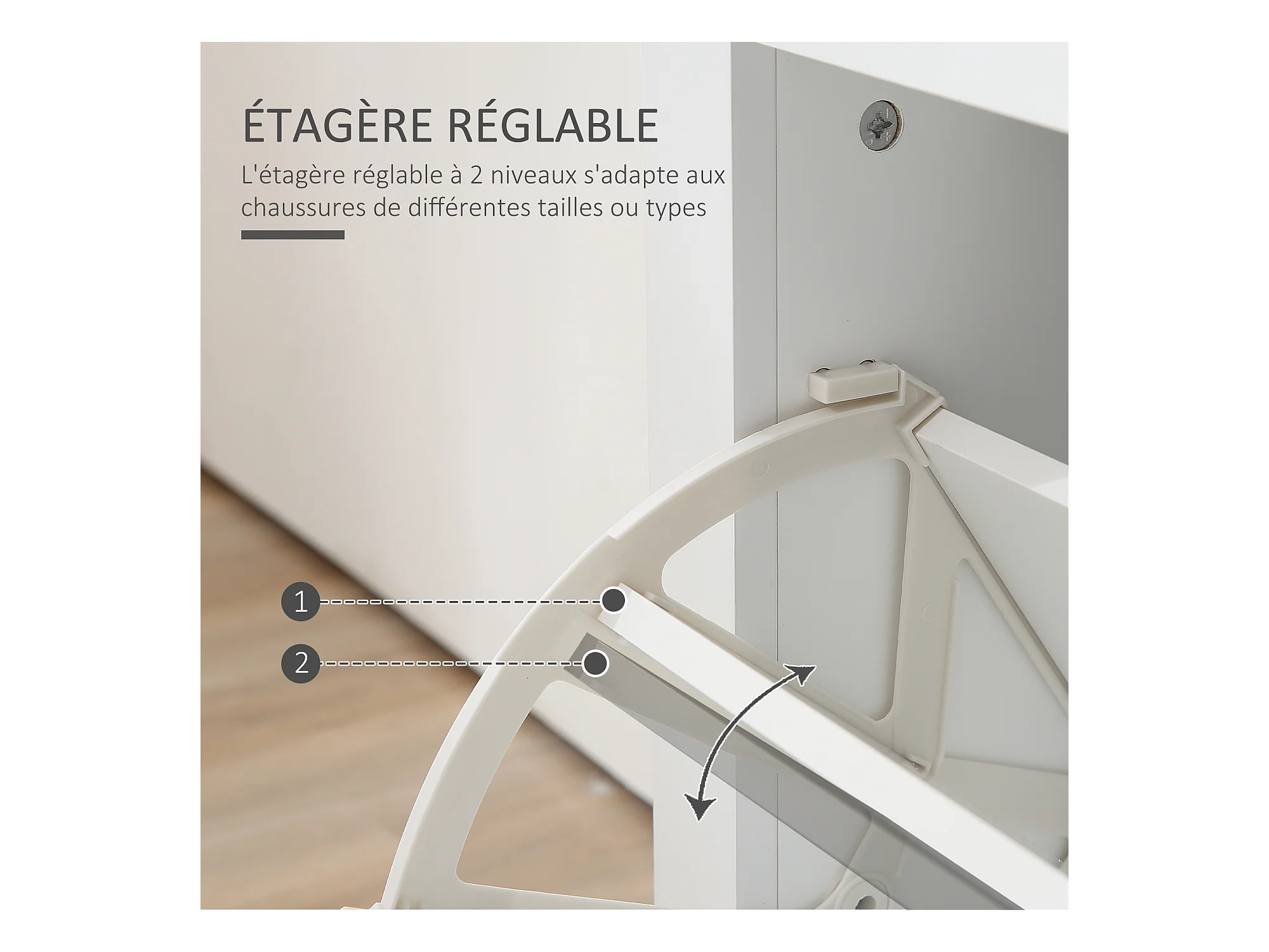 Armoire à chaussures organisateur de luxe pour chaussures 2 portes abattantes 2 compartiments, tiroir, étagère verre panneaux particules blanc