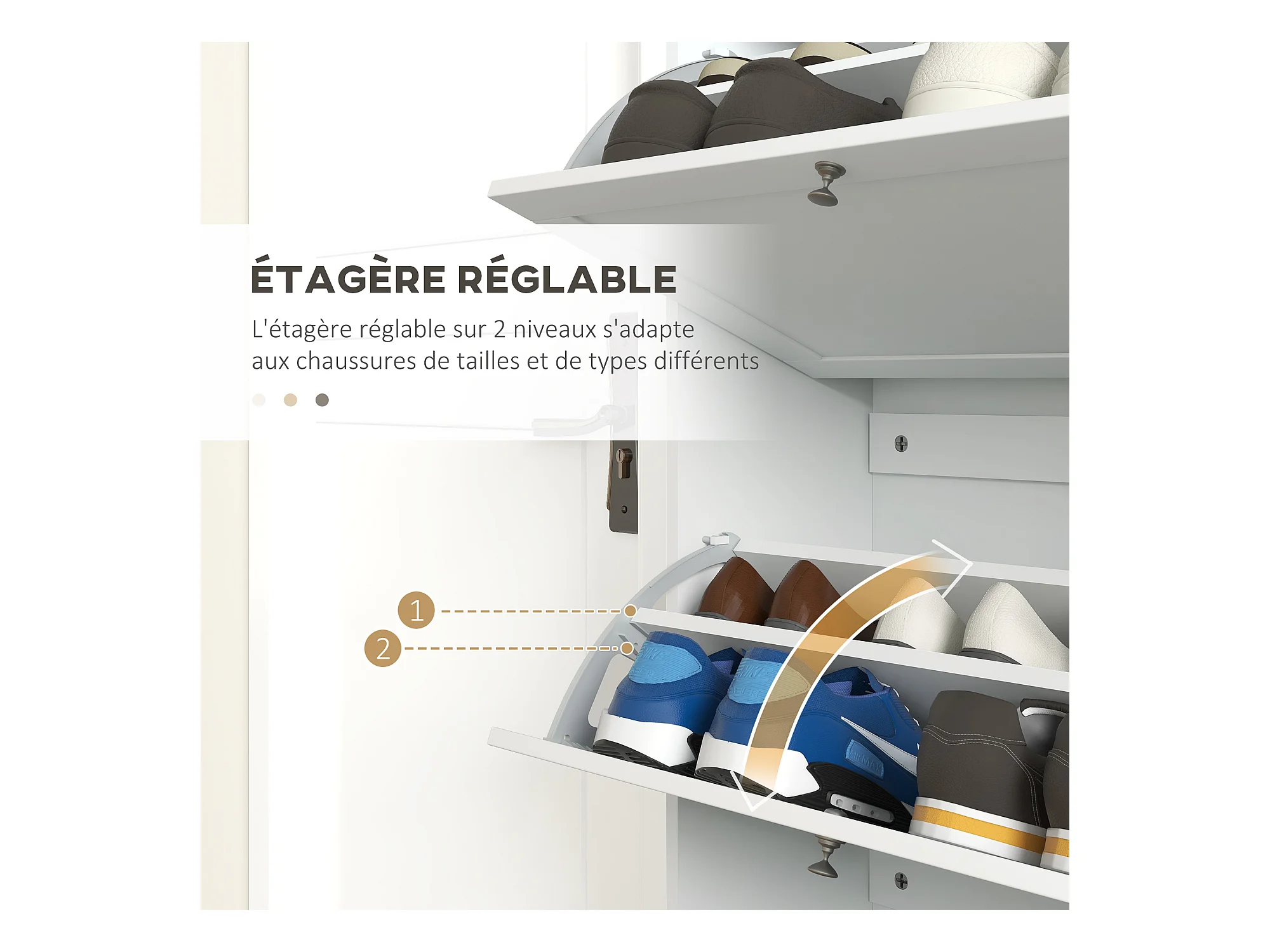 Armoire à chaussures avec 2 tiroirs rabattables + 1 tiroir coulissant + 1 comptoir et 1 plateau en verre étagère réglable sur 2 niveaux 89 x 23 x 96 cm blanc