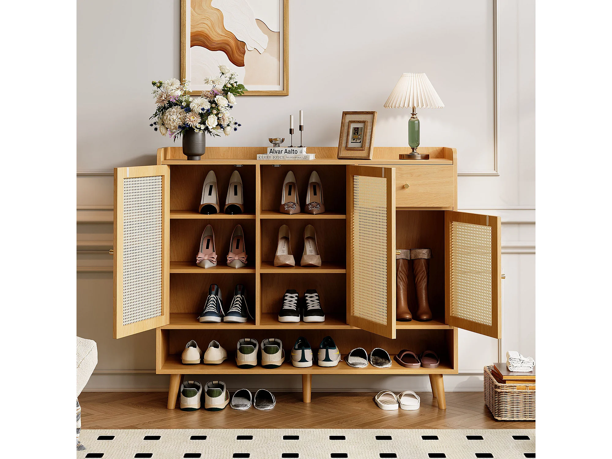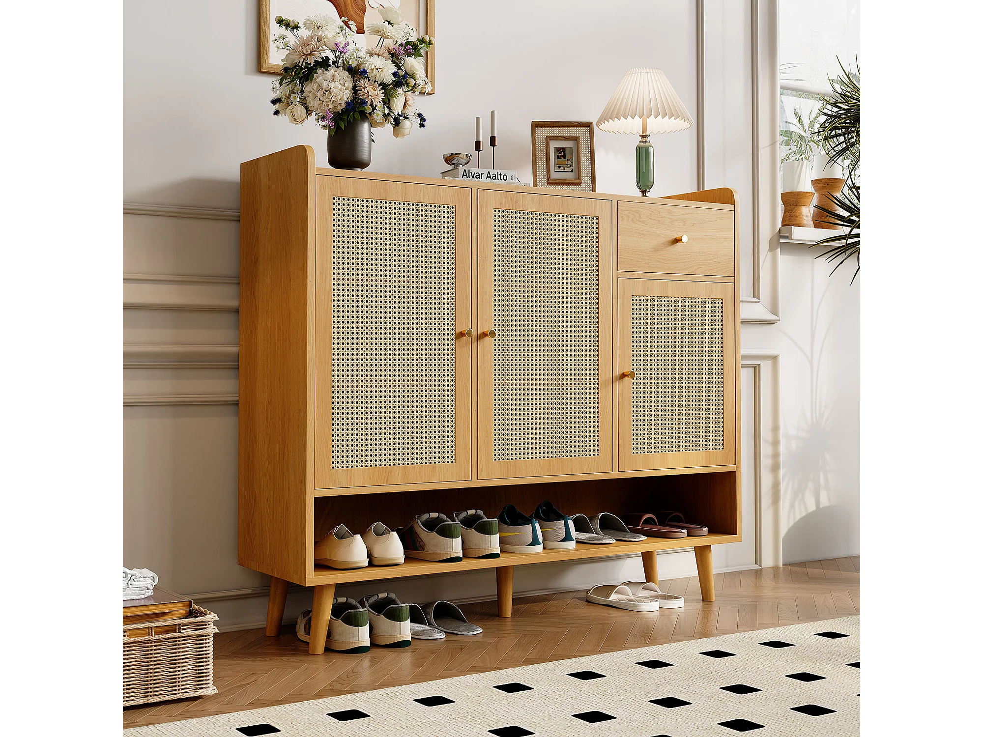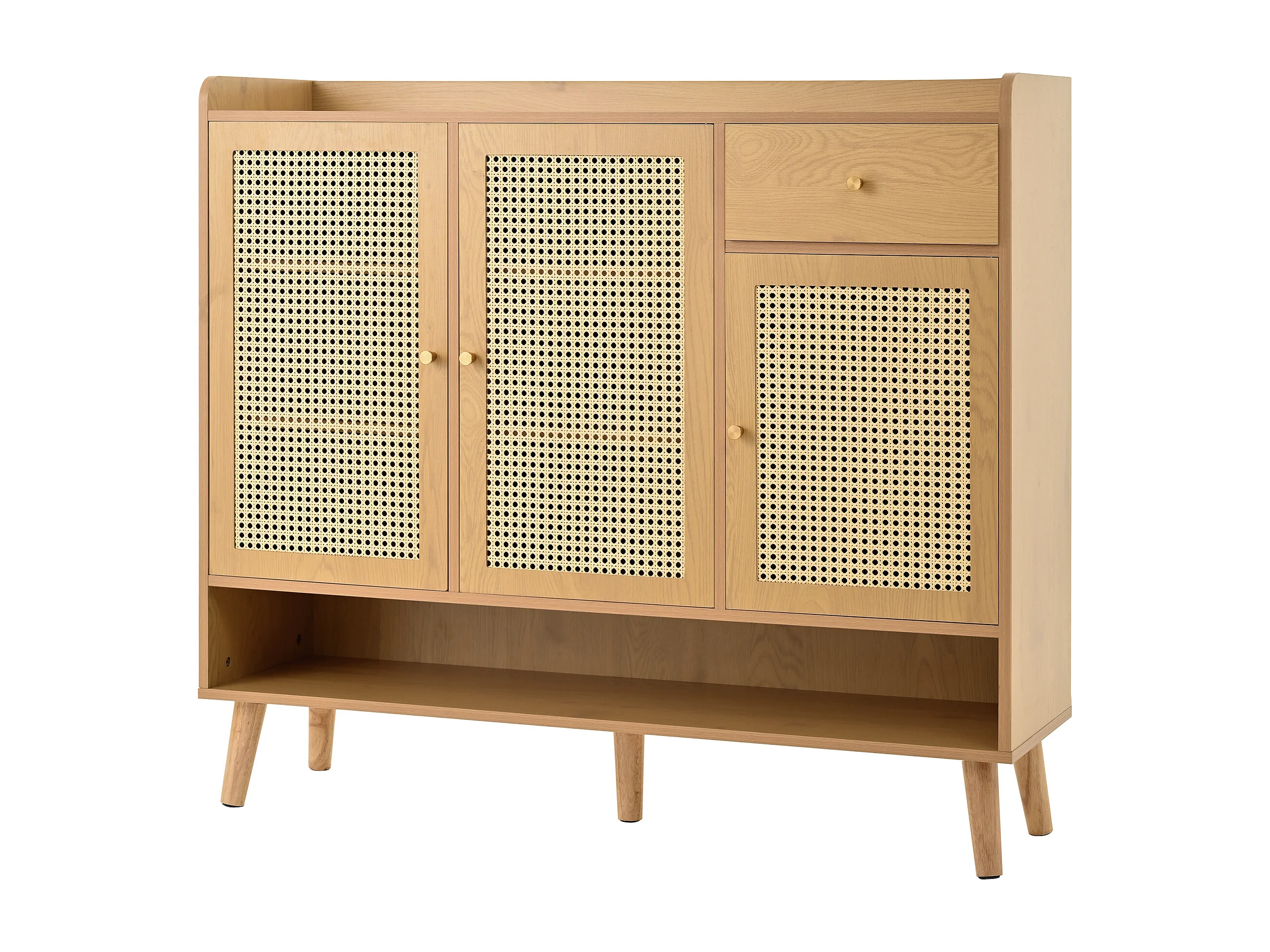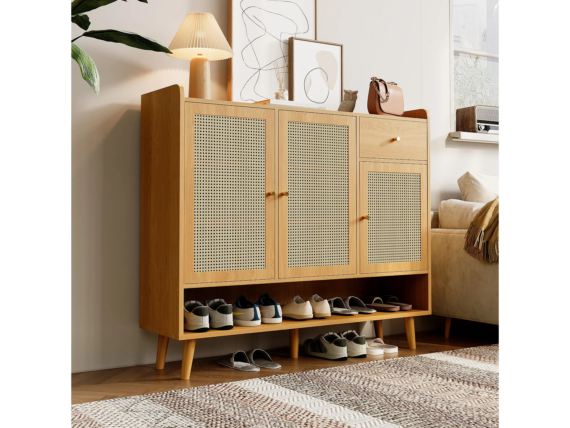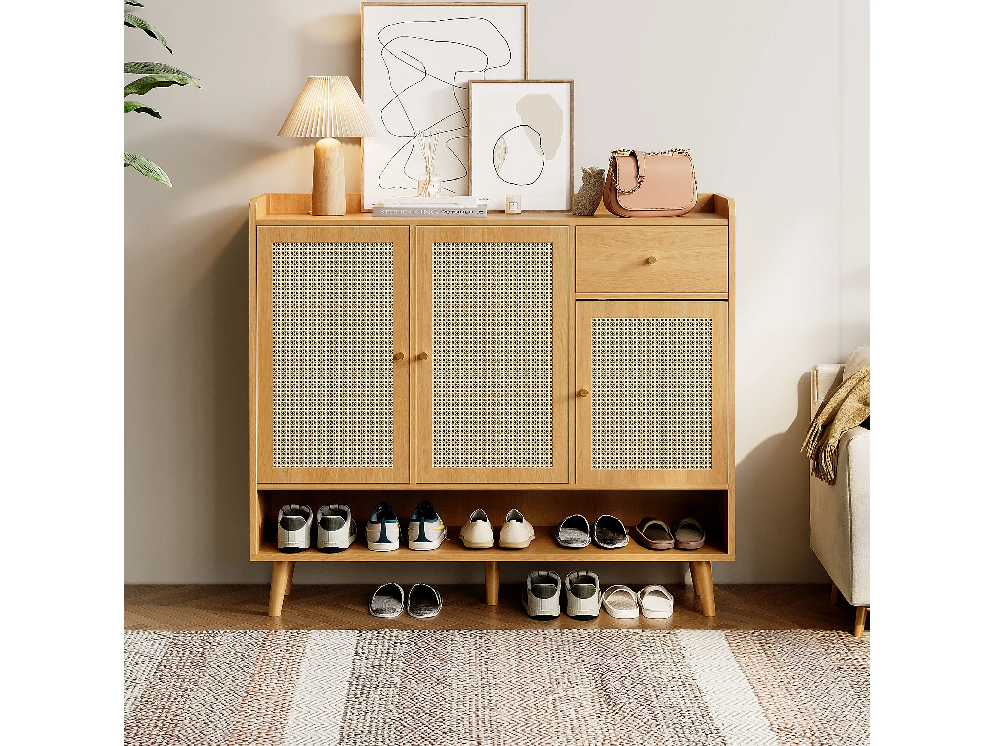 Armoire à chaussures en rotin naturel avec 3 portes, 1 tiroir et 5 étagères, avec poignées métalliques et pieds en bois massif (120x35x106 cm)