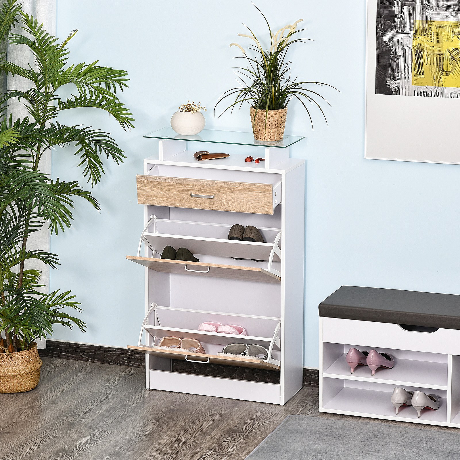 Armoire à chaussures organisateur de luxe pour chaussures 2 portes abattantes 2 compartiments, tiroir, étagère verre panneaux particules chêne blanc