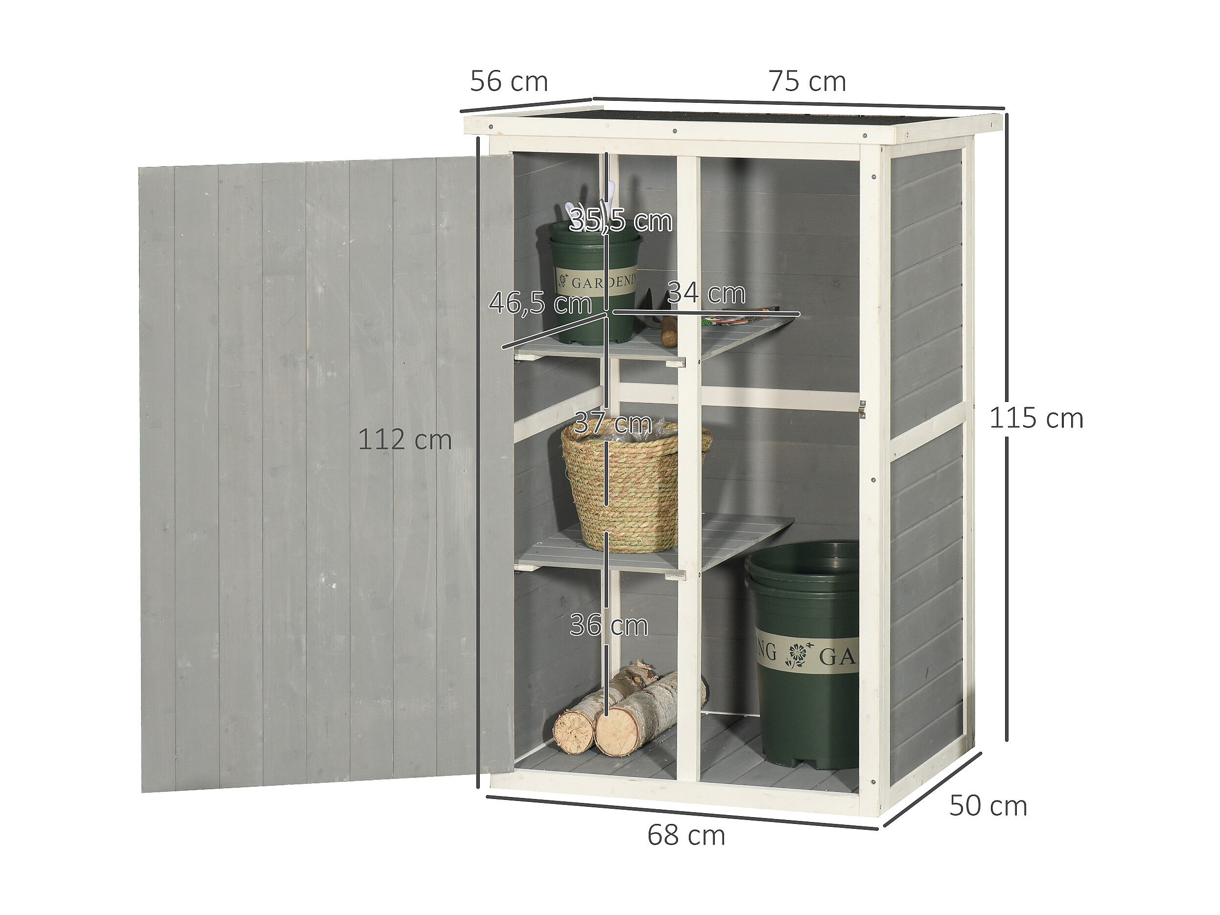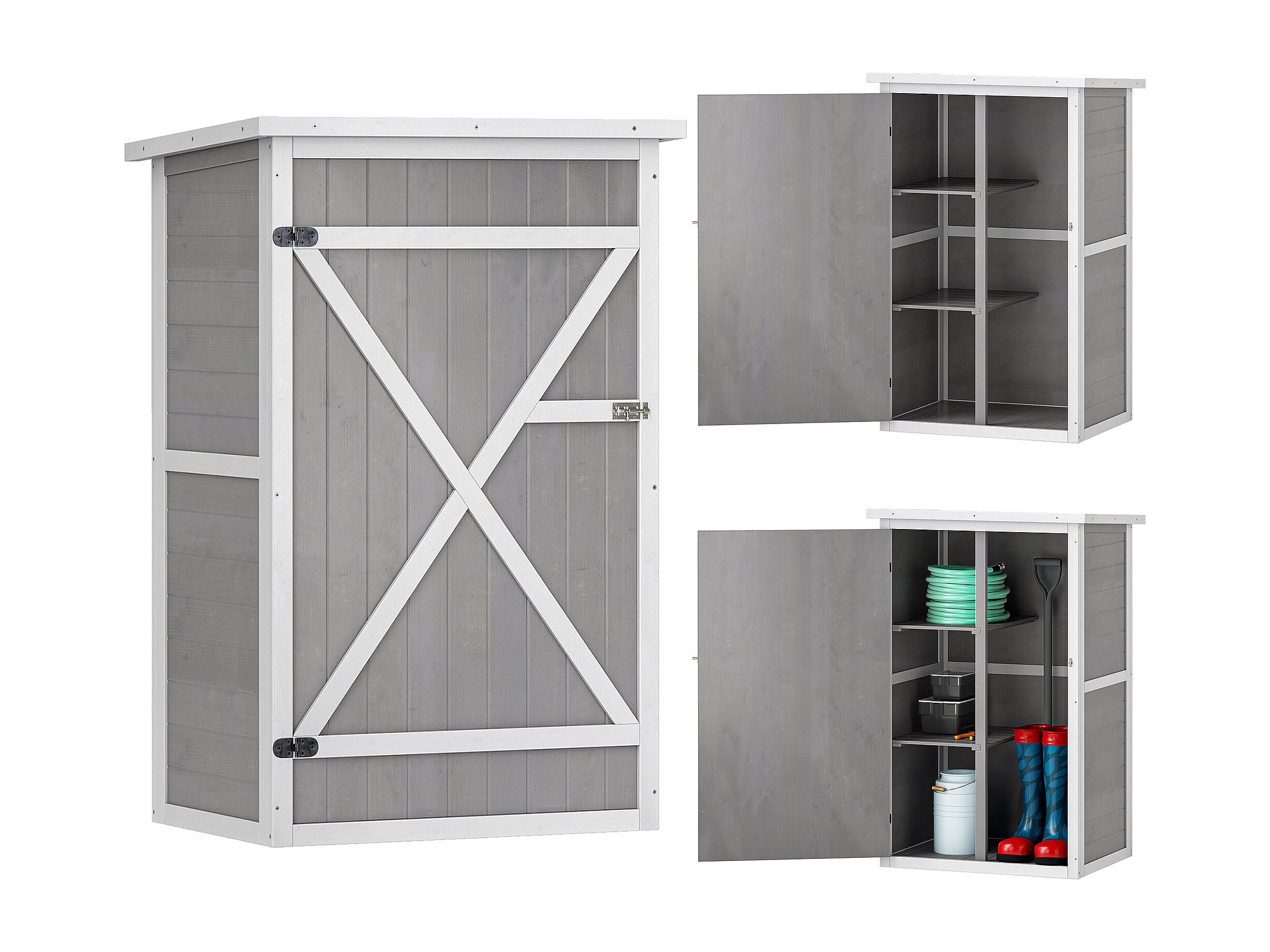 Armoire abri de jardin remise pour outils - grande porte verrouillable loquet - 2 étagères - toit bitumé incliné bois de sapin blanc gris