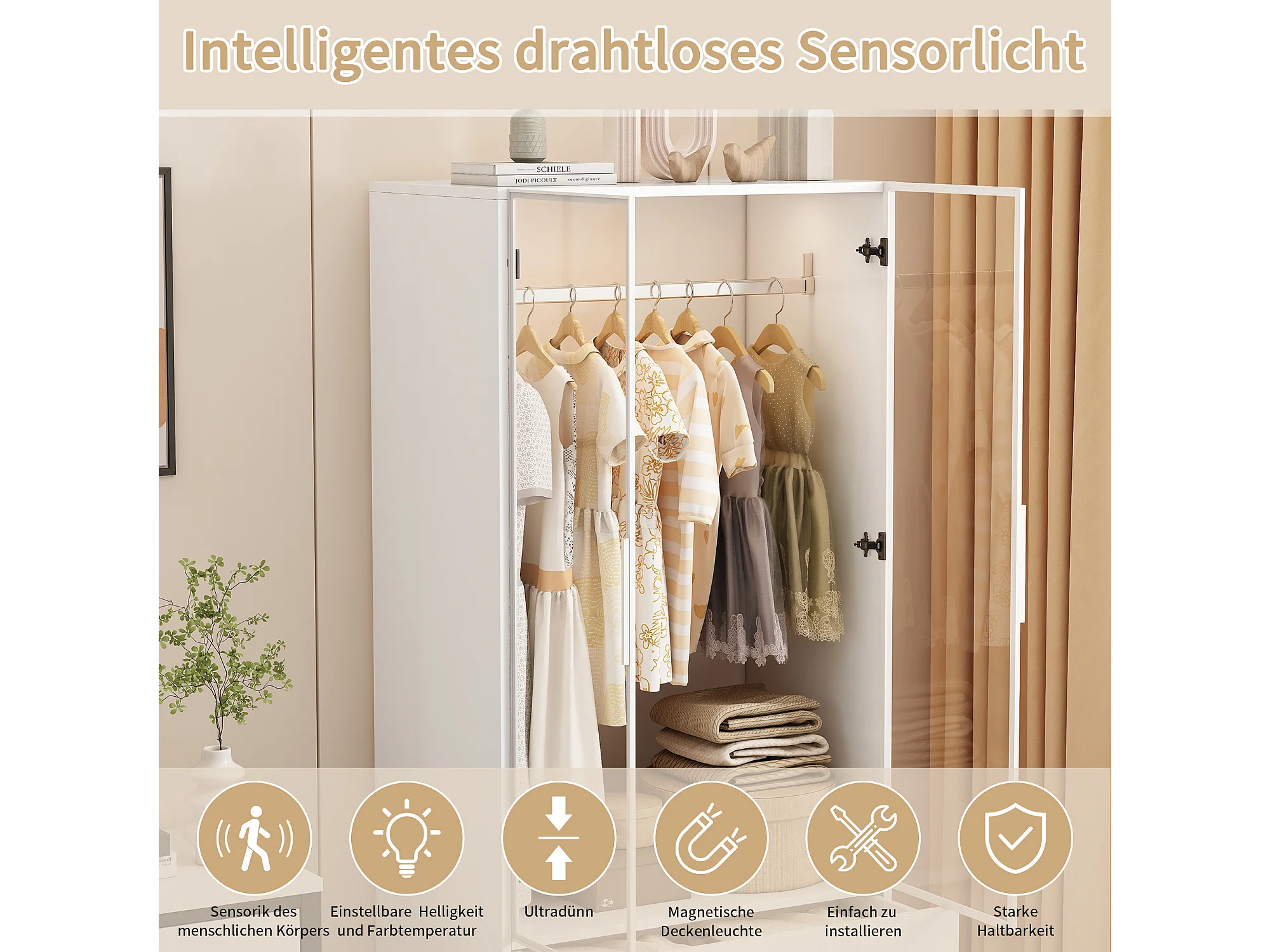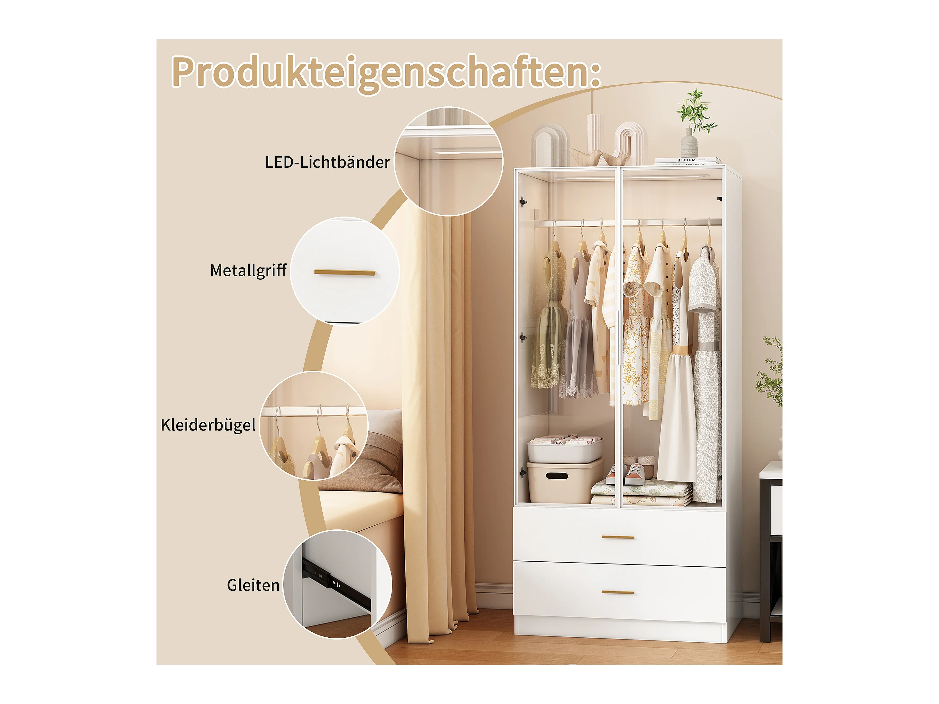 Armoire-Armoire avec éclairage LED et portes en verre-Armoire pour vêtements avec 2 tiroirs-Closets ouverts-Blanc