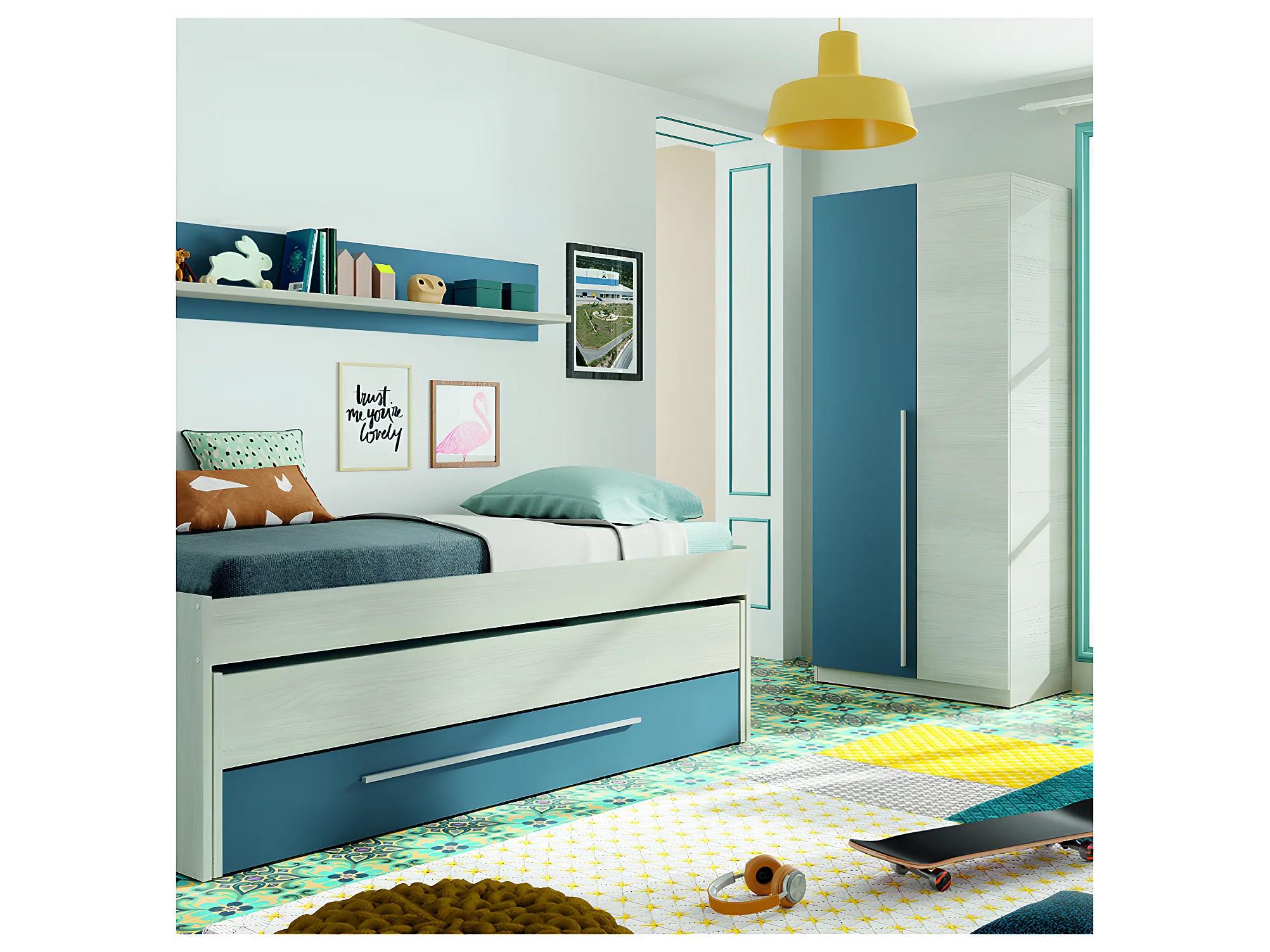 Armoire avec 2 portes coloris Blanc Alpes / bleu en mélamine - Dim : 200 x 90 x 52 cm