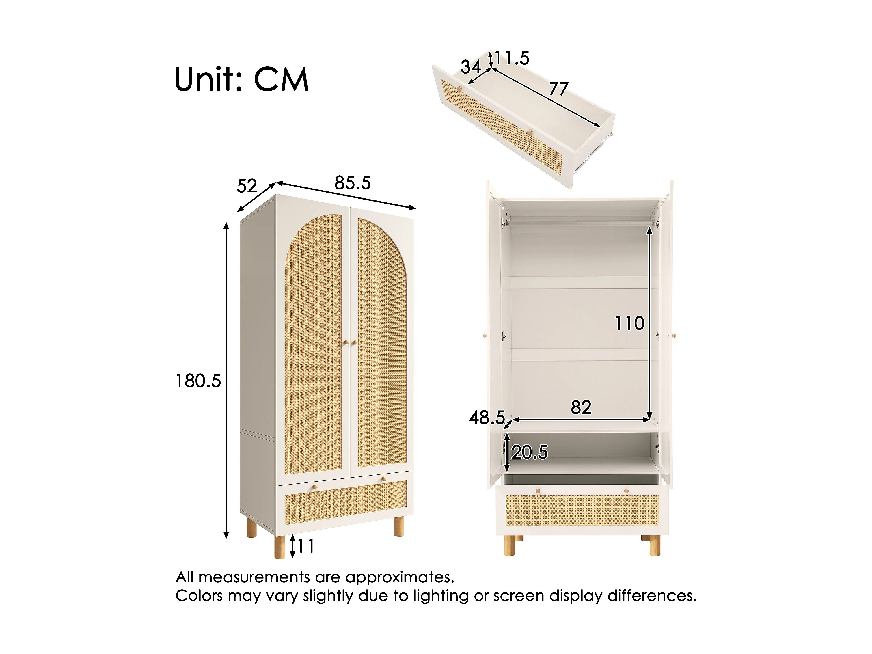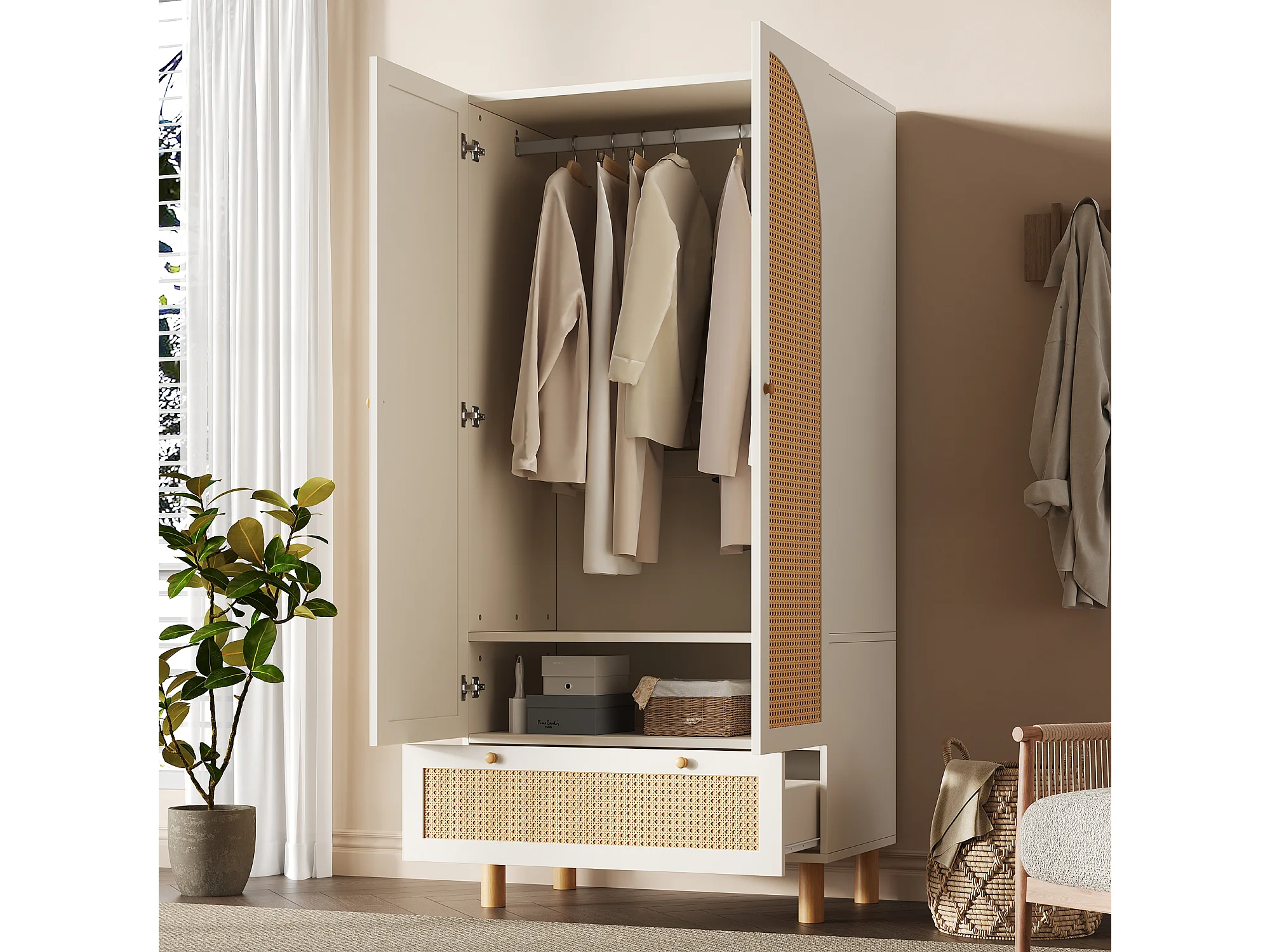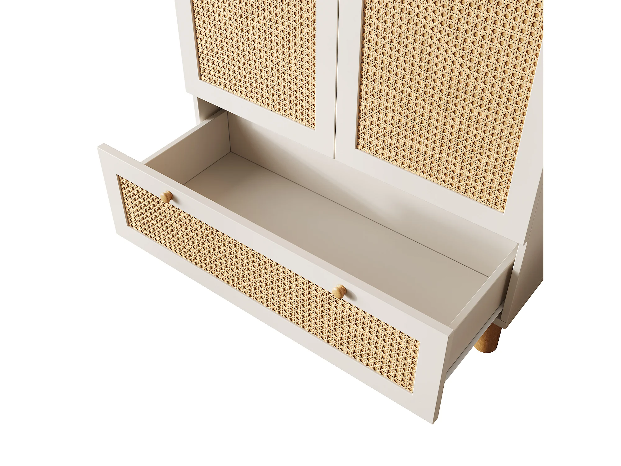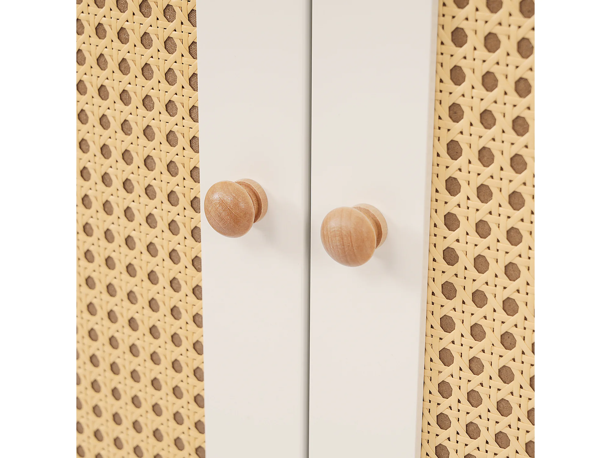 Armoire avec 2 portes en rotin et tiroir, blanche et naturelle, MDF +pin