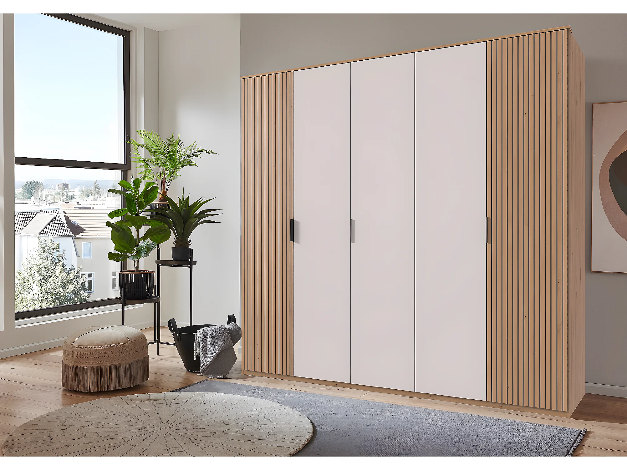 Armoire avec corniche, placard coloris blanc, imitation chêne Artisan - L. 225 x H. 210 x P. 58 cm