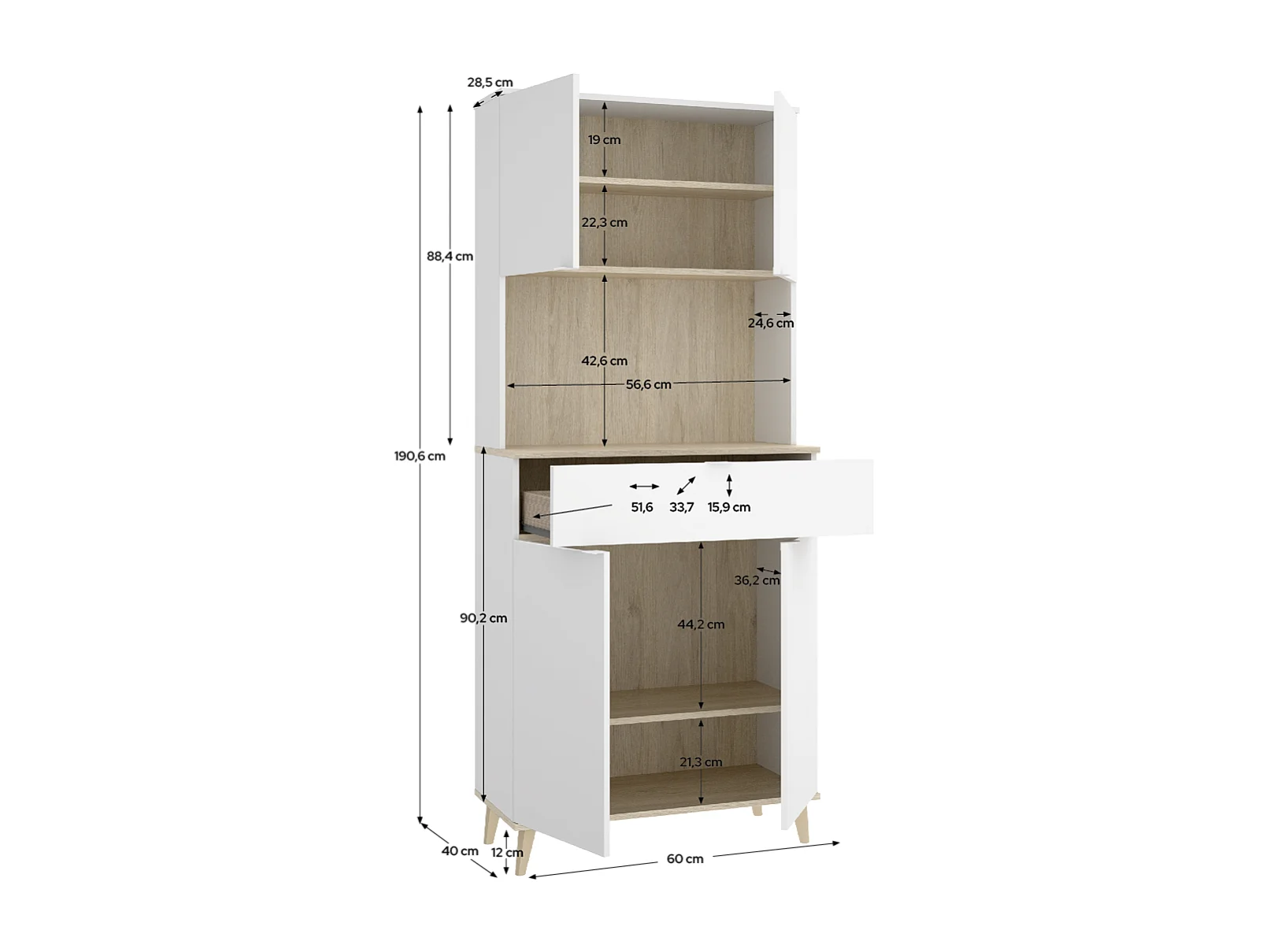 Armoire buffet de cuisine à 4 portes, 1 tiroir et 1 niche centrale, coloris blanc/naturel - Hauteur 191 x Longueur 60 x Profondeur 40 cm