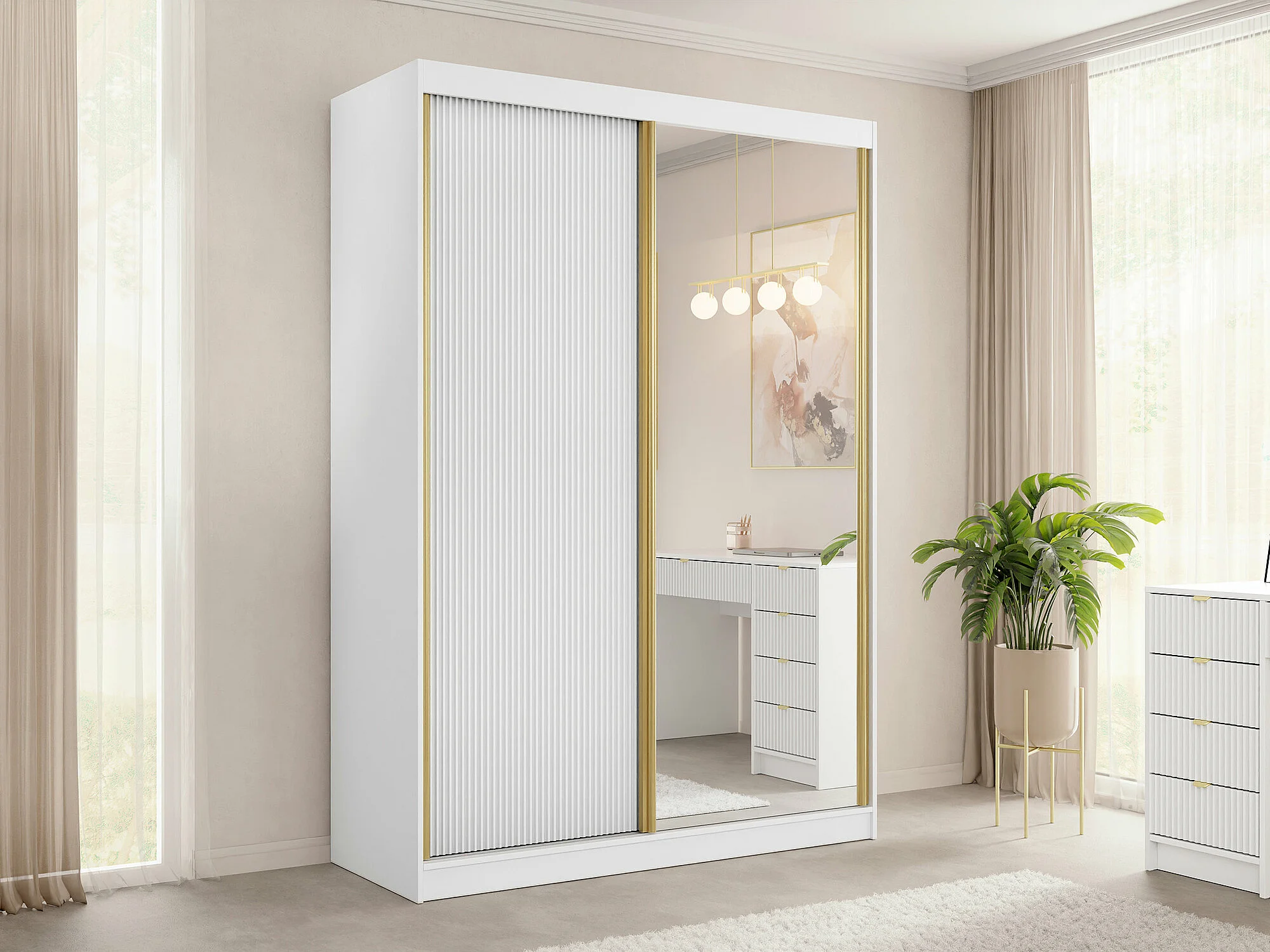 Armoire Comfivo Larmire 124, Doré|Blanc, 216x151x60cm, Portes d'armoire: Coulissantes