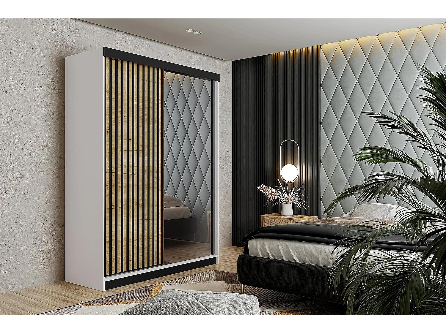 Armoire coulissante avec miroir et lames MALANI 138 - Blanche + Chêne Craft Doré