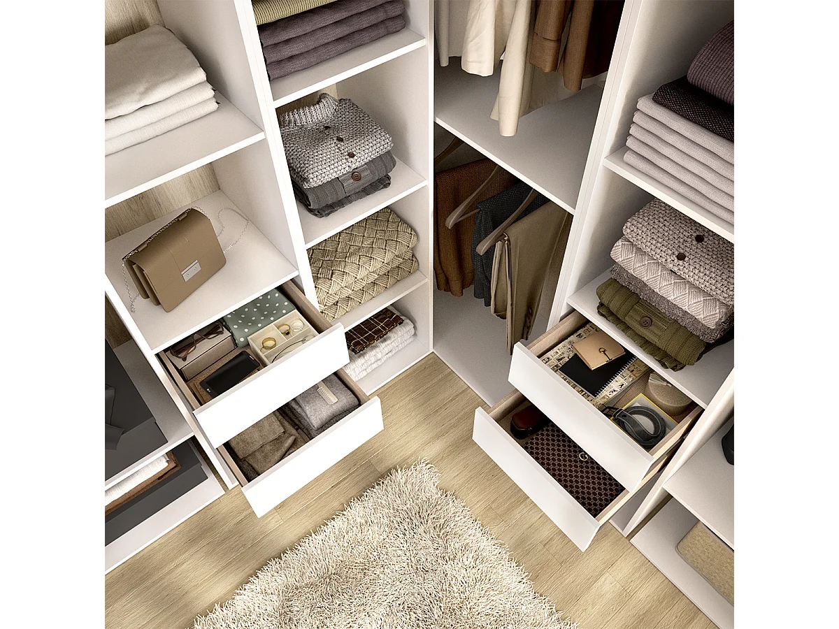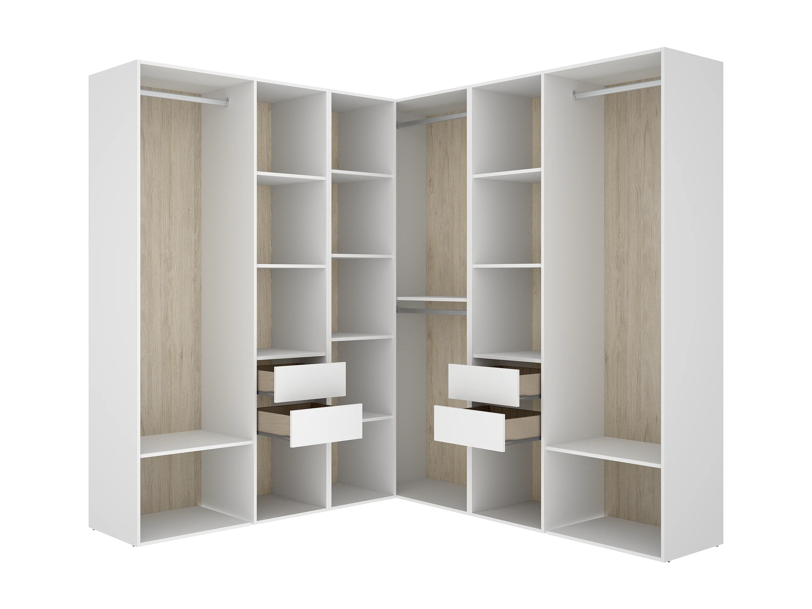 Armoire d’angle dressing ouverte avec 3 penderies, 4 tiroirs et étagères de rangement - Hauteur 204,5 x Longueur 182,4 x Profondeur 186,3 cm