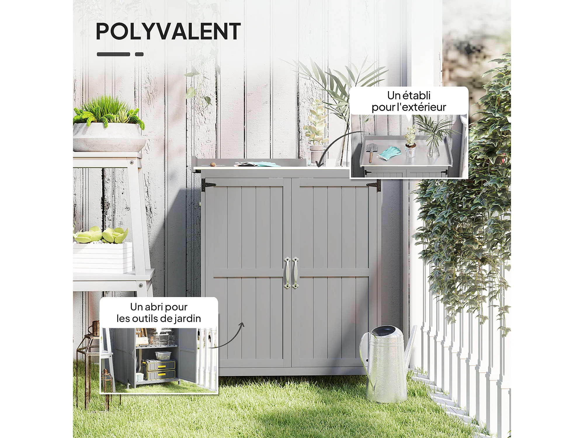 Armoire de rangement de jardin sur pied, table de rempotage 2 en 1 double porte, étagère, plateau métal galvanisé - bois sapin gris