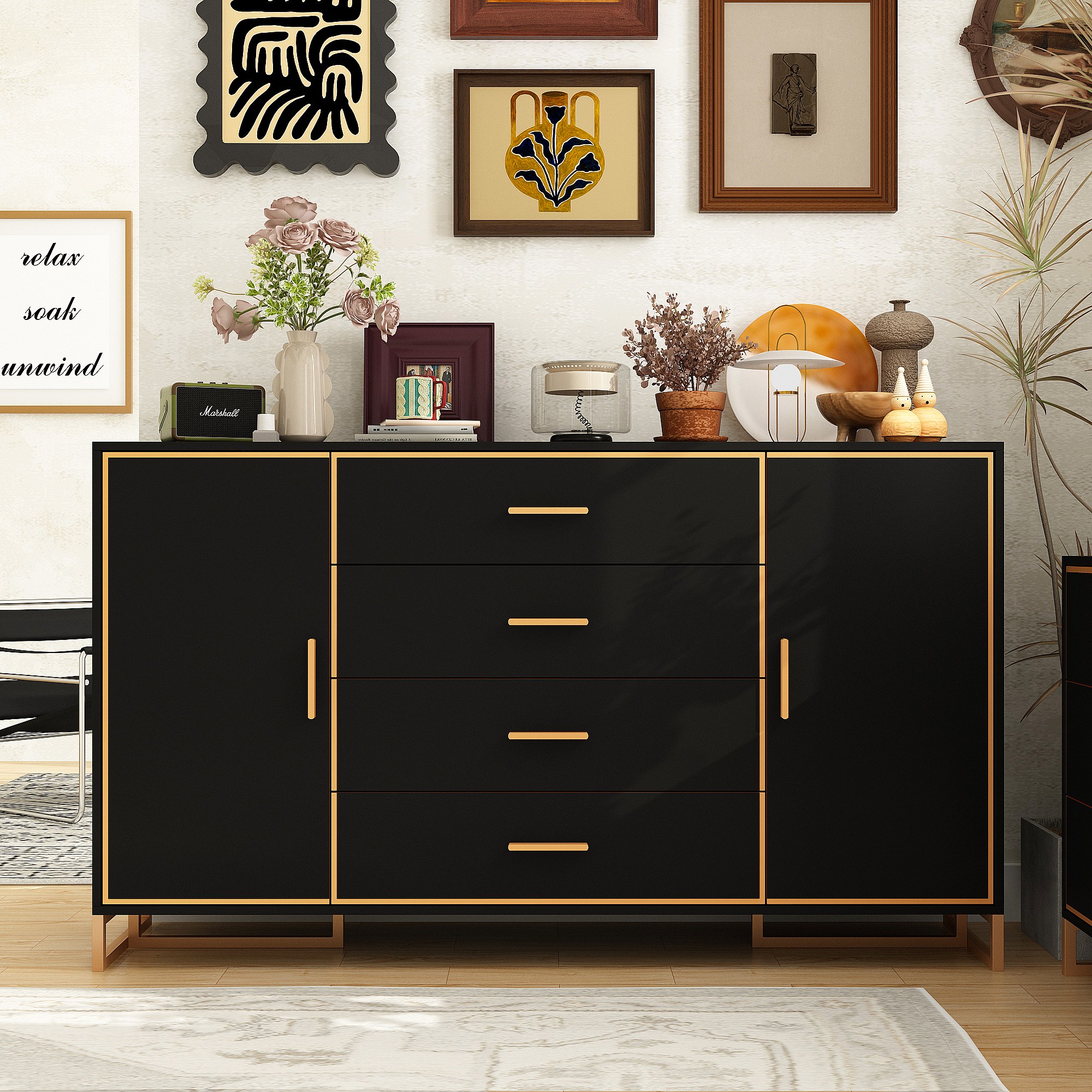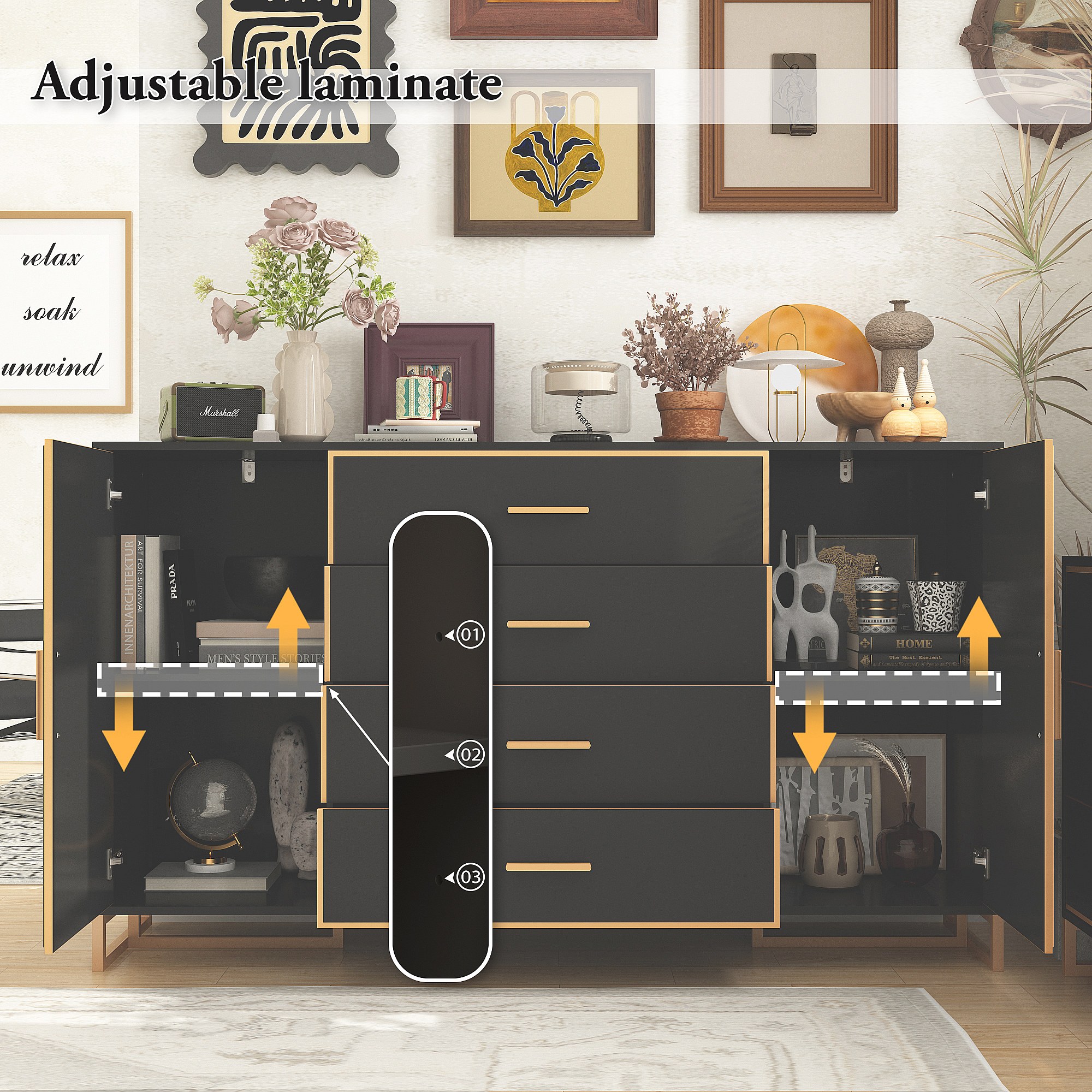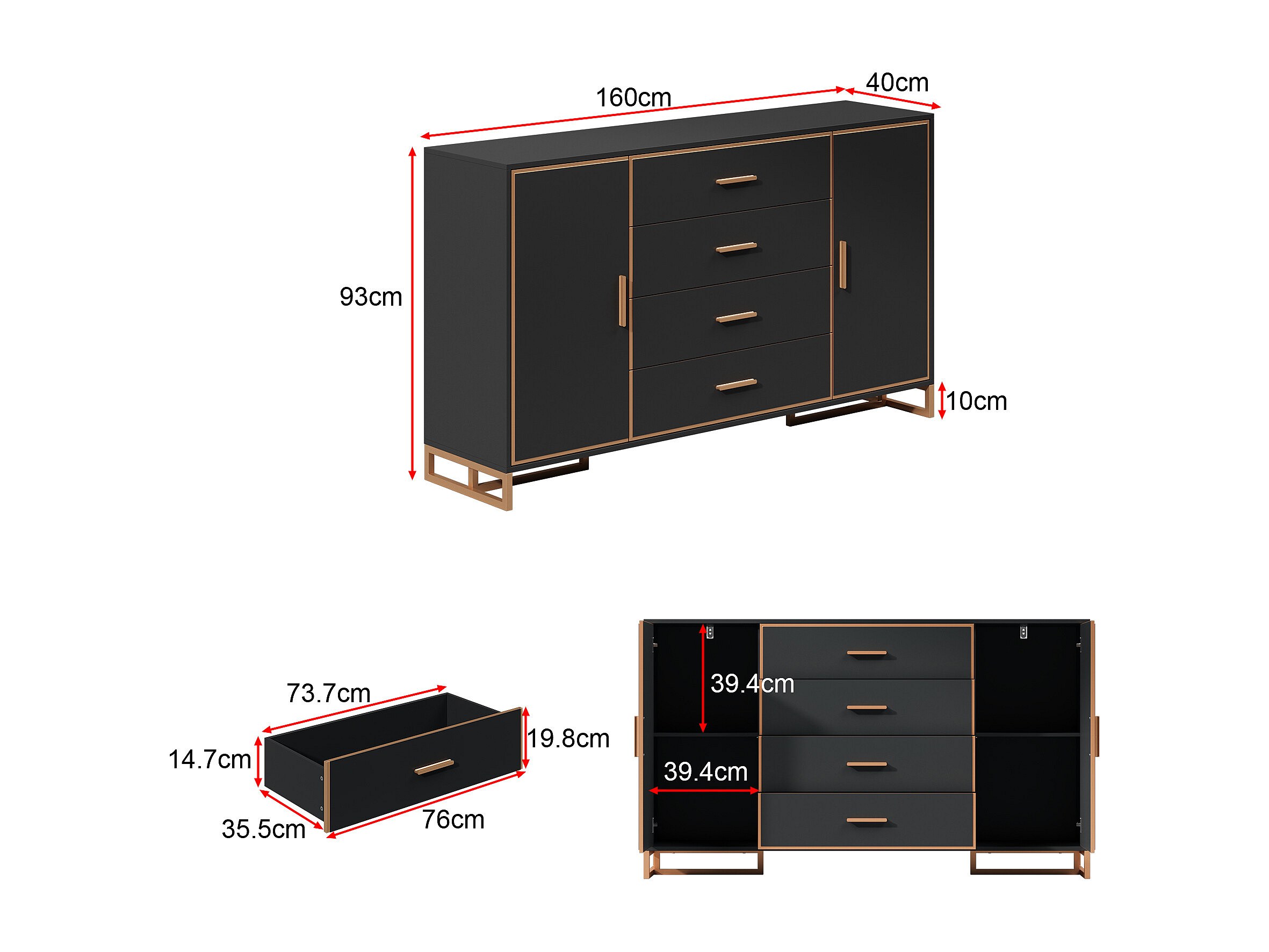 Buffet de Salon avec 2 Portes et 4 Tiroirs, Meuble de Rangement avec Pieds Dorés en Métal pour Chambre, 160 x 40 x 93, Noir Brillant