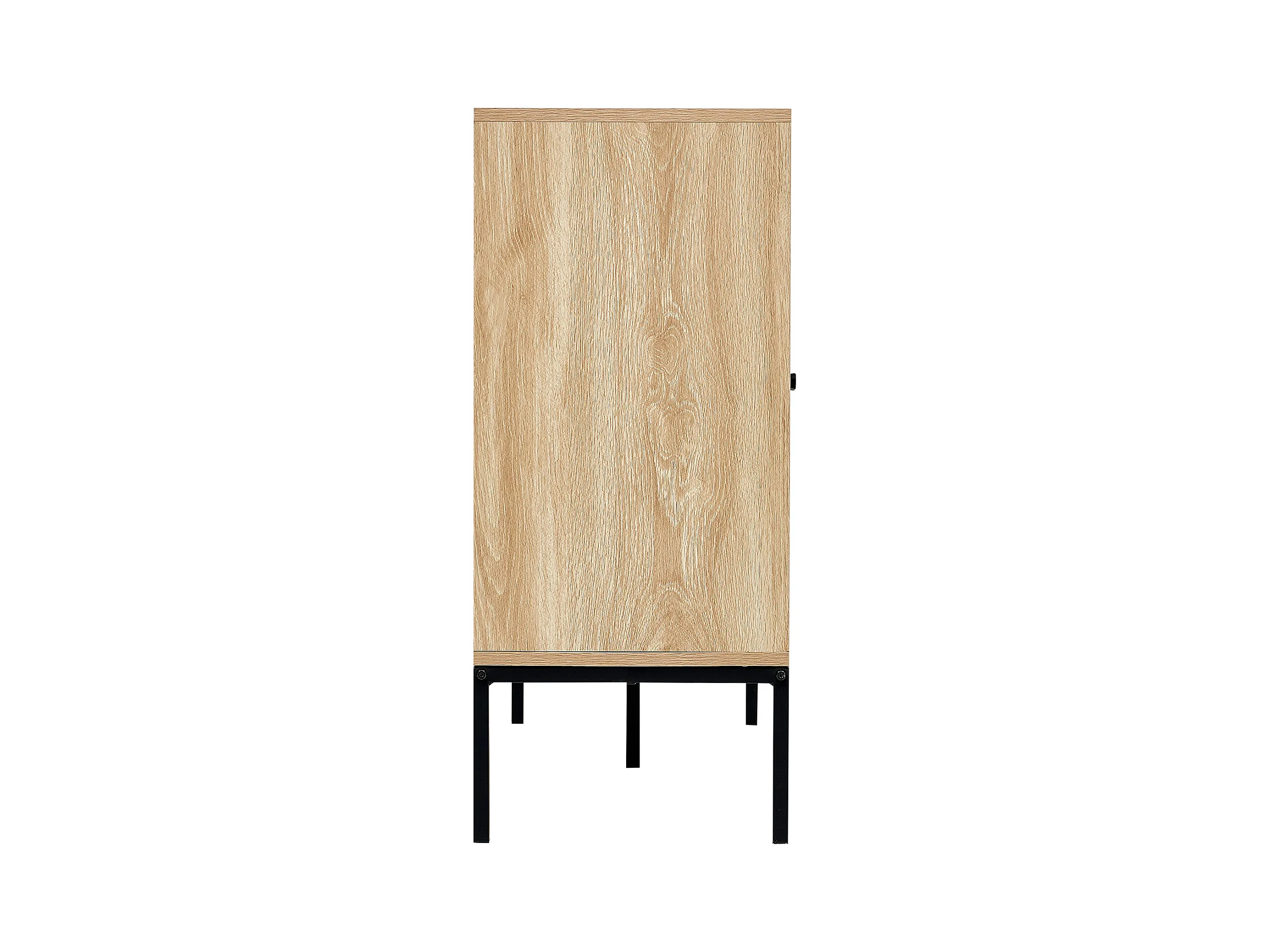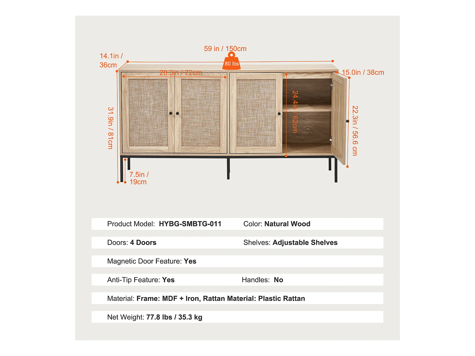 Armoire de Rangement SucceBuy Armoire en Rotin avec 4 Portes Magnétiques et Étages Réglables, pour Couloir, Salon, Cuisine - Finition Naturelle