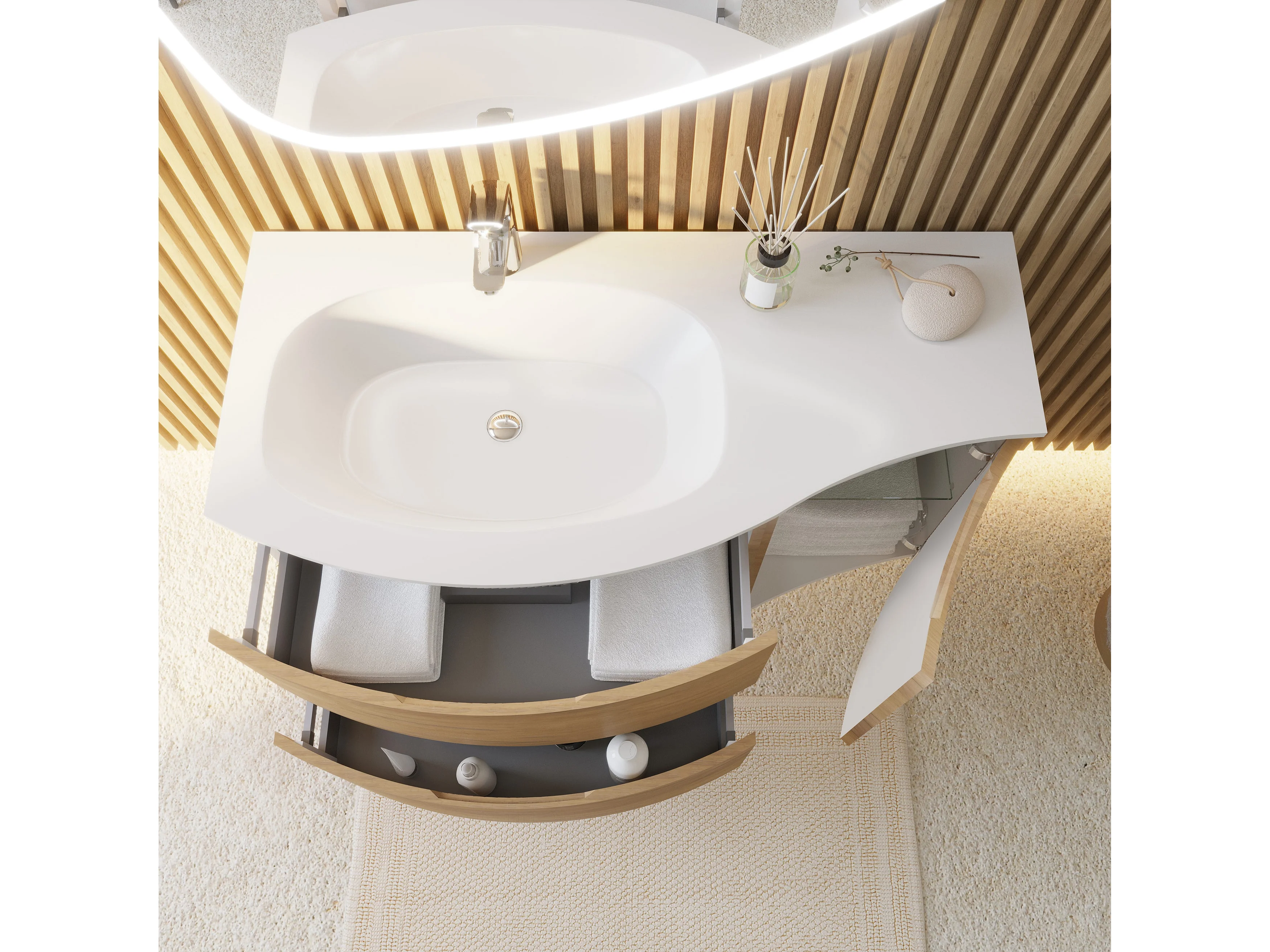 Armoire De Salle De Bains Murale Incurvée En Chêne Miel De 105 Cm Avec Miroir Rabattable | Los Angeles