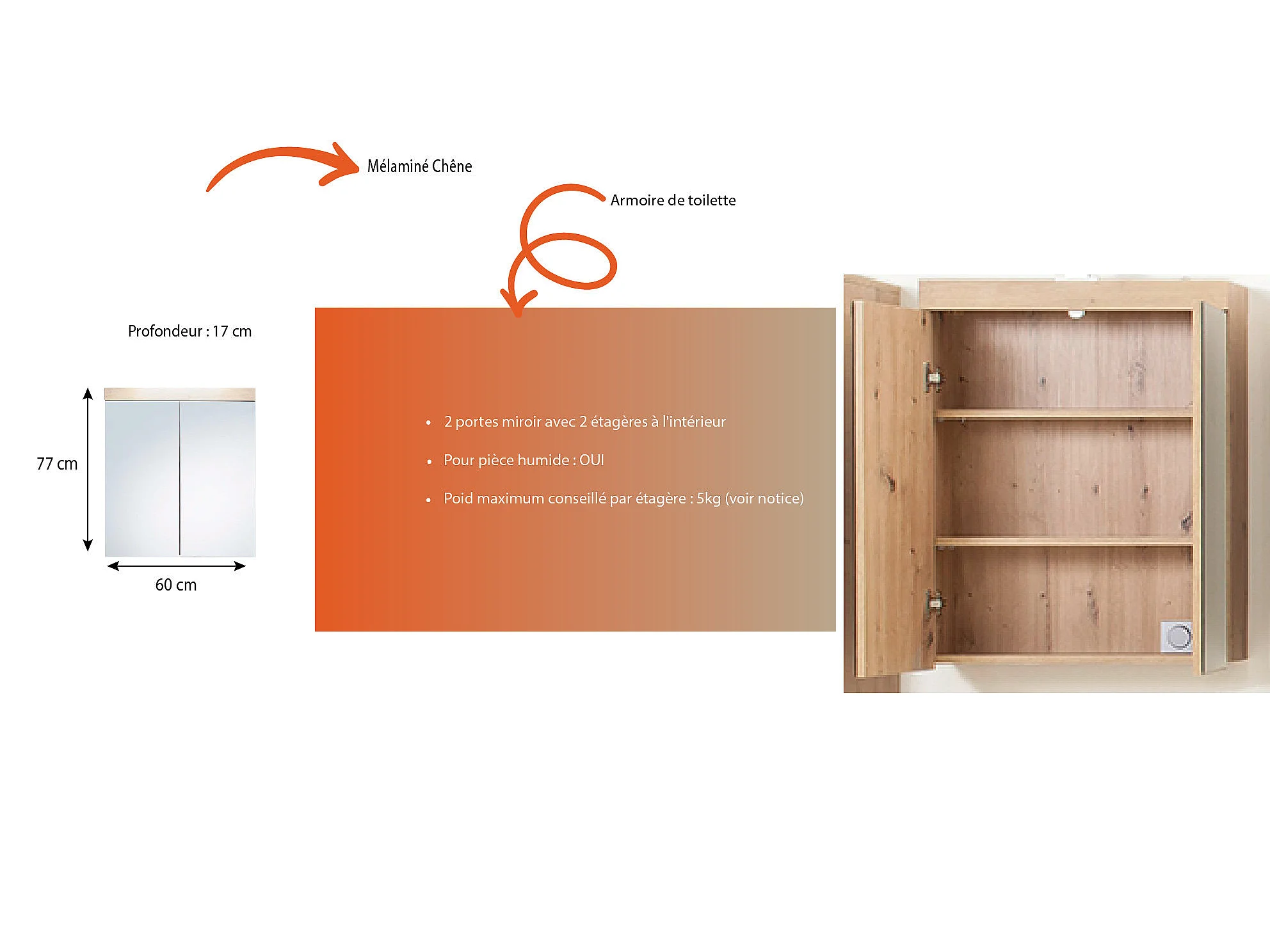 Armoire de toilette murale - 2 portes miroir - mélaminé blanc - bandeau chêne L - H - P : 60 - 77 - 17 cm