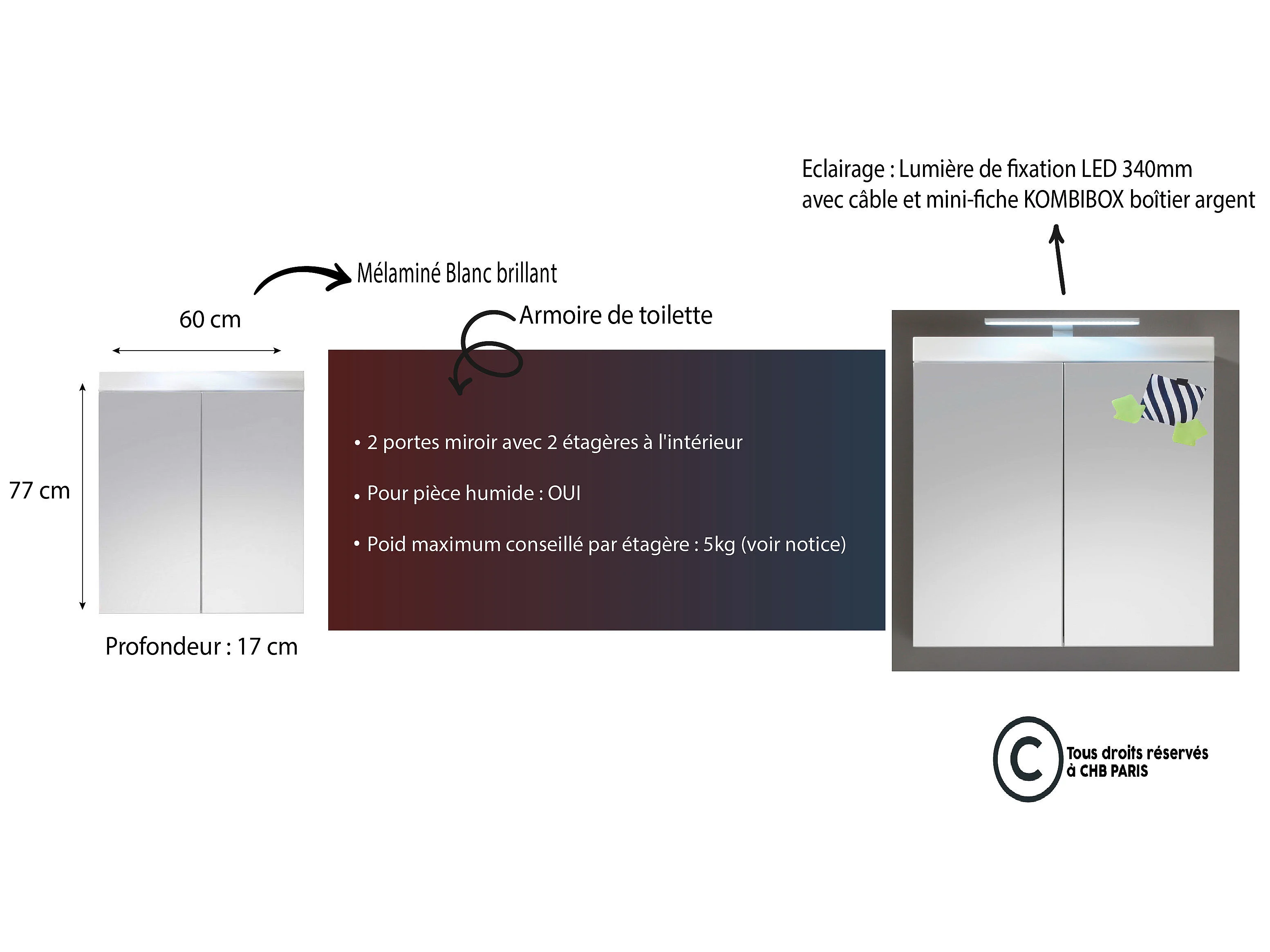 Armoire de toilette murale mélaminé avec bandeau lumineux blanc - 2 portes miroir. L - H - P : 60 - 77 - 17 cm