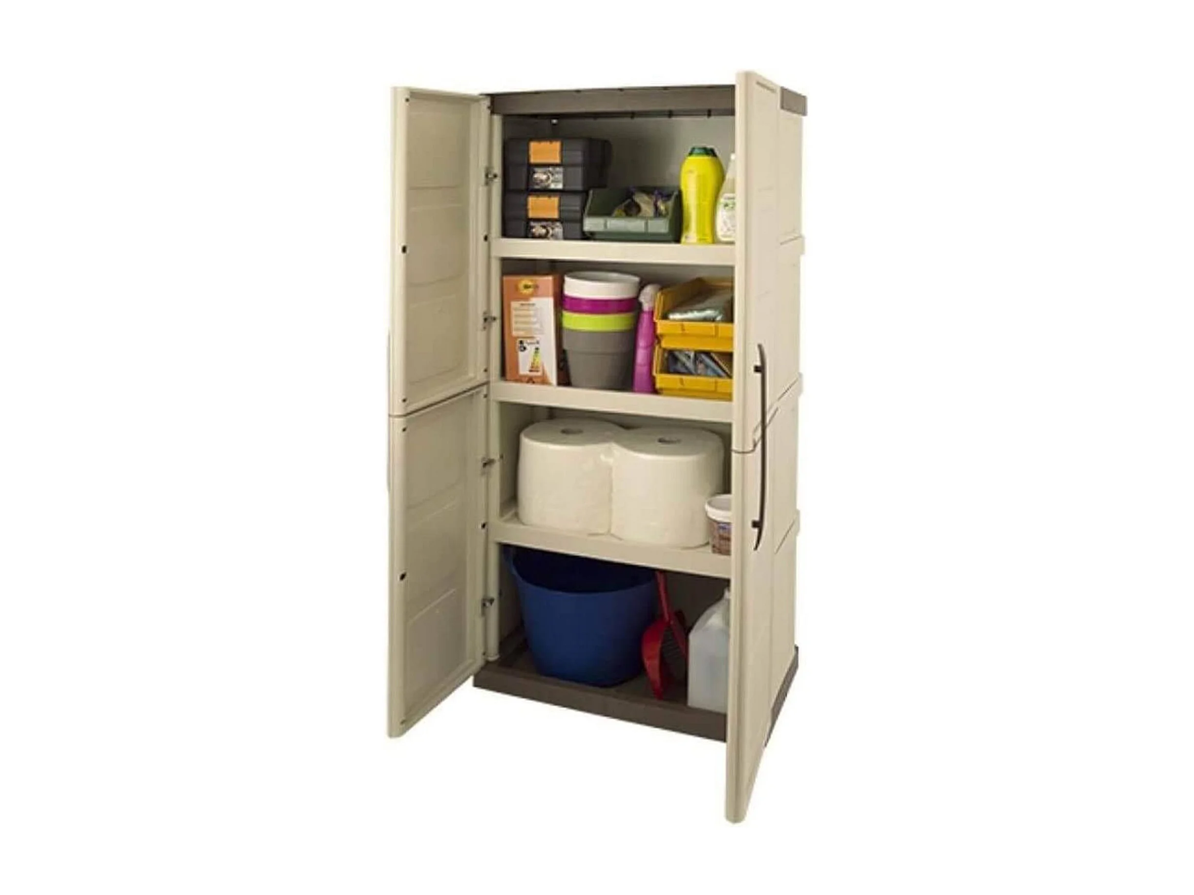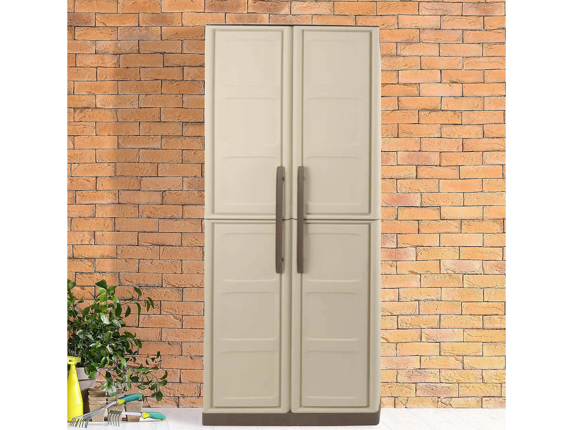 Armoire d'extérieur Marchin, Armoire de balcon polyvalente, Armoire d'extérieur 2 portes, 100% Made in Italy, Beige et Marron, Finition Damier, 70x39h165 cm