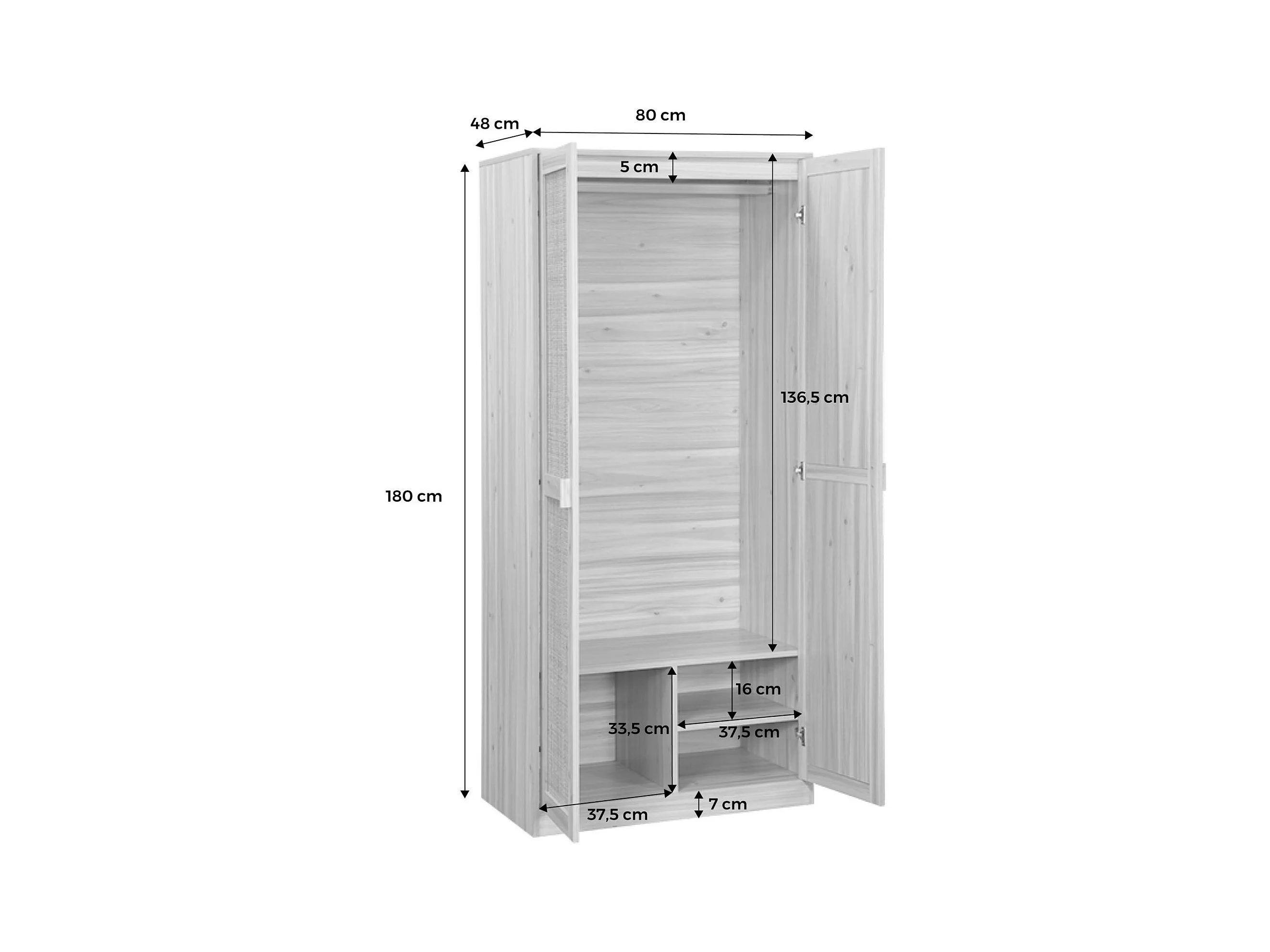 Armoire dressing cannage et effet bois. 2 portes avec penderie et rangements