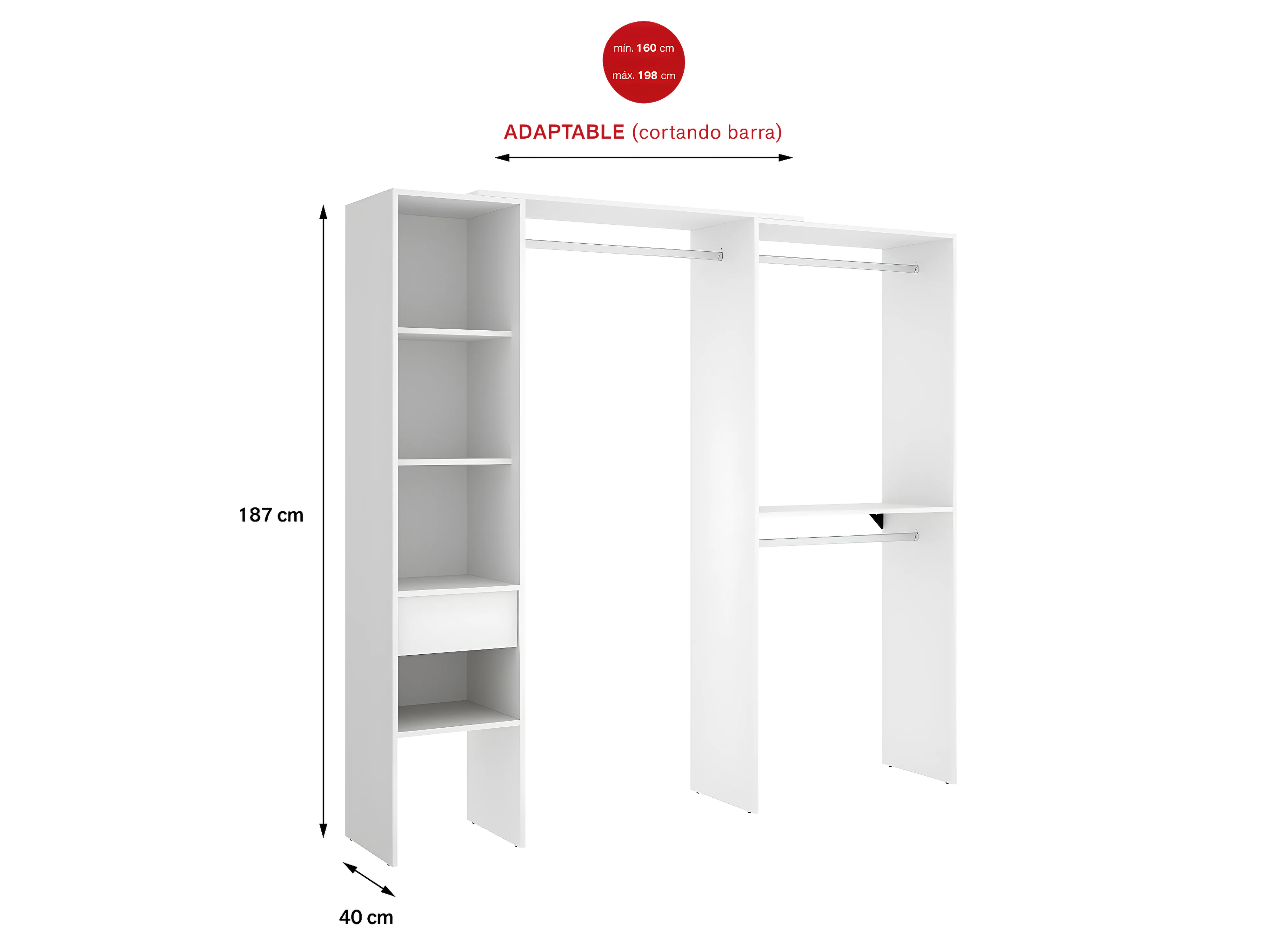 Armoire dressing double en bois mélaminé coloris blanc - Longueur 98 x Profondeur 41 x Hauteur 187 cm