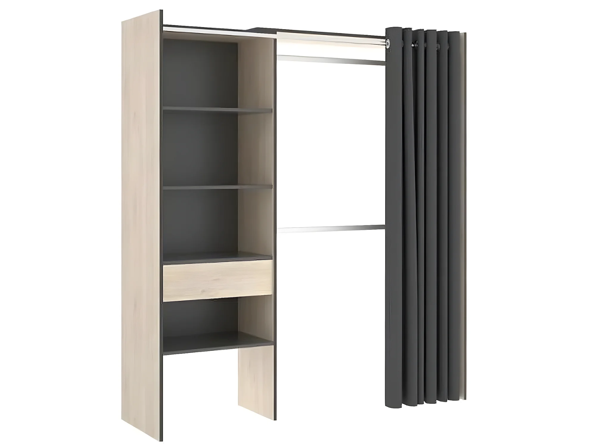 Armoire dressing extensible avec rideau + 1 tiroir coloris naturel/graphite - Longueur 110-160 x Hauteur 203 x Profondeur 50 cm