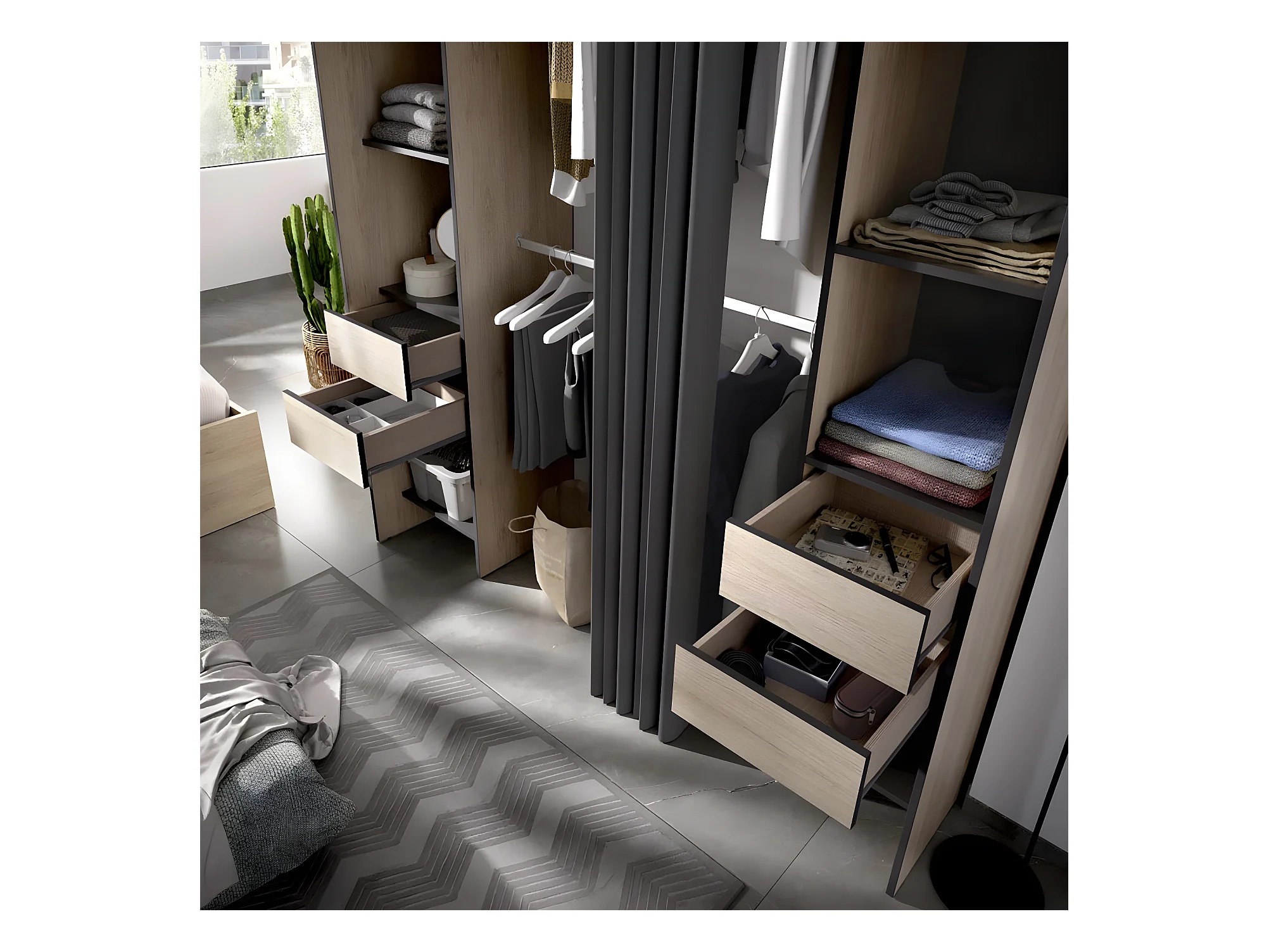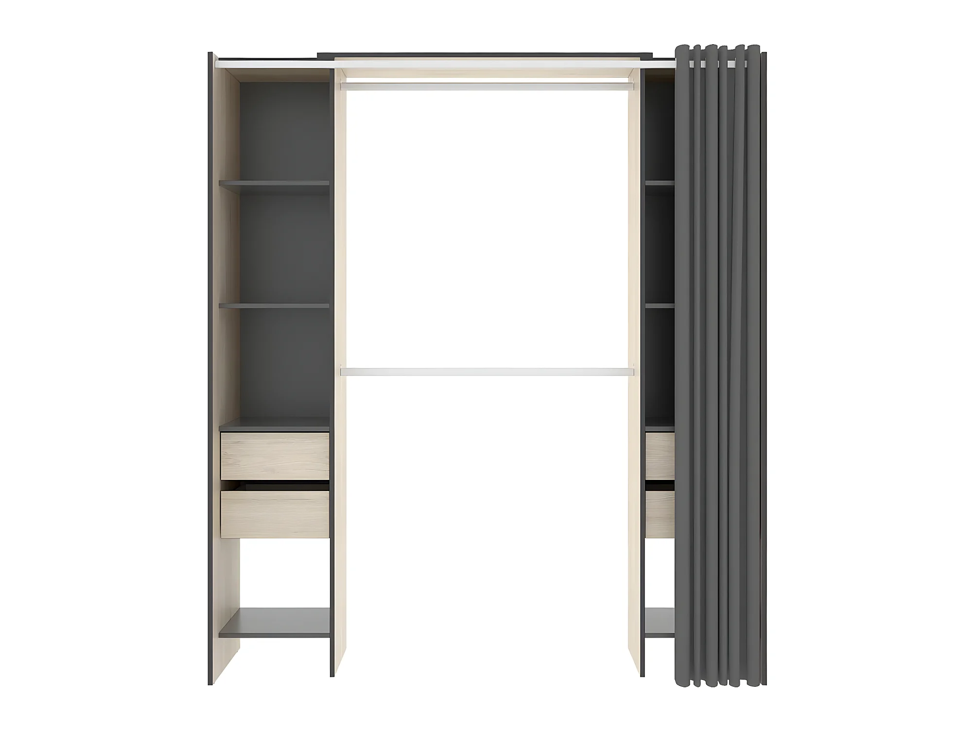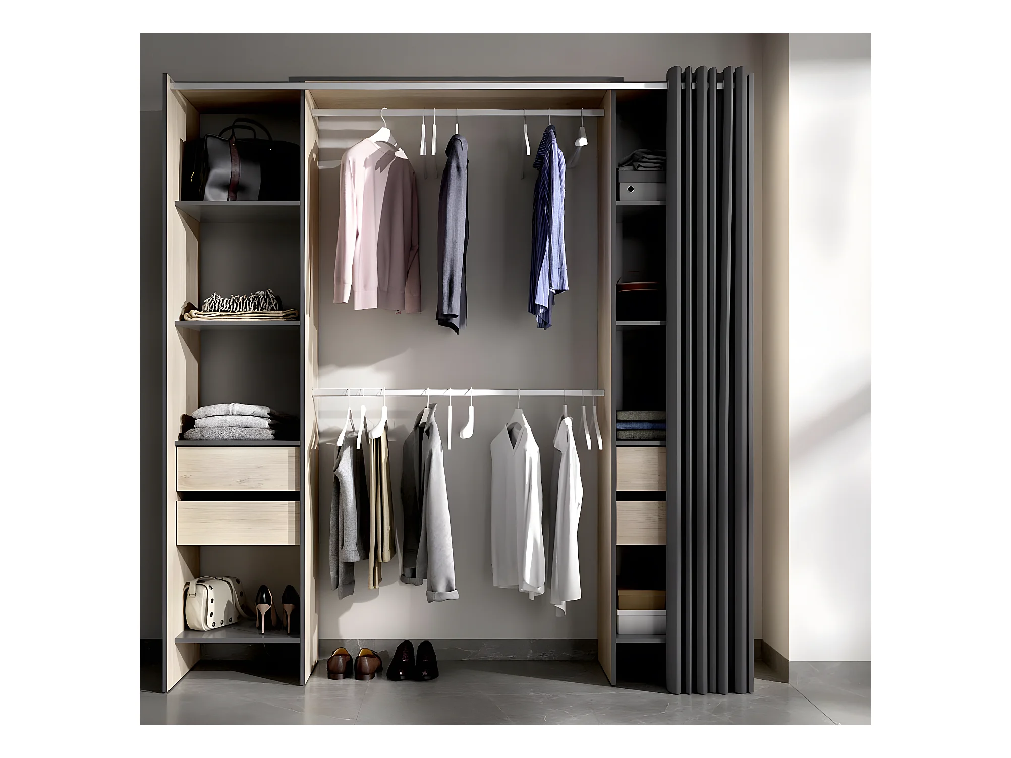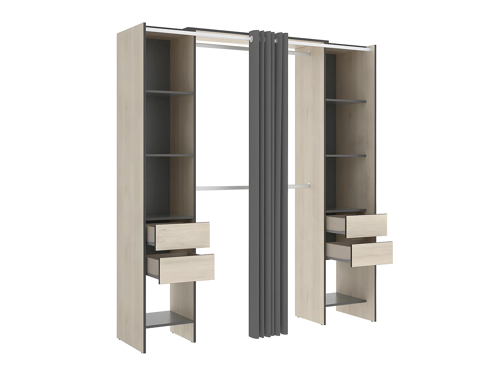 Armoire dressing extensible avec rideau + 4 tiroirs coloris naturel/graphite - Longueur 100-180 x Hauteur 203 x Profondeur 50 cm