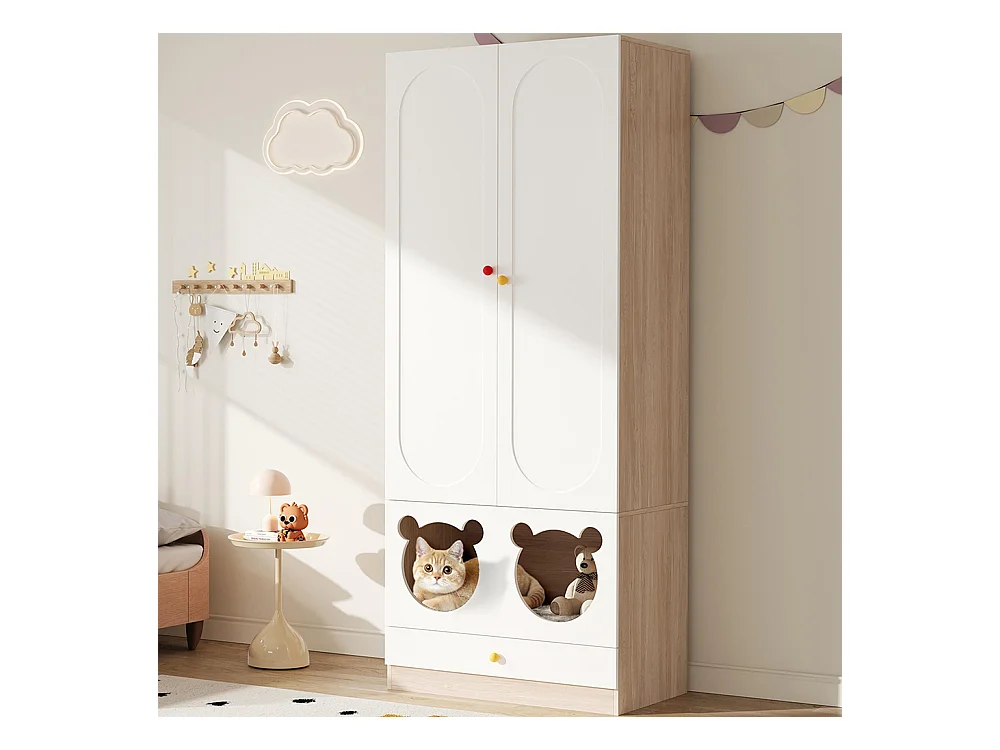 Armoire enfants tringle cintres lit chat panneaux laqués poignées céramique blanc bois naturel