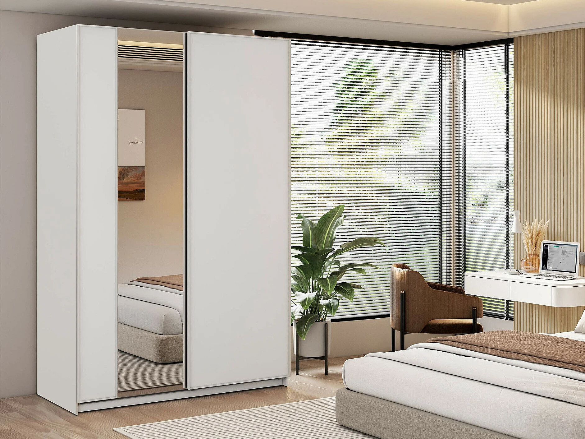 Armoire Fresno 158, Blanc, 235x150x71cm, Portes d'armoire: Coulissantes
