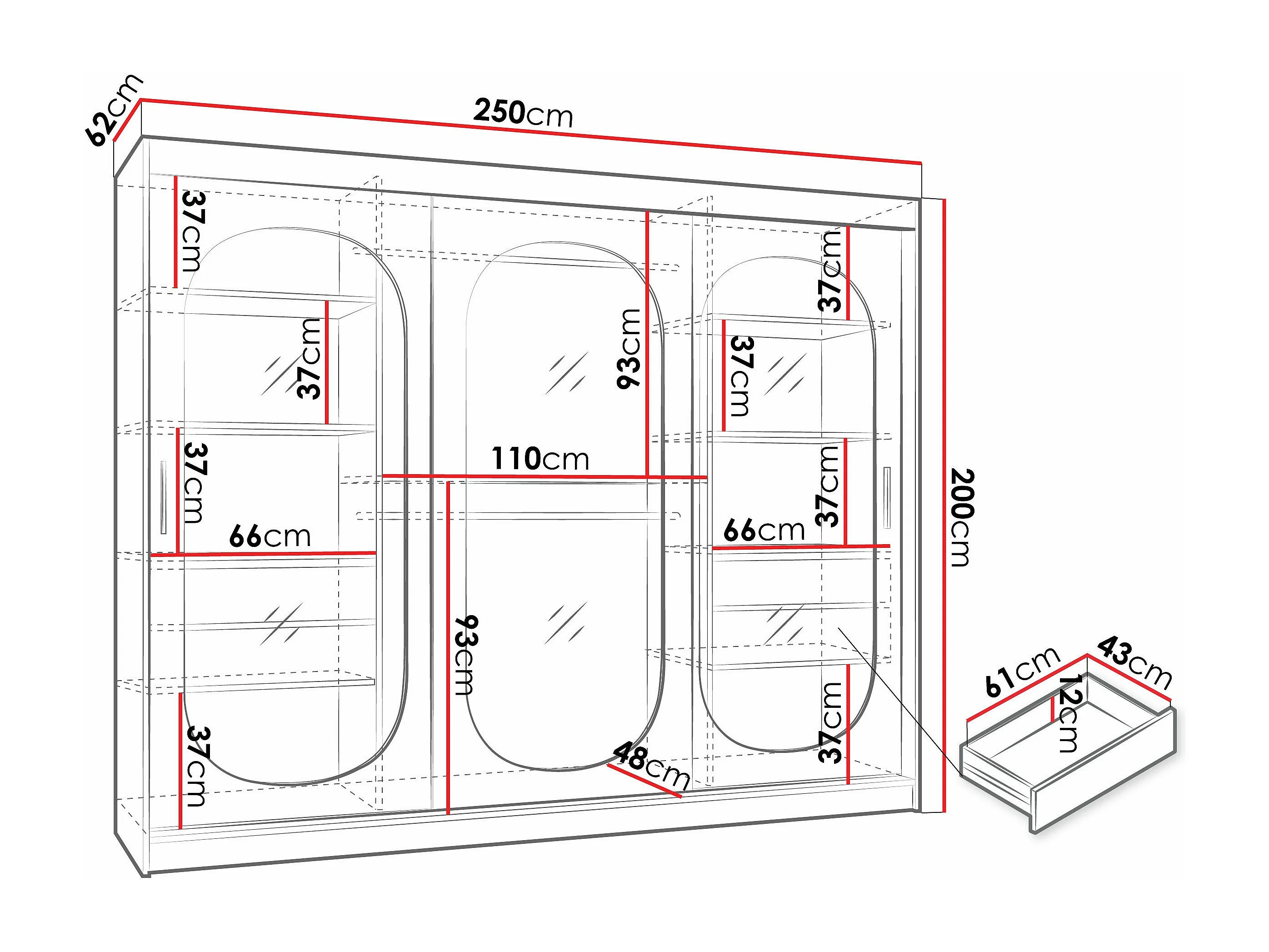 Armoire Hartford 522, Noir, 200x250x62cm, Portes d'armoire: Coulissantes