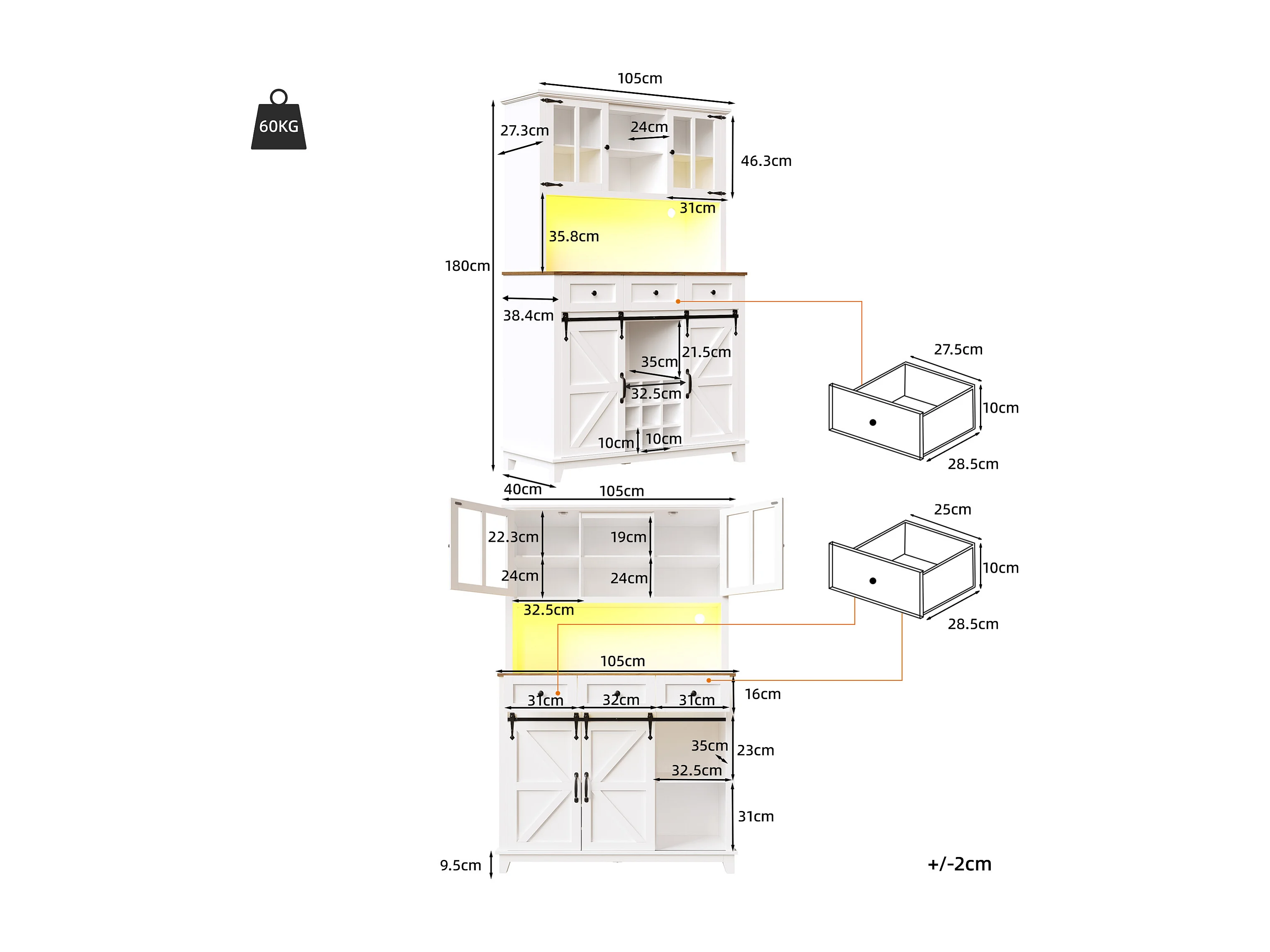 Armoire haute 105×38,4×180cm, Buffet, Vitrine, Étagères réglables, Sideboard LED, Lumière variable, Blanc