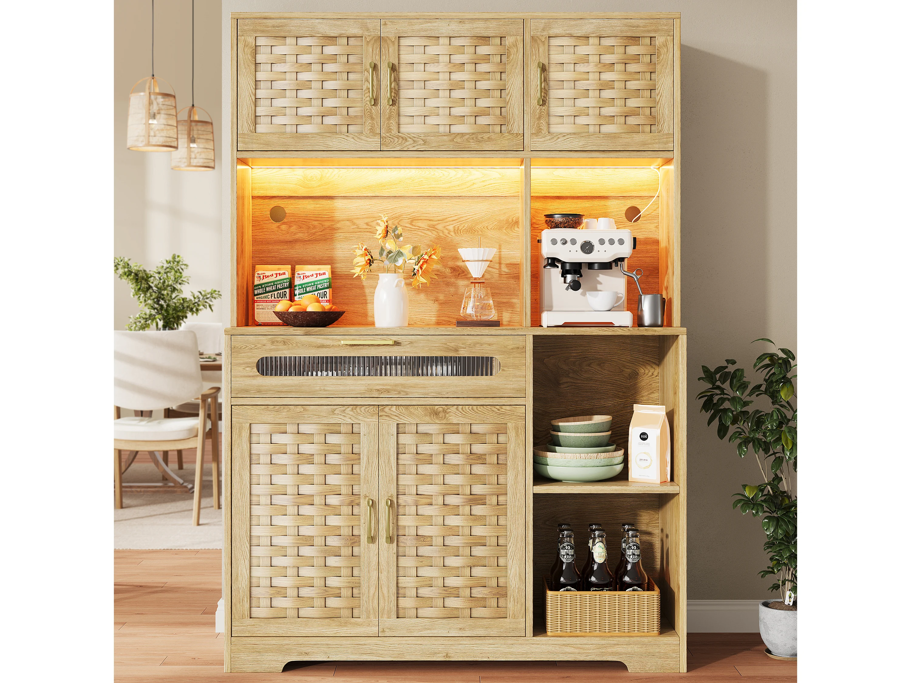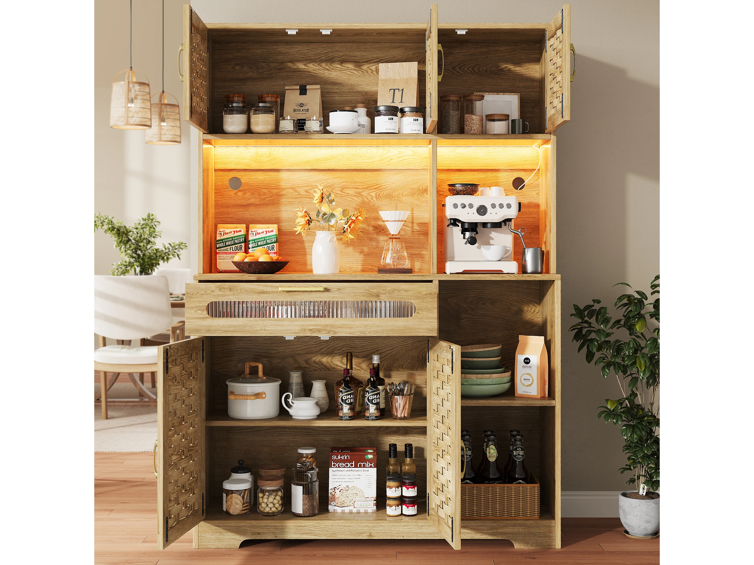 Armoire haute 120×40×180cm, Buffet de salon, Portes tissées MDF, LED, tiroirs, Rangement pour cuisine, salle à manger ou bar