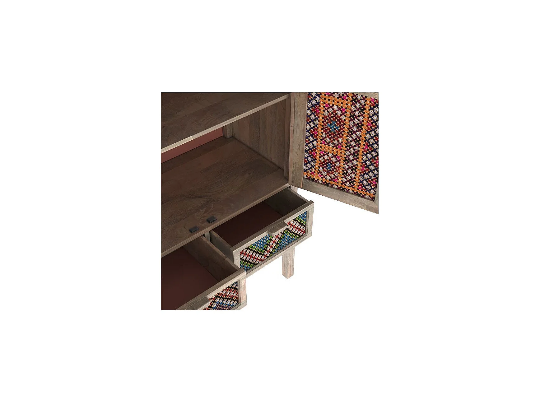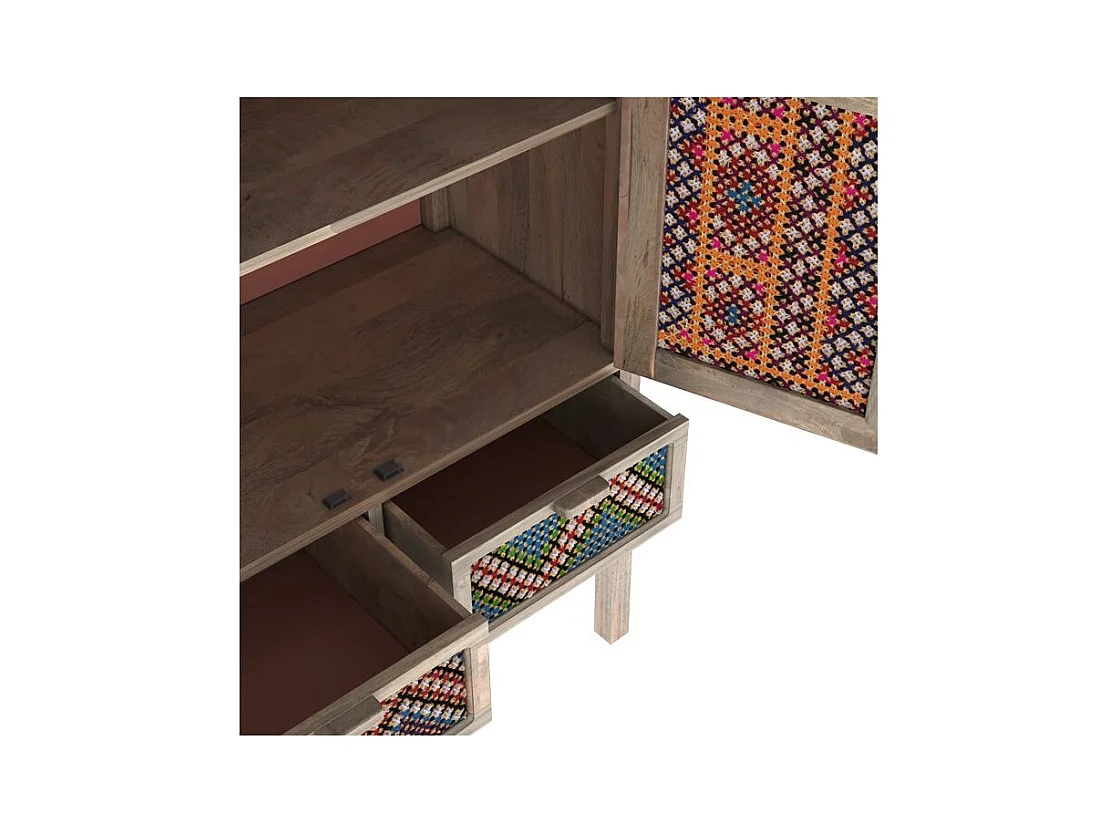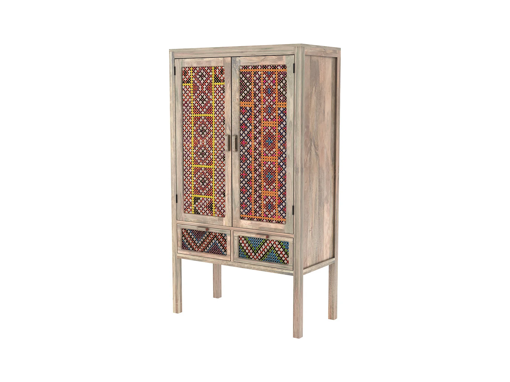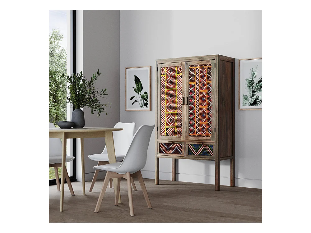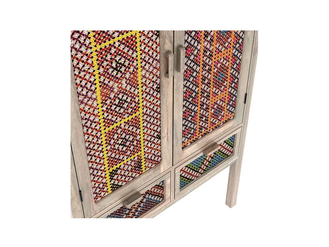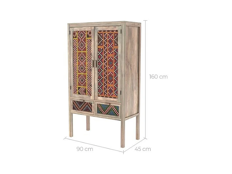 Armoire 2 portes 2 tiroirs en manguier et cannage coloré - Massaï