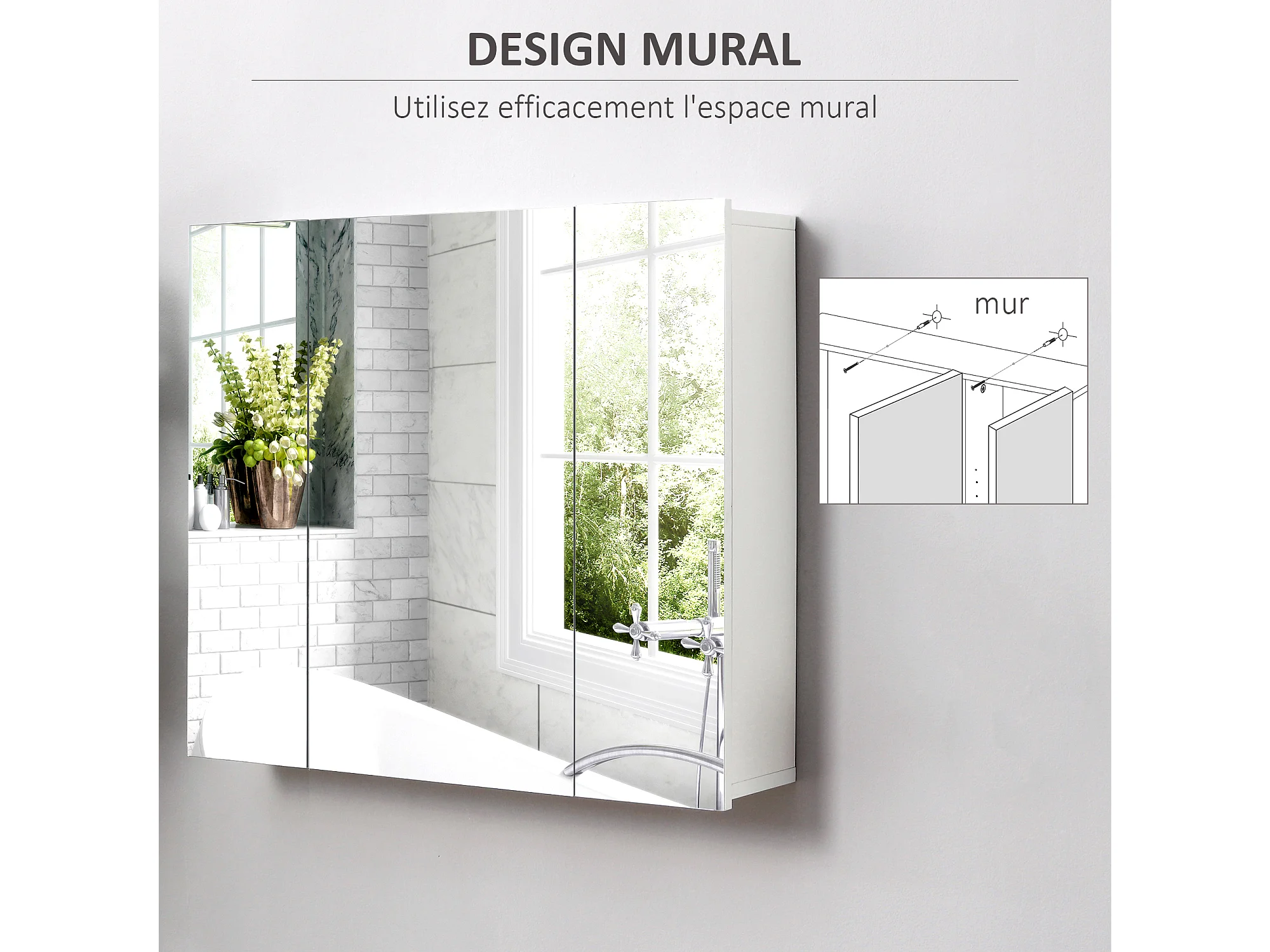 Armoire miroir de salle de bain armoire murale 3 portes 2 étagères dim. 70L x 15l x 60H cm MDF blanc