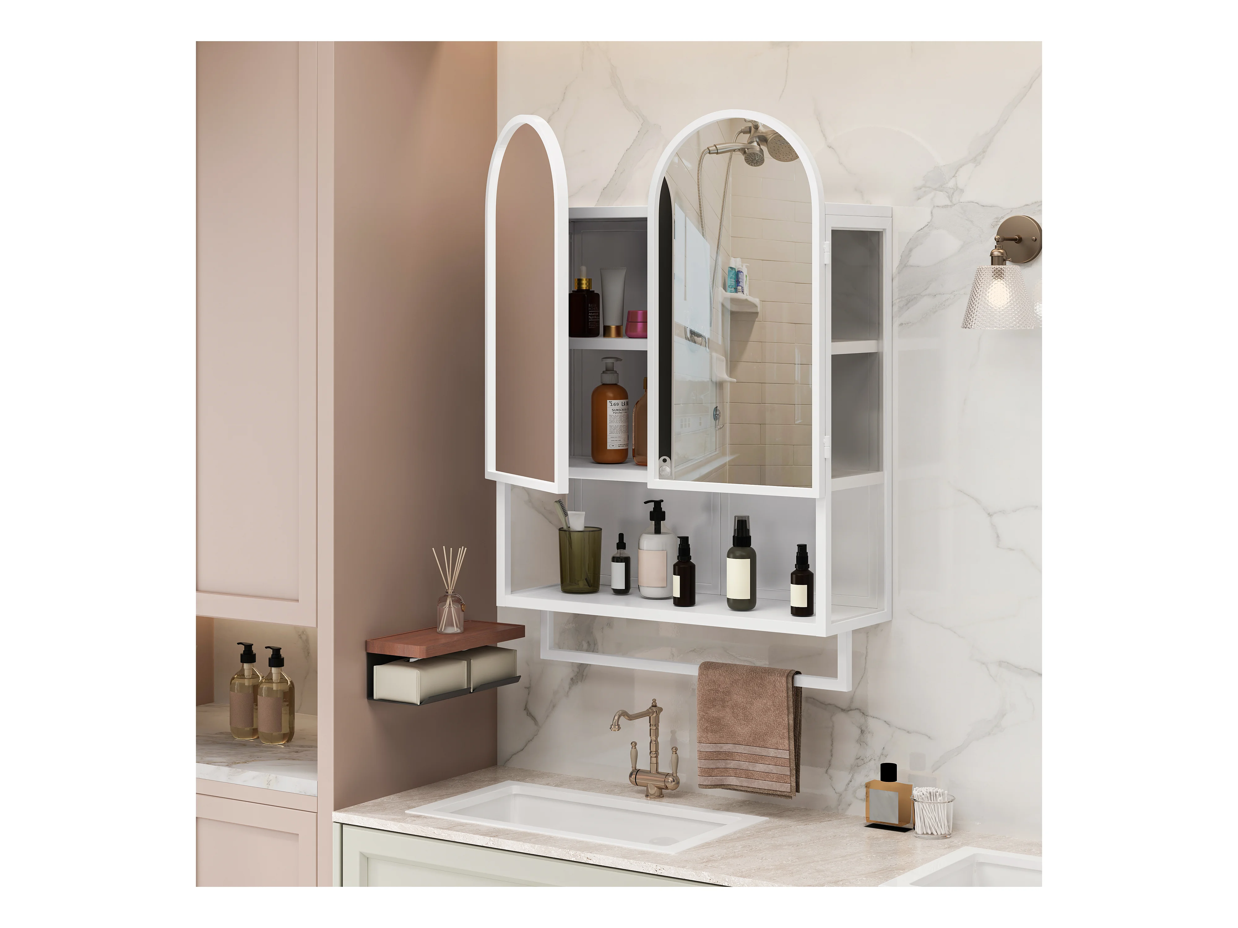 Armoire miroir moderne à double arche, 2 portes avec étagères réglables et porte-serviettes, métal et verre trempé, blanc (60x20x75cm)