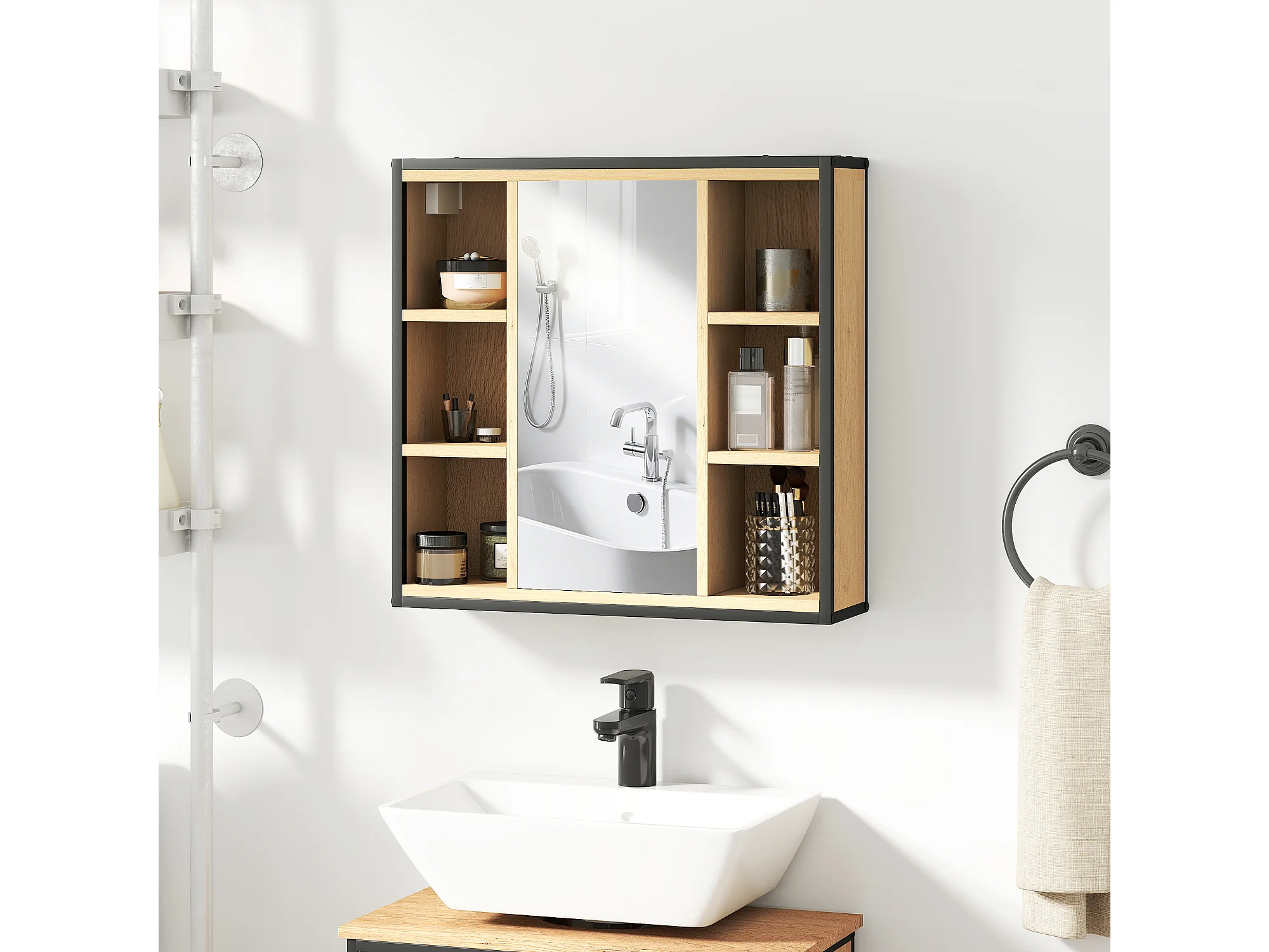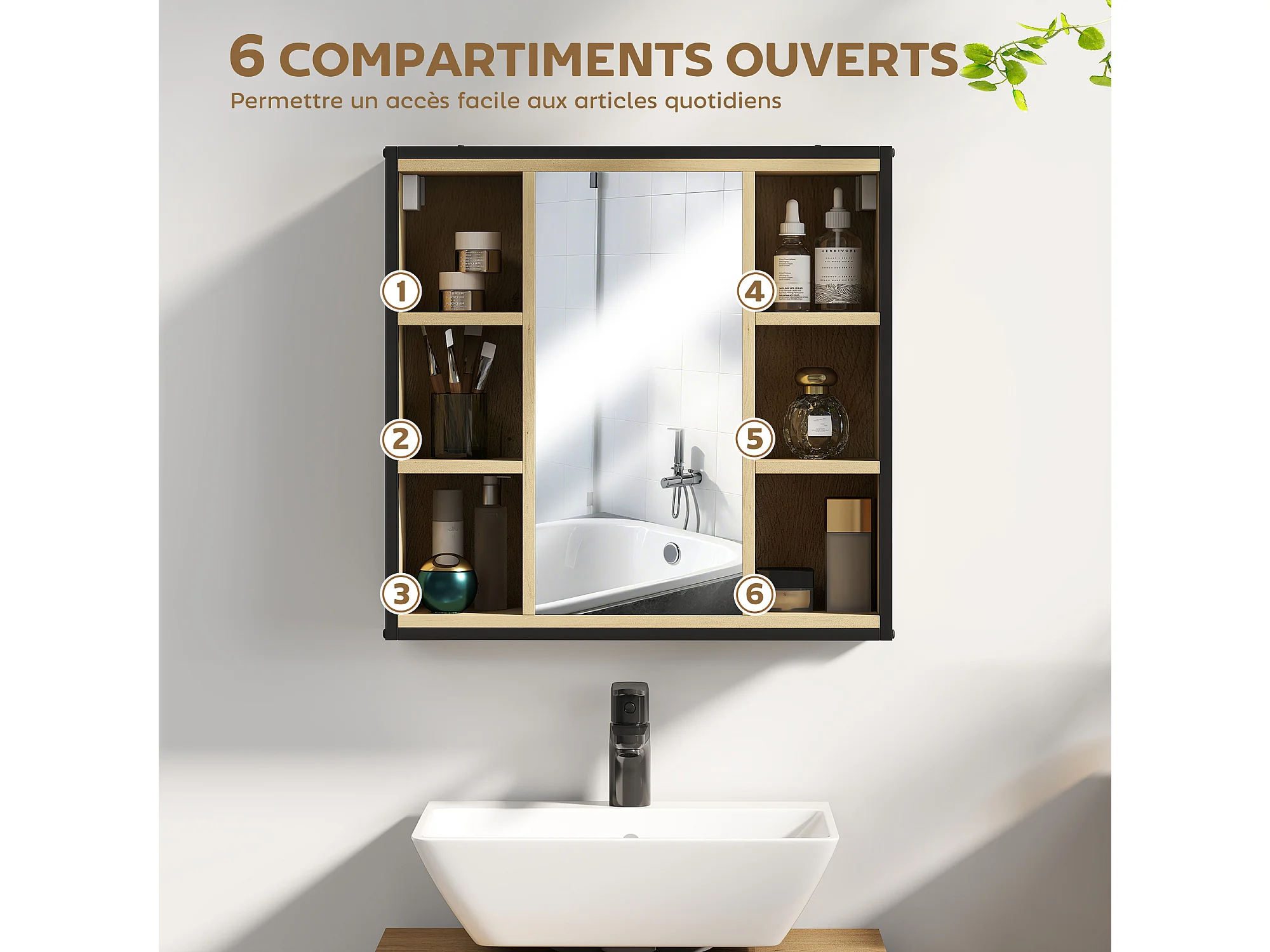 Armoire miroir murale salle de bain - 6 niches, porte, étagère - acier noir effet bois