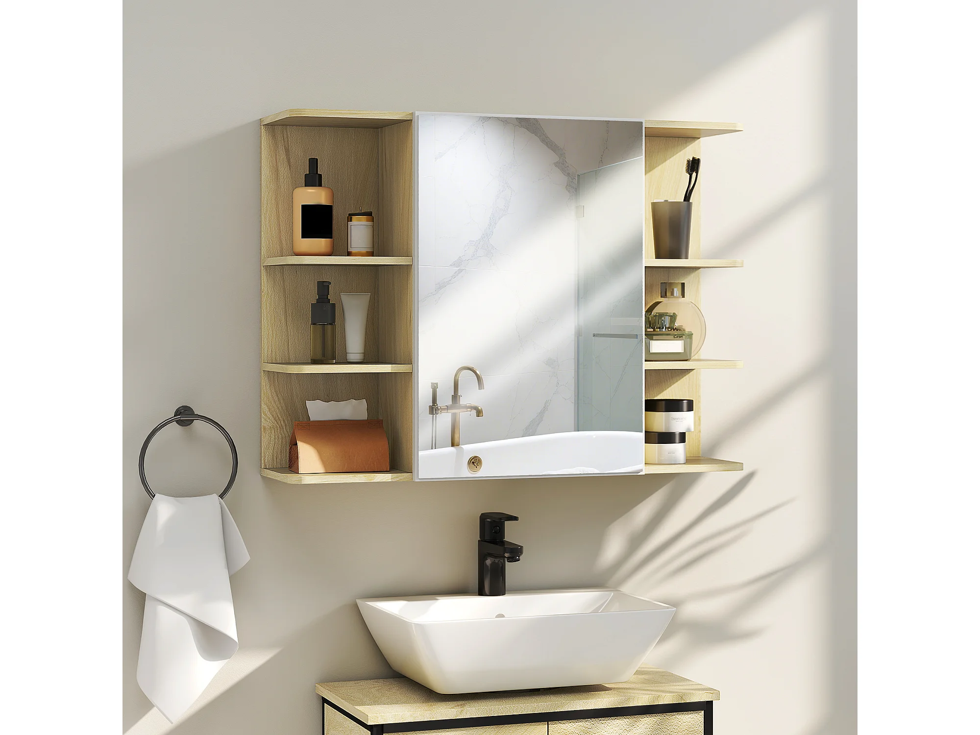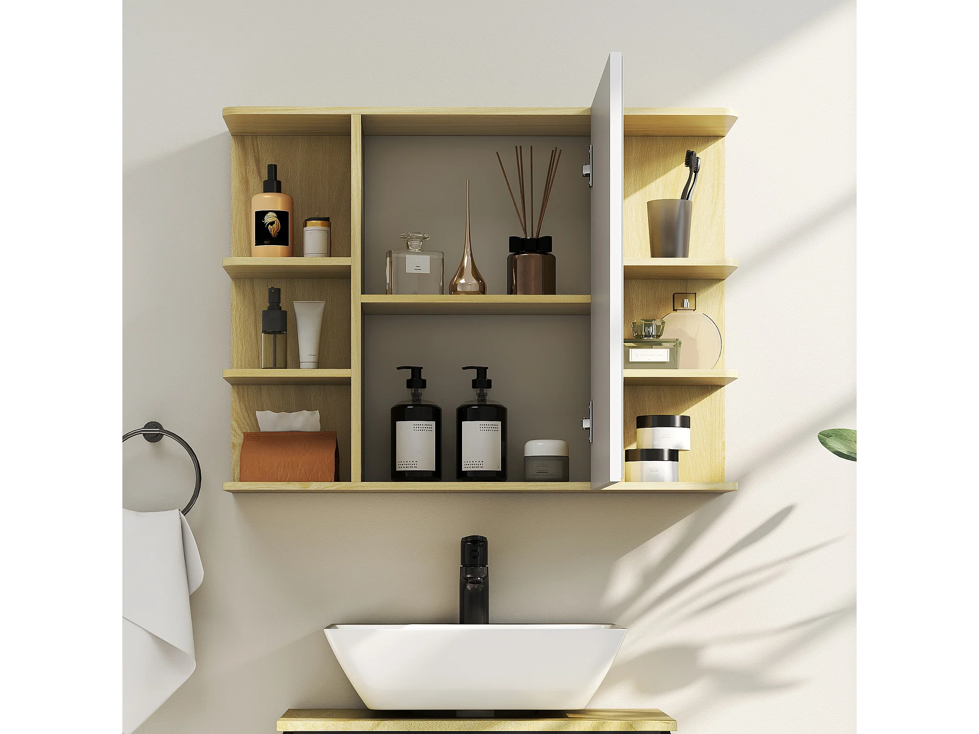 Armoire miroir murale salle de bain - porte, étagère, 2x3 tablettes latérales - 80 x 20 x 59 cm - effet bois clair
