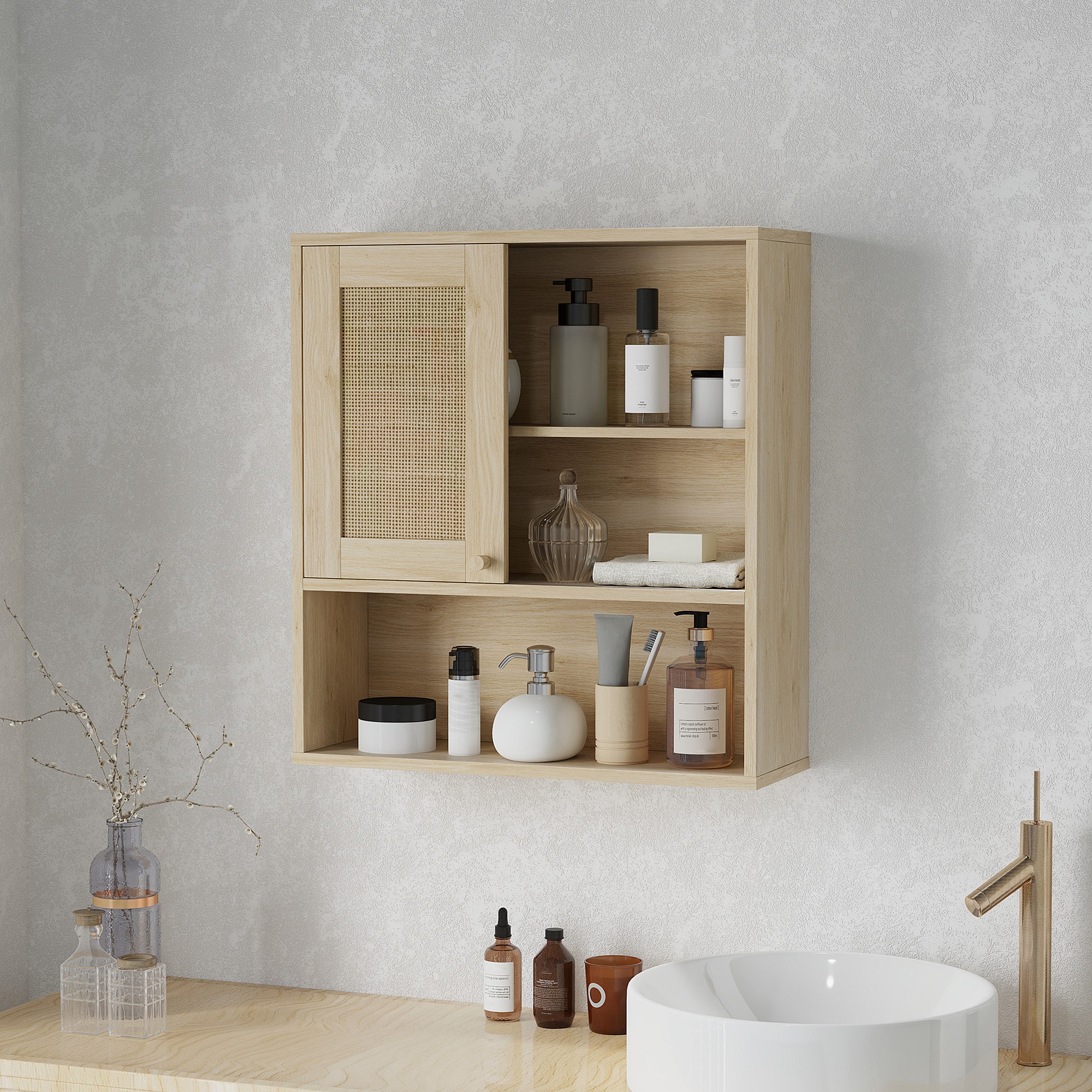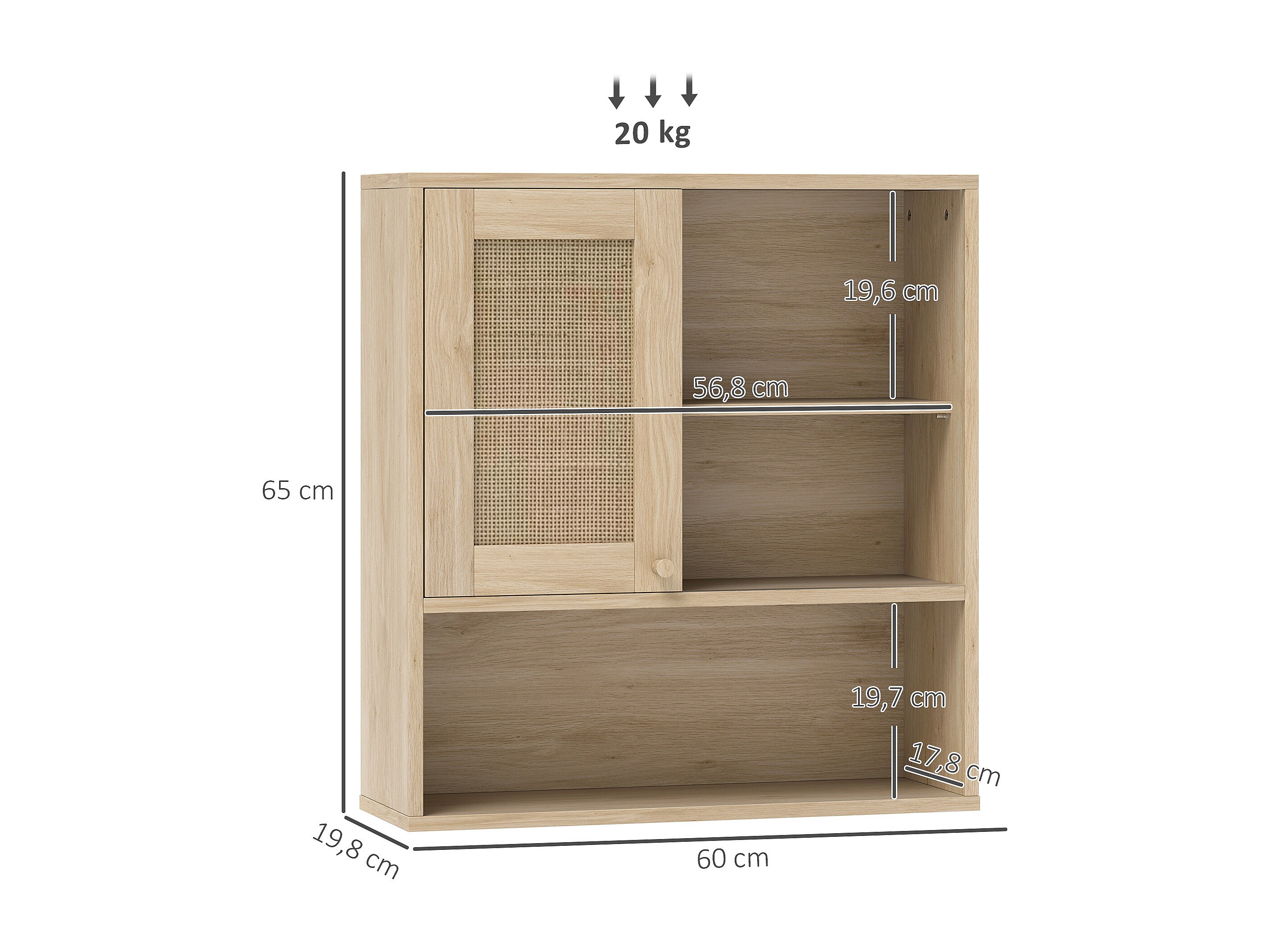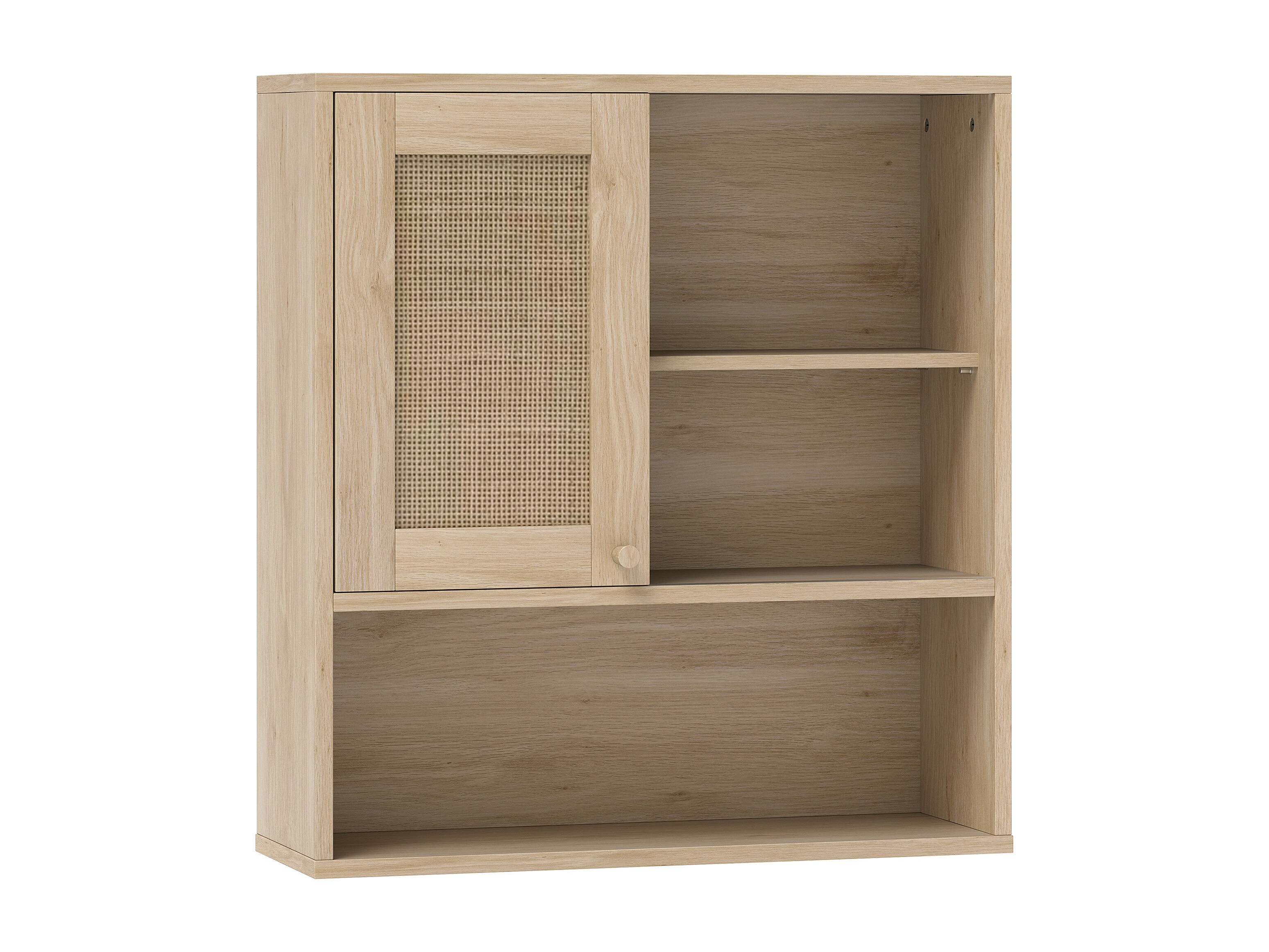 Armoire murale de salle de bain style cosy chic - porte coulissante rotin, étagère, niche - effet bois clair