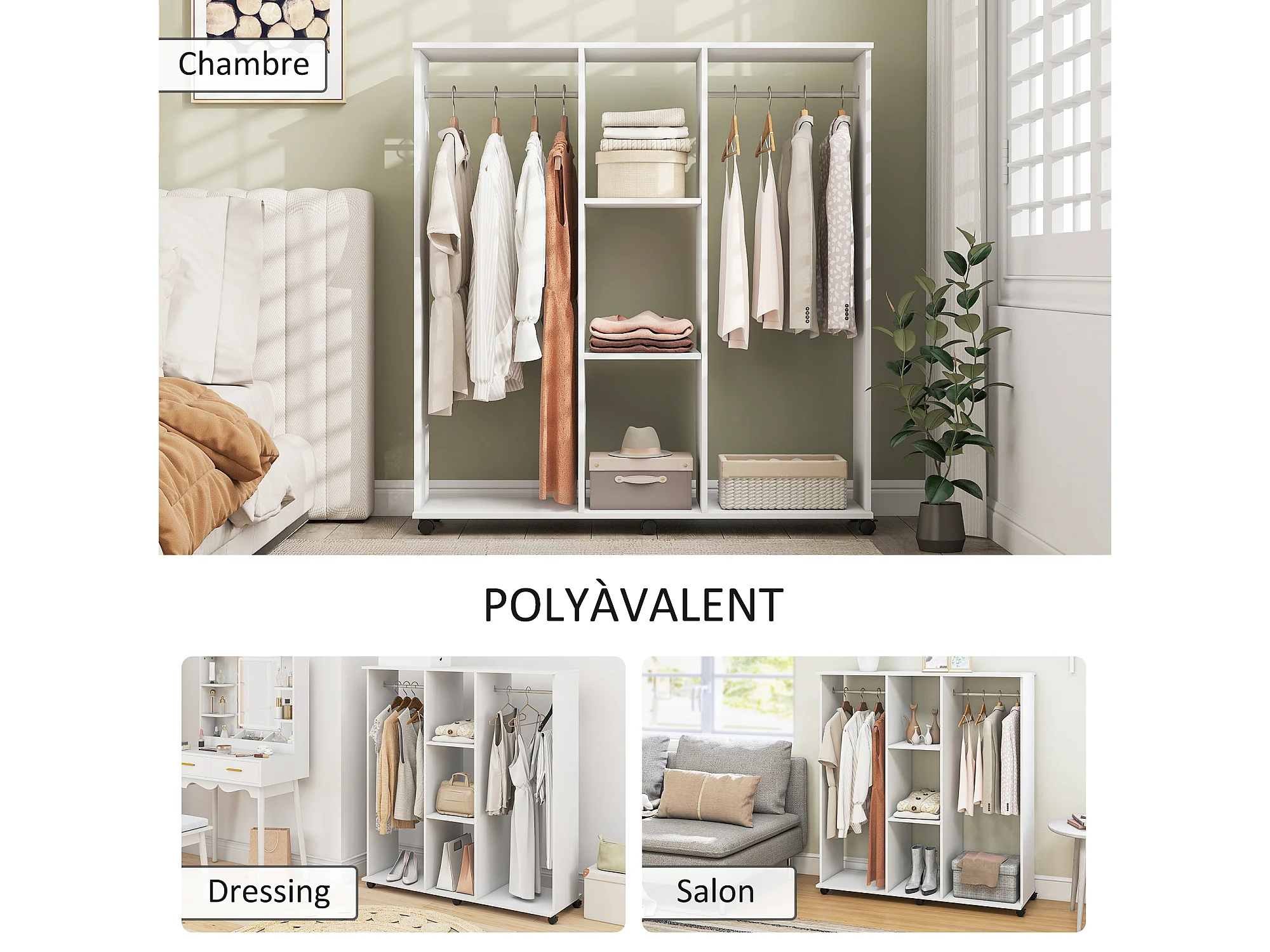 Armoire penderie Meuble de Rangement Mobile 6 roulettes 120L x 40l x 128H cm en bois Blanc