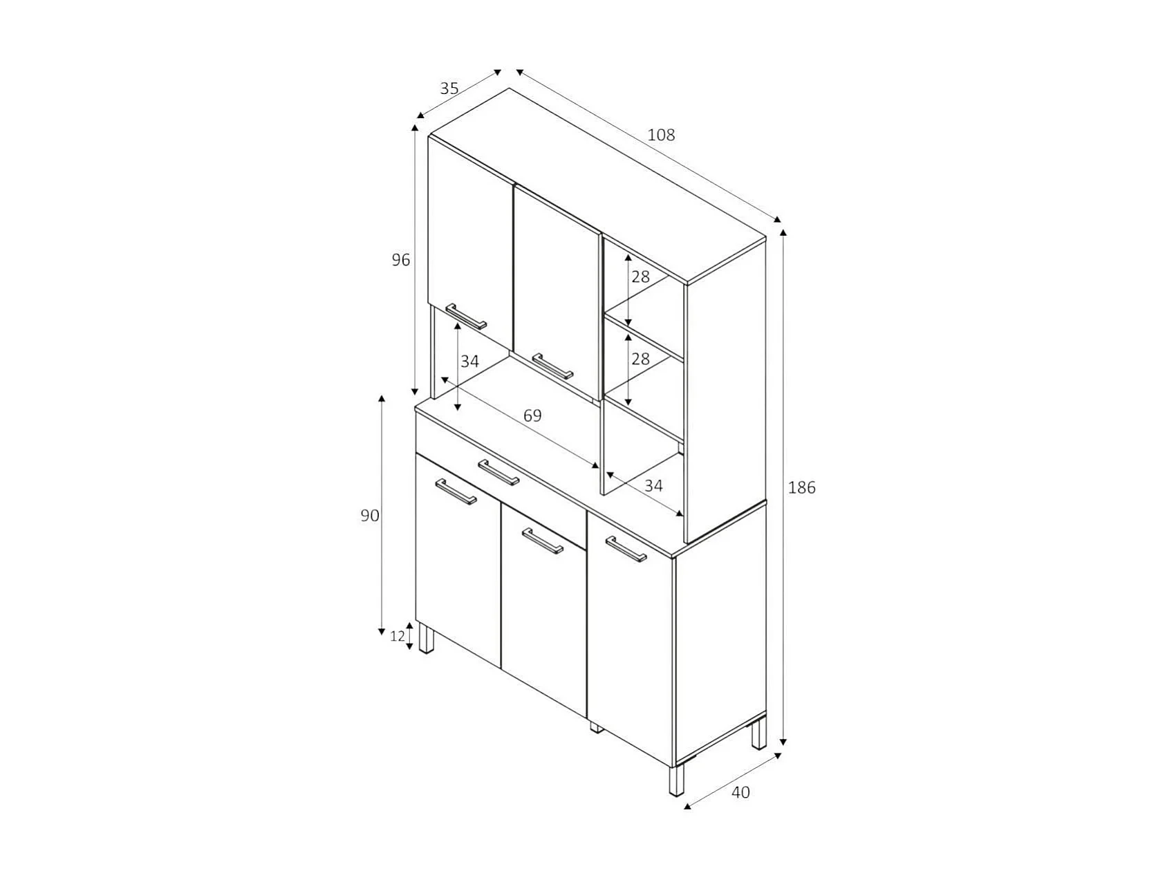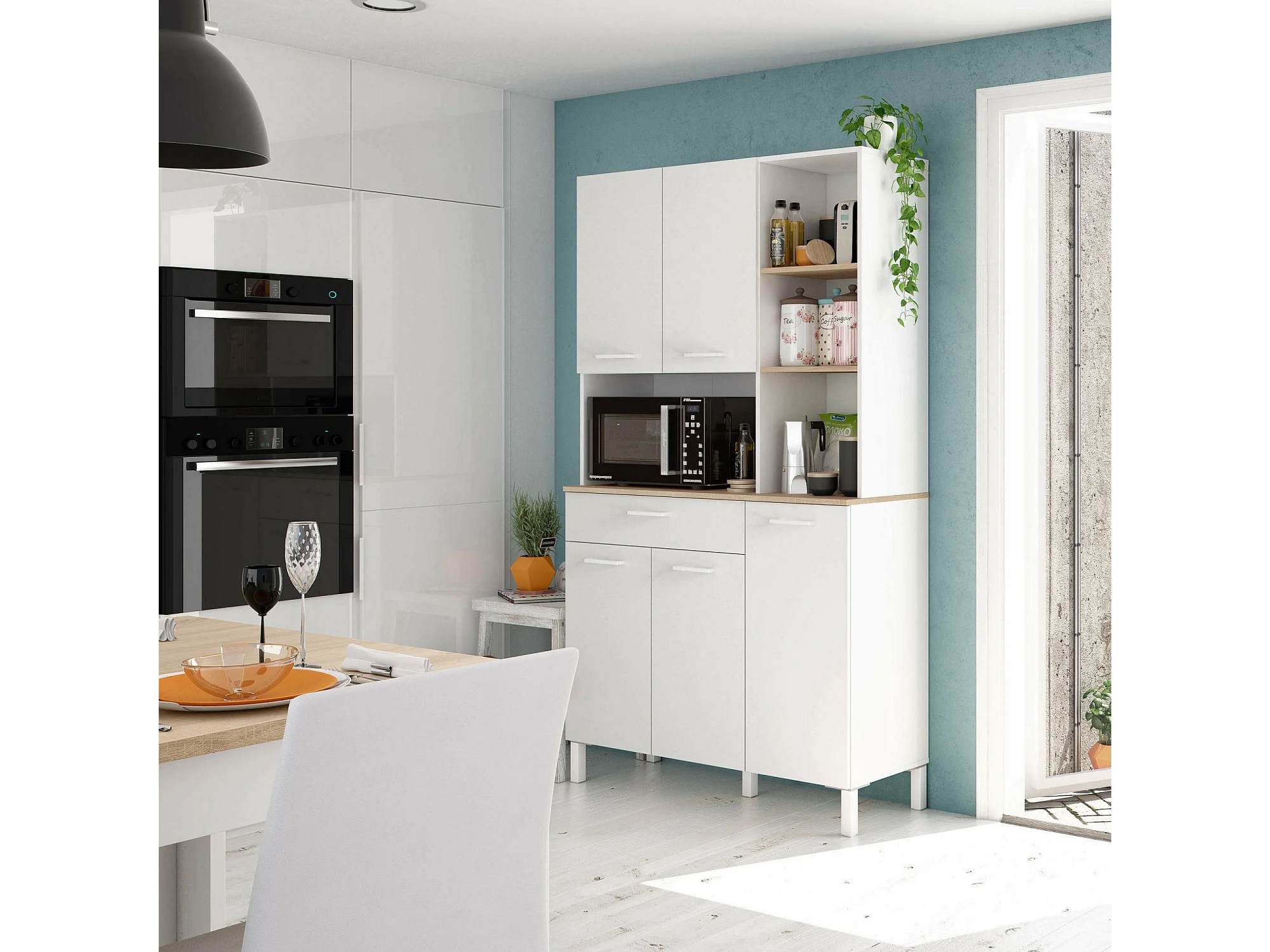 Armoire polyvalente Laredo, Armoire auxiliaire de cuisine, Buffet avec 5 portes et 1 tiroir avec étagères, Armoire ouverte, 108x40h186 cm, Blanc et Chêne